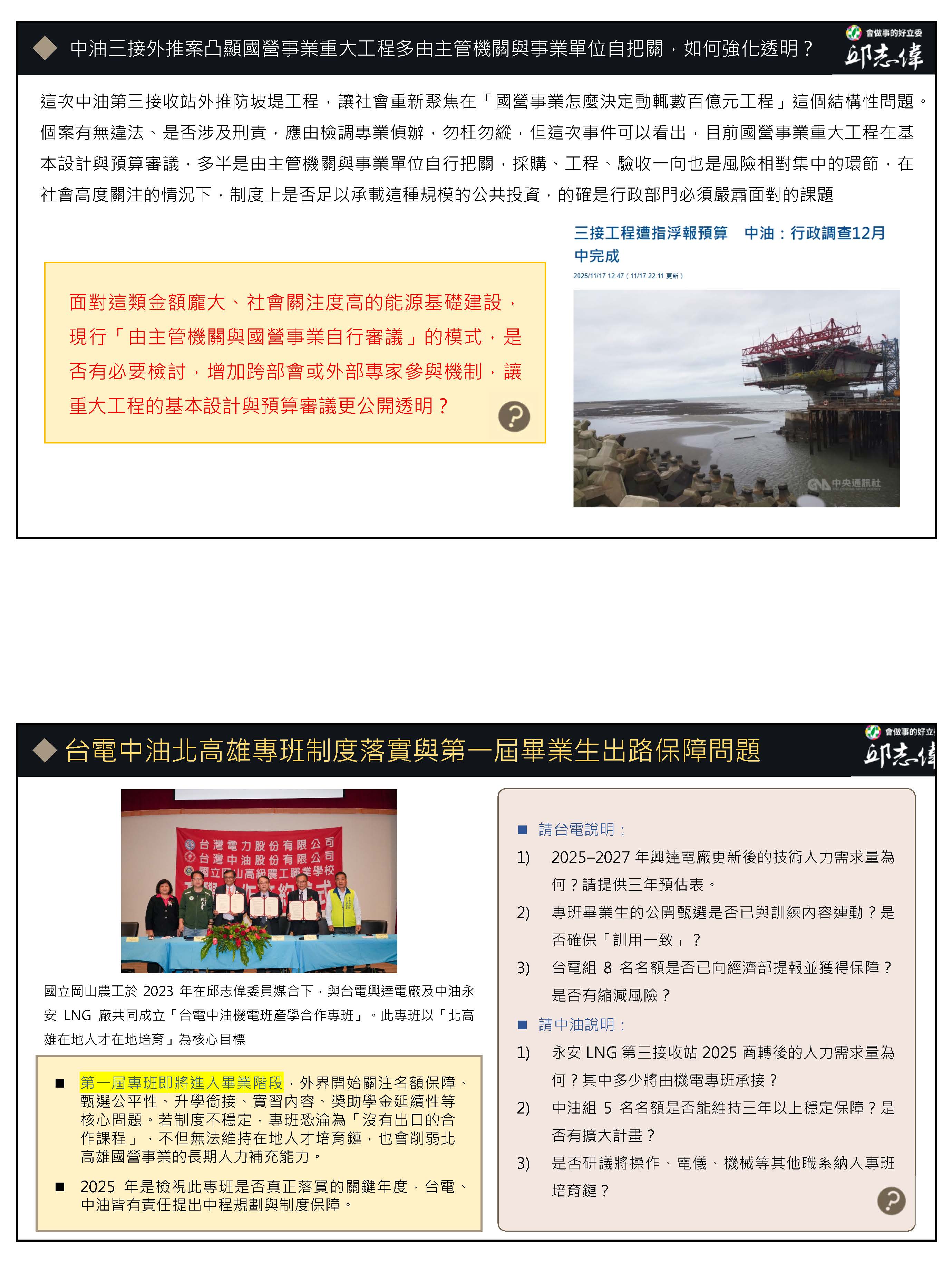 再者,本席也翻閱了一下中油111年和112年的法定預算書,111年第三座液化天然氣接收站投資計畫的總預算為660億,後續因為「三接外推方案」,所以新增了「觀塘接收站外推方案之外廓防波堤新建工程」、「棧橋延伸段工程」、「製程設備及管線工程」三項新計畫,所以預算增加到965億,然而尷尬的事情發生了,明明新增的預算編列在112年度,結果根據中油的書面報告,這三項計畫居然在111年7月29日就已經決標,請問一下經濟部,未經過立法院通過的預算,中油是可以先行動支的嗎?難道立法院的預算審議程序只是走走過場?