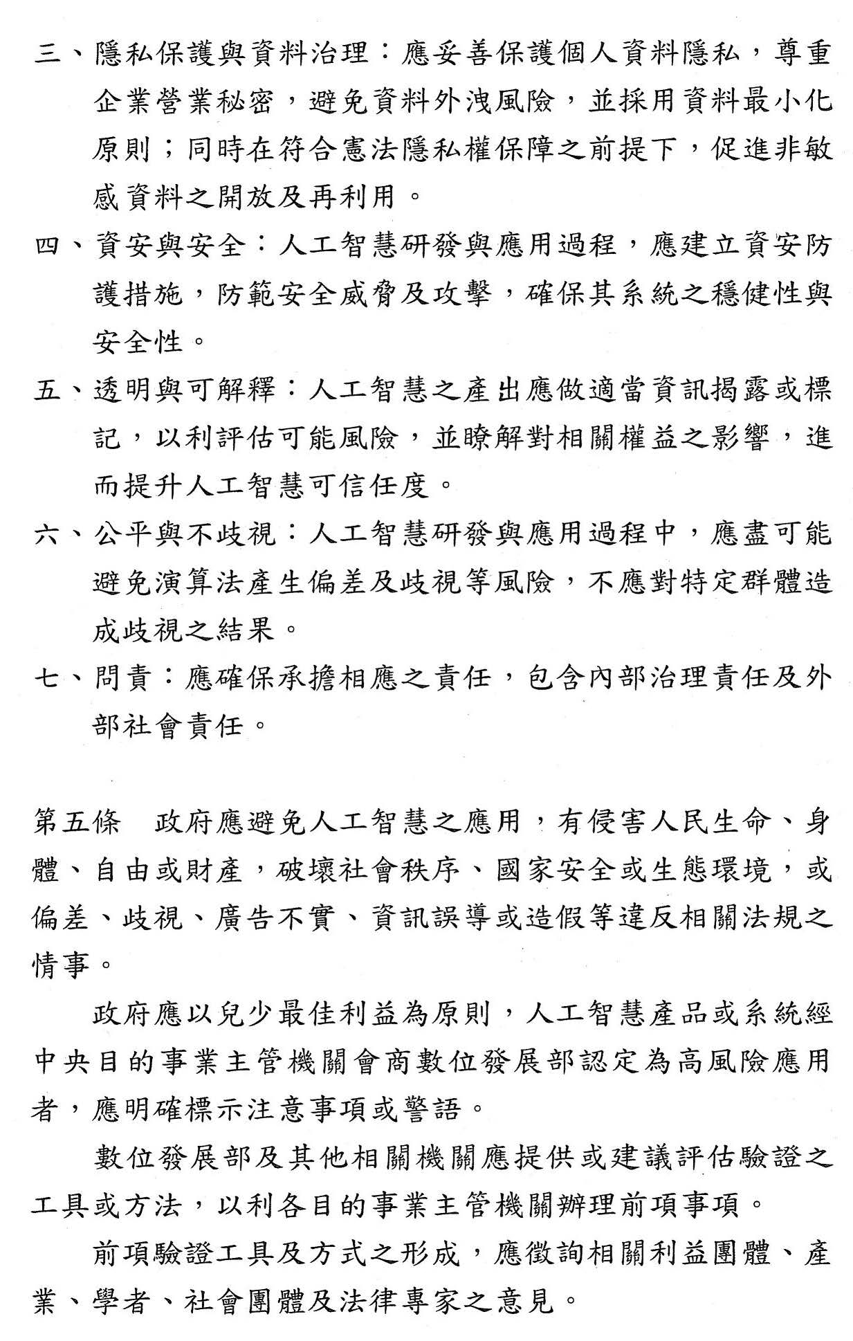 第三條 人工智慧之研發、應用與監管,應在兼顧社會公益與數位平權之前提下,發展良善治理,並遵循下列原則: 一、永續性:平衡社會公平與環境永續,提供適當的教育與培訓,縮小數位落差,協助國民適應人工智慧帶來的變革。 二、人類自主性:支持人類自主權,尊重人格權及其他基本權利,維護文化價值,允許人類監督,並落實法治與民主價值觀。 三、隱私保護與資料治理:妥善保護個人資料隱私、尊重企業營業秘密、避免資料外洩風險,並應盡可能於適當情形採用資料最小化原則;同時促進非敏感資料之開放及再利用。 四、安全性:人工智慧研發與應用過程,應建立資安防護措施,防範不實資訊、安全威脅及攻擊,確保其系統之穩健性與安全性。 五、透明與可解釋性:人工智慧之產出應在技術上可行的情形下,做適當資訊揭露或標記,以利評估可能風險,並瞭解對相關權益之影響,進而提升人工智慧可信任度。 六、公平性與反歧視:人工智慧之研發與應用,應致力防止演算法偏差與歧視風險,對特定群體造成偏見之結果應予以最小化。 七、合於規範標準:應符合國家標準或相關法規;未訂有國家標準或相關法規未規定者,依各目的事業主管機關所認定得採行之其他國家標準或國際標準。 八、可問責性:確保人工智慧研發與應用過程中不同角色承擔相應之責任,包含內部治理責任及外部社會責任。 |