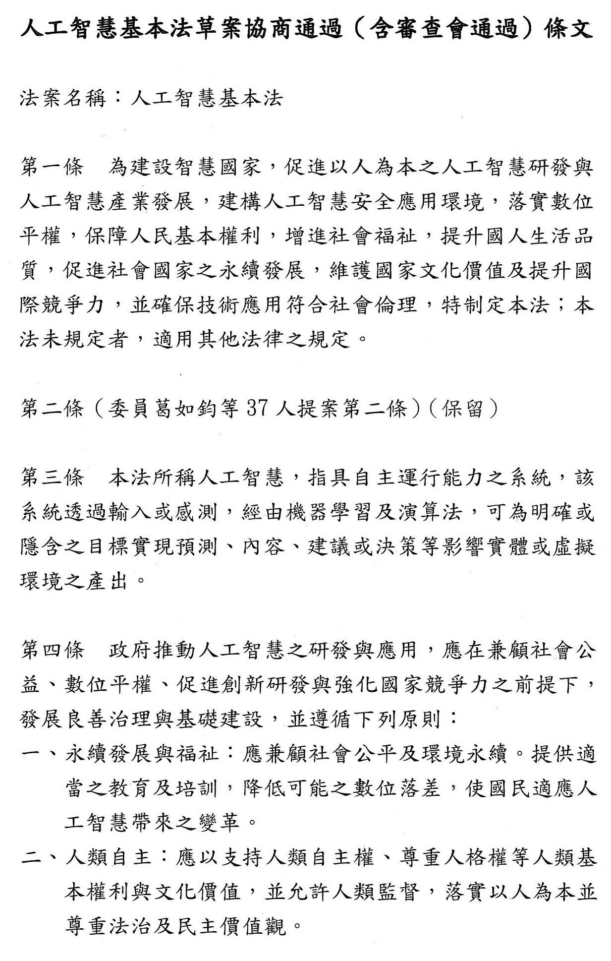 表決議題:人工智慧基本法草案第二條