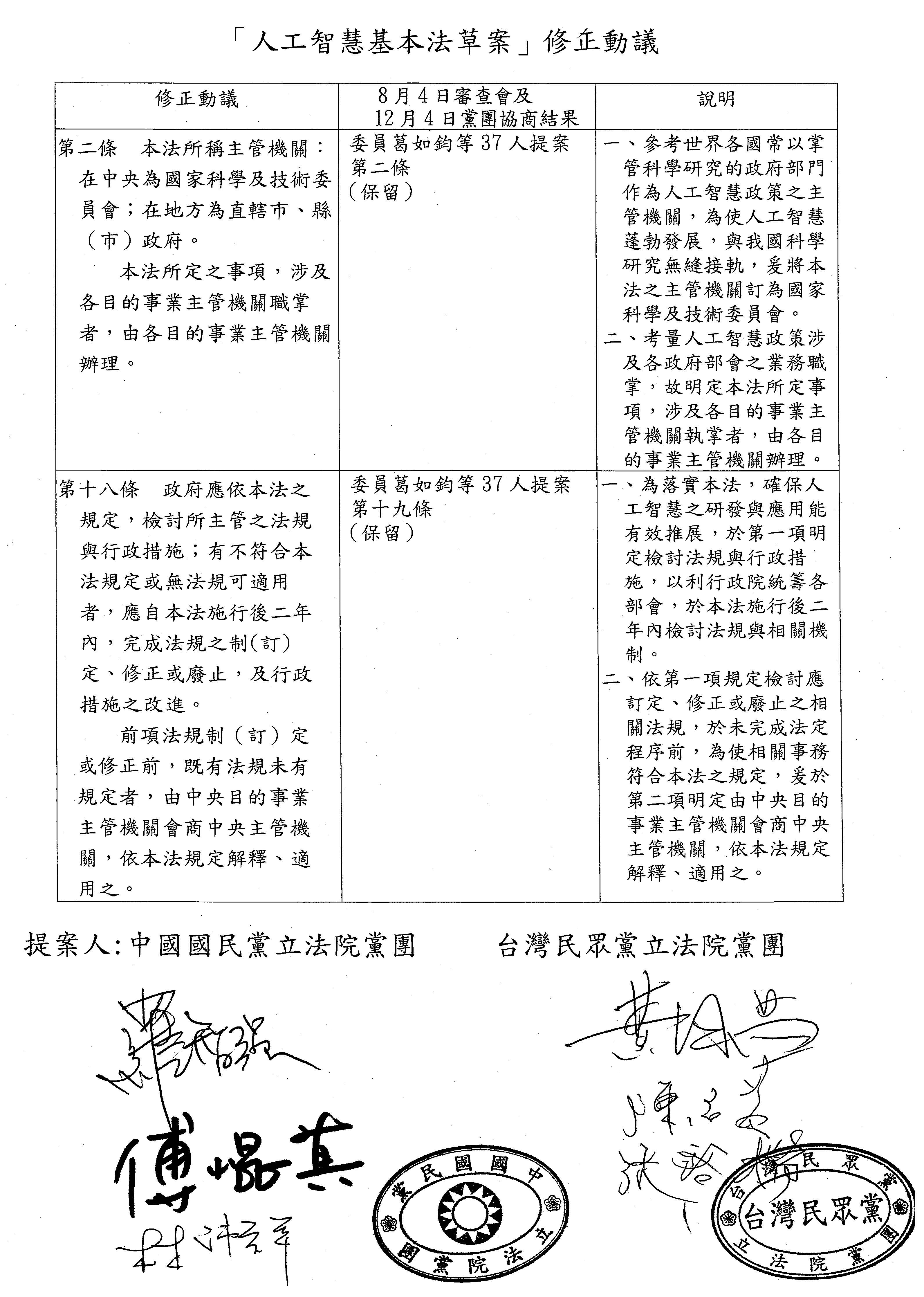 國民黨黨團、台灣民眾黨黨團共同修正動議提案:
