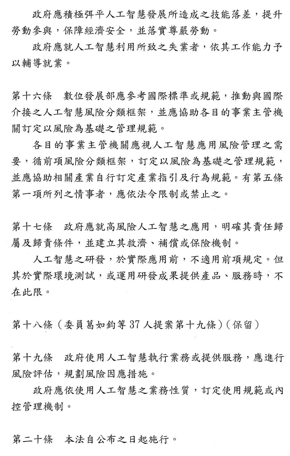第十七條 國家應積極運用人工智慧確保勞動者之勞動權益。 國家應積極弭平人工智慧發展所造成之技能落差,提升勞動參與,保障經濟安全,協助產業轉型,並落實尊嚴勞動。 |