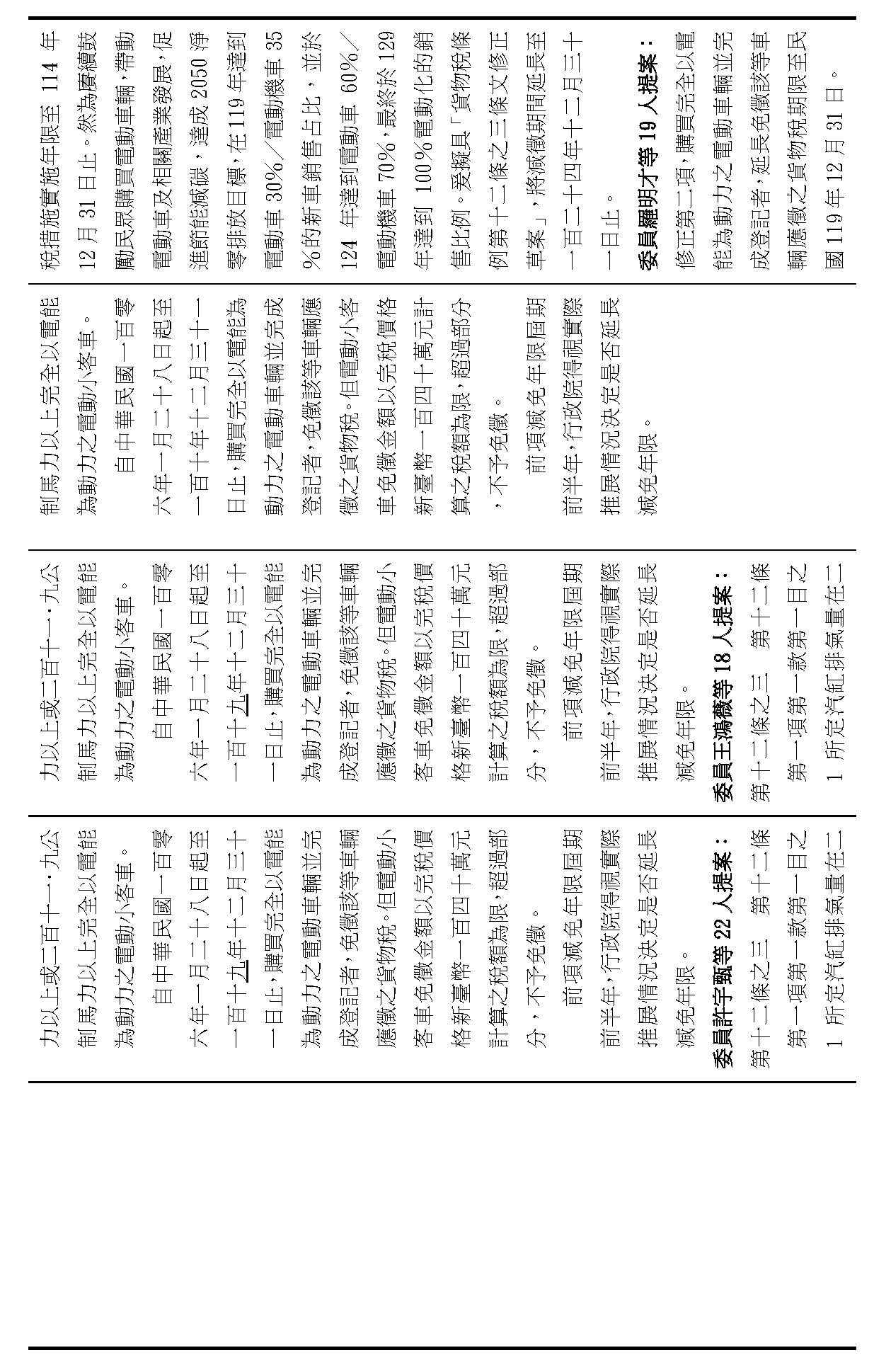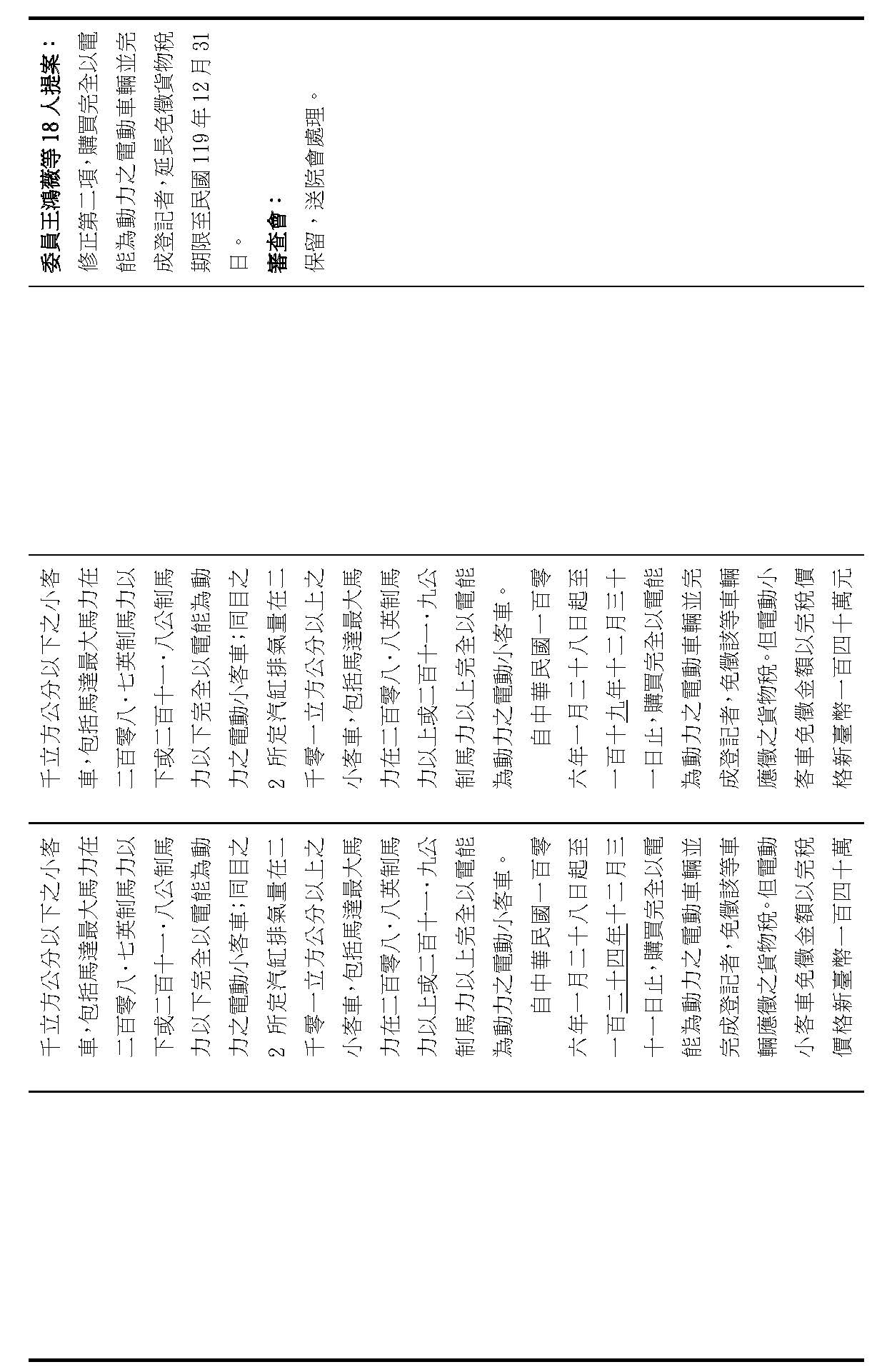(十九)本院委員廖偉翔等16人擬具「貨物稅條例第十二條之三條文修正草案」,請審議案。