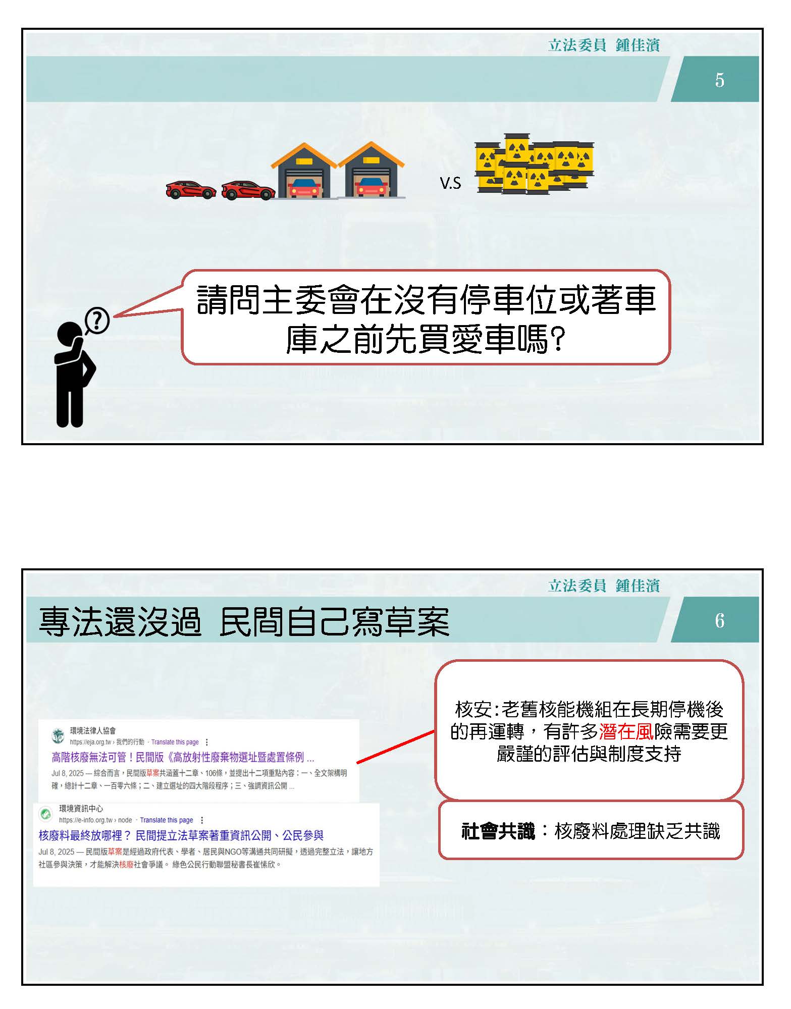 翁委員曉玲:這應該不是屬於核安會。這個部分會不會也會產生問題?而且我們不管在環境評估的相關法規等等,是不是應該要趕快做法制上面的準備?甚至你們核安會都要提案,我不知道主委知不知道我有提電業法的修正案?