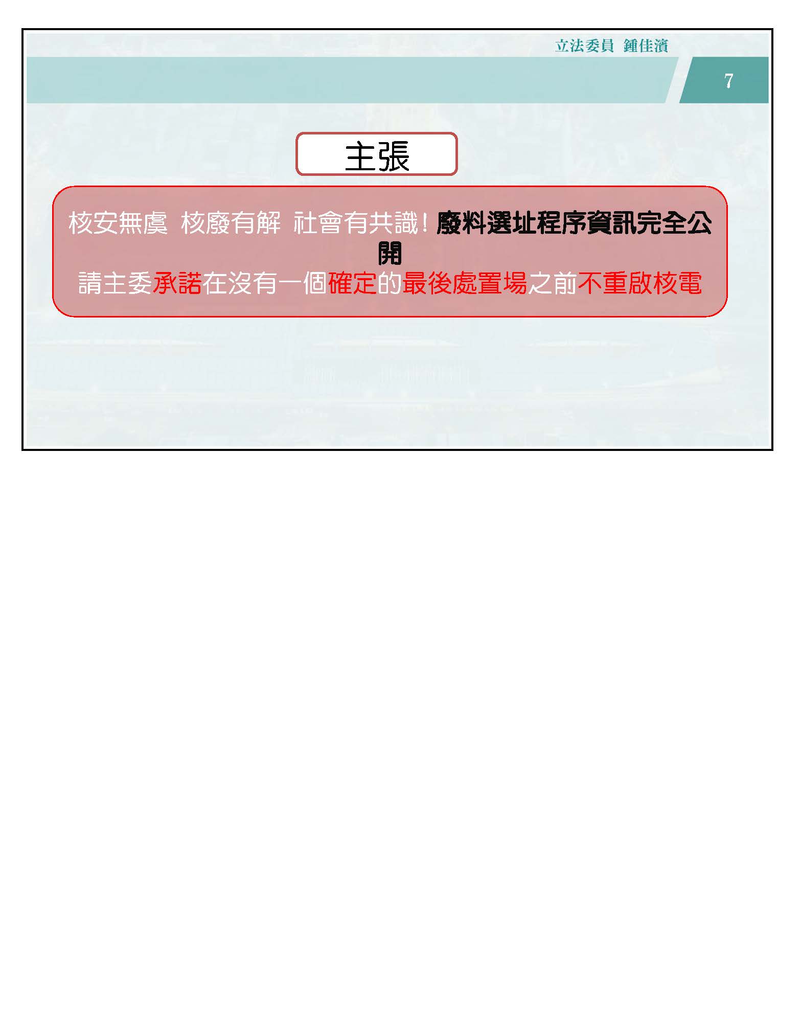 陳主任委員明真:經濟部已設有核廢料的專責處理機構,負責這方面的……