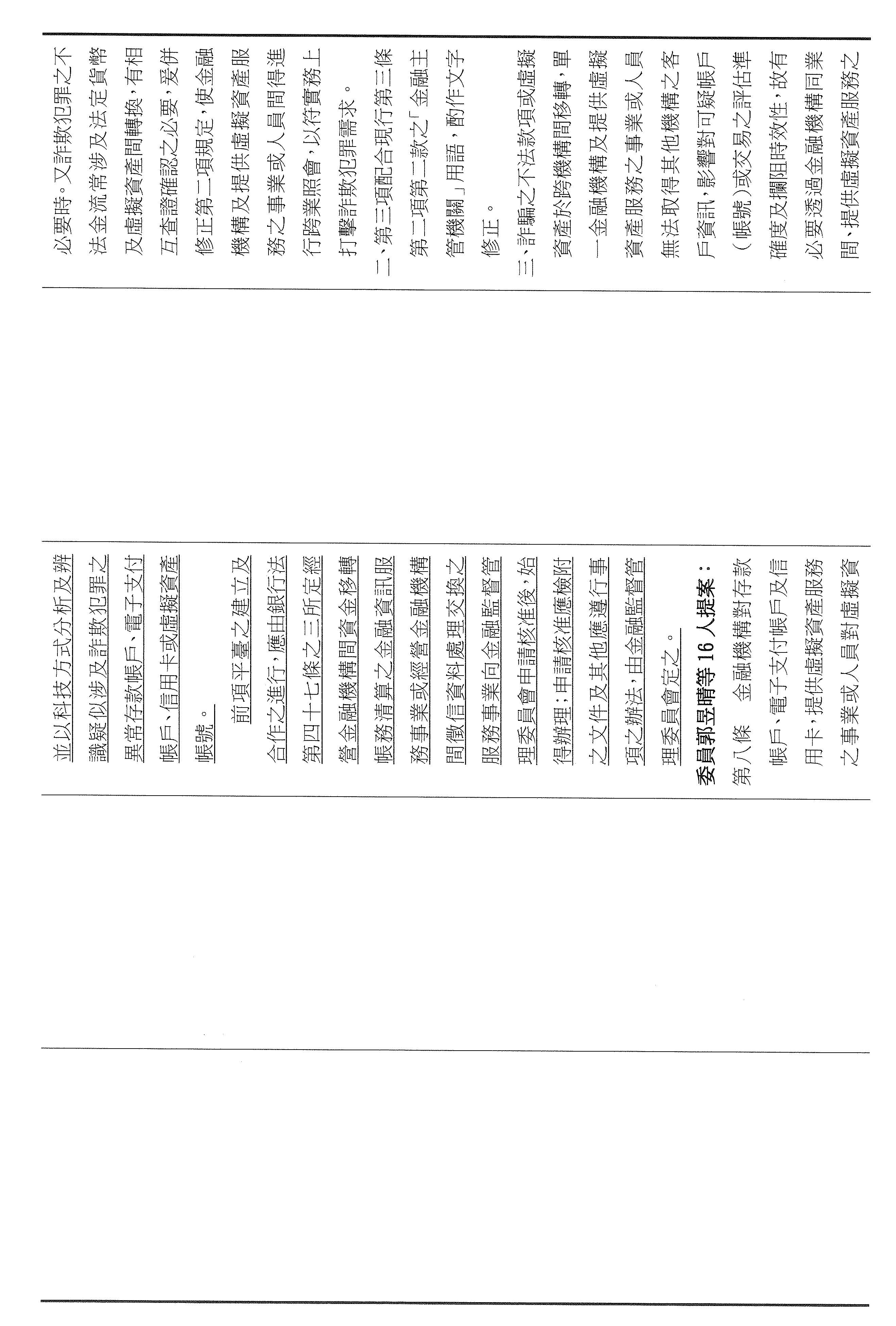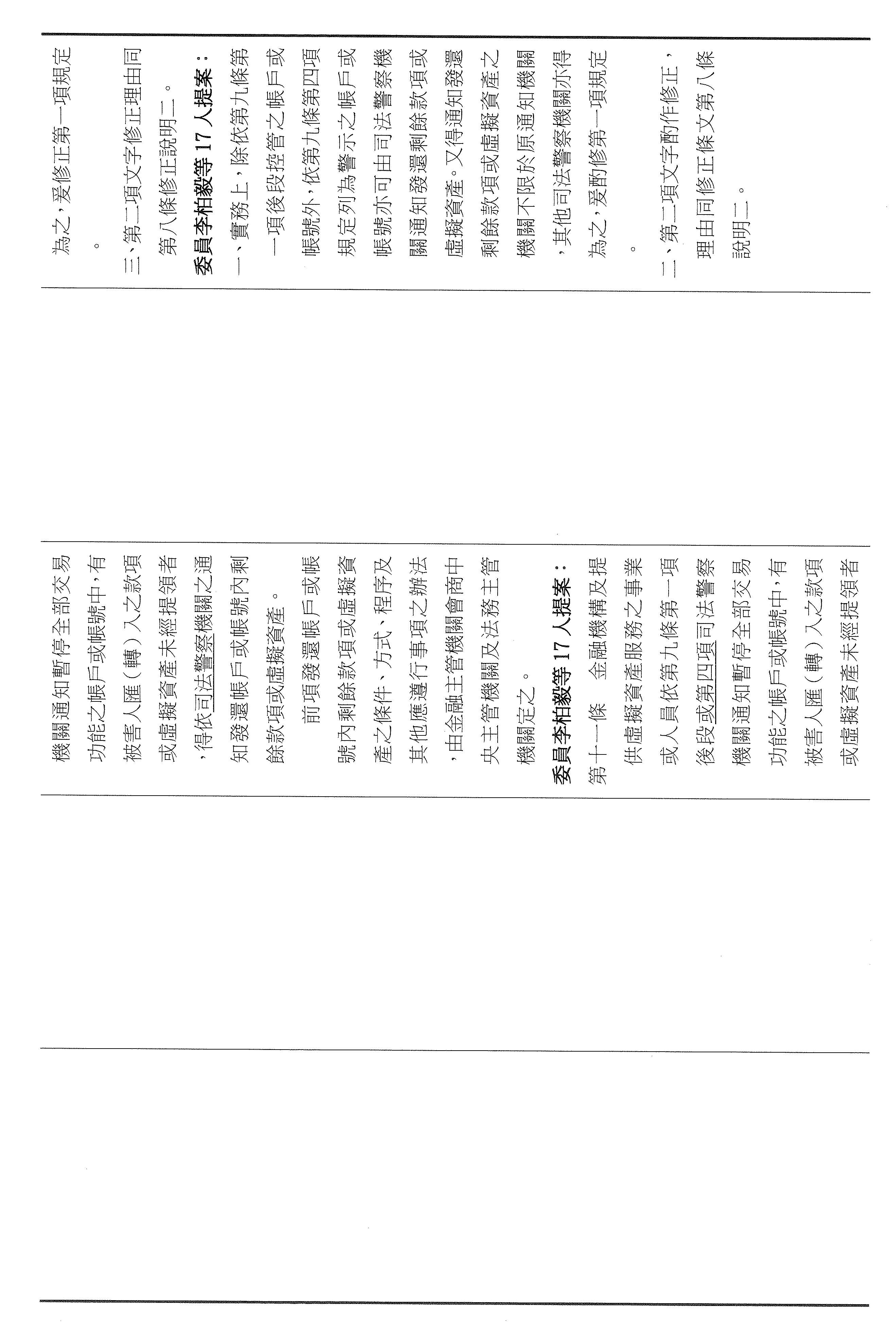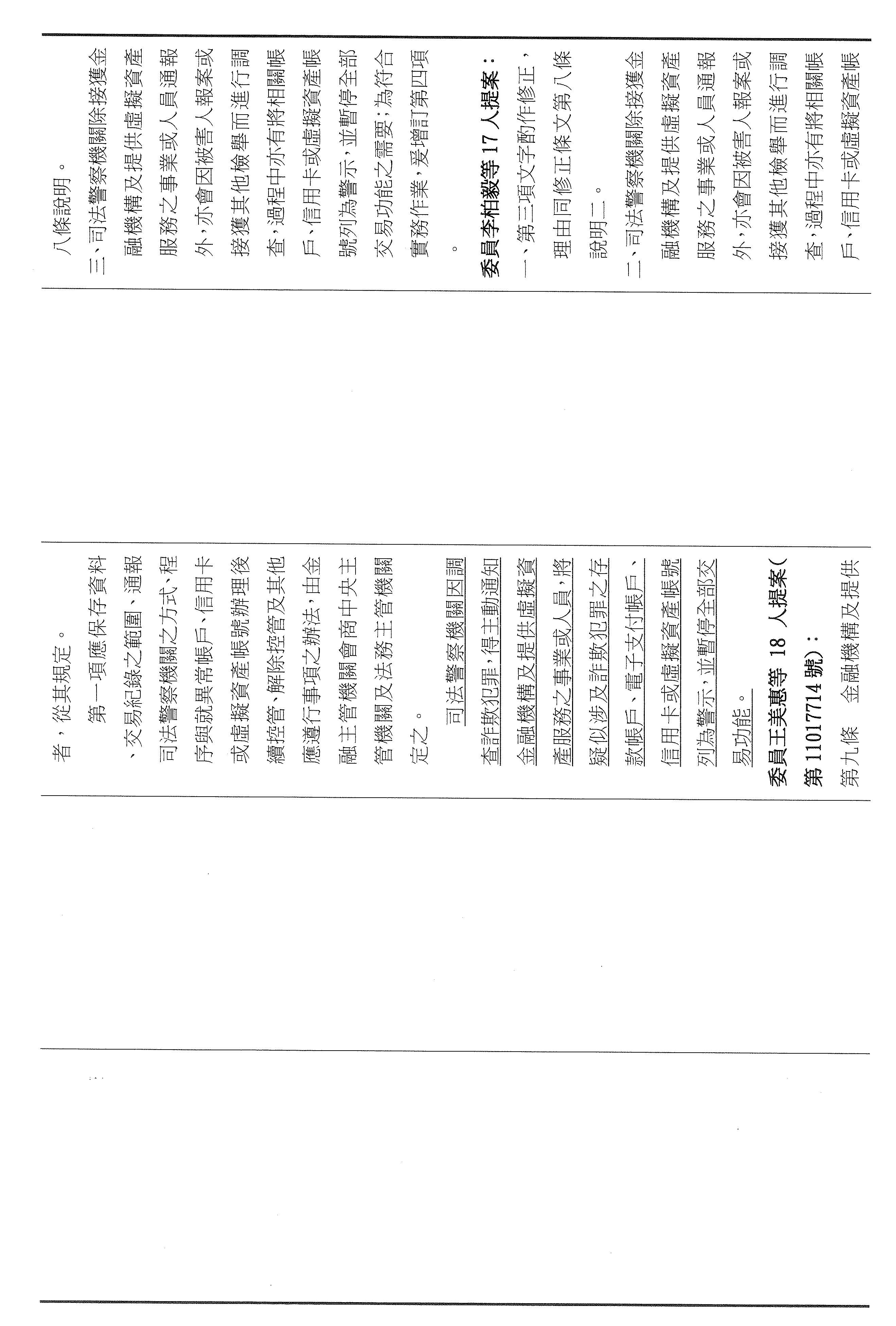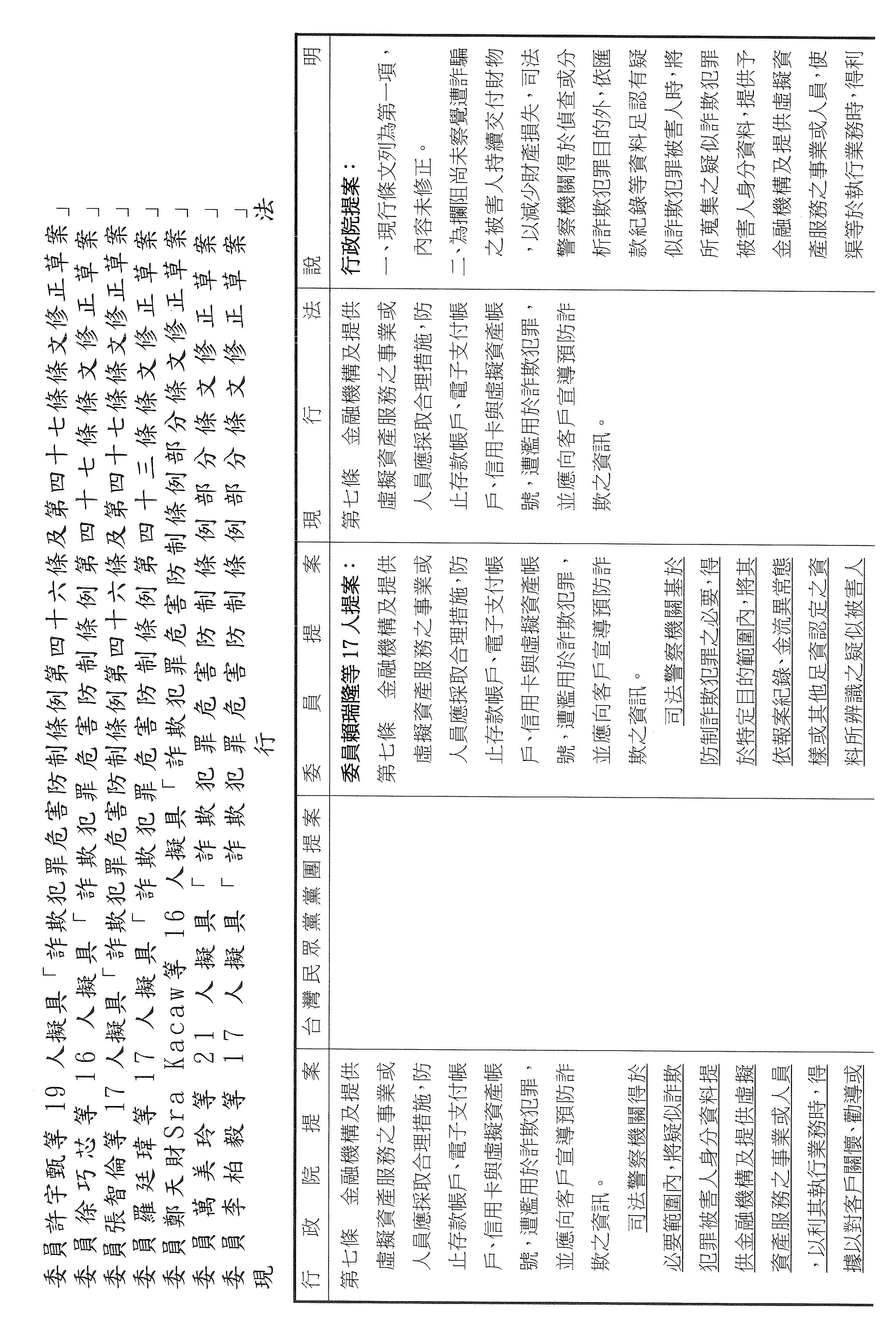 張委員宏陸:其實我們的法條都是連貫的,剛剛講的第九條,主任提到是第七條被害人部分,可是你仔細看,它只有對被害人的帳戶關懷、勸導或通知司法警察機關到場而已,並沒有像第九條寫得這麼明確,所以我剛剛才會問那個問題,不好意思,因為我認為我們應該要很仔細的審這個法條,所以又回到七跟九。