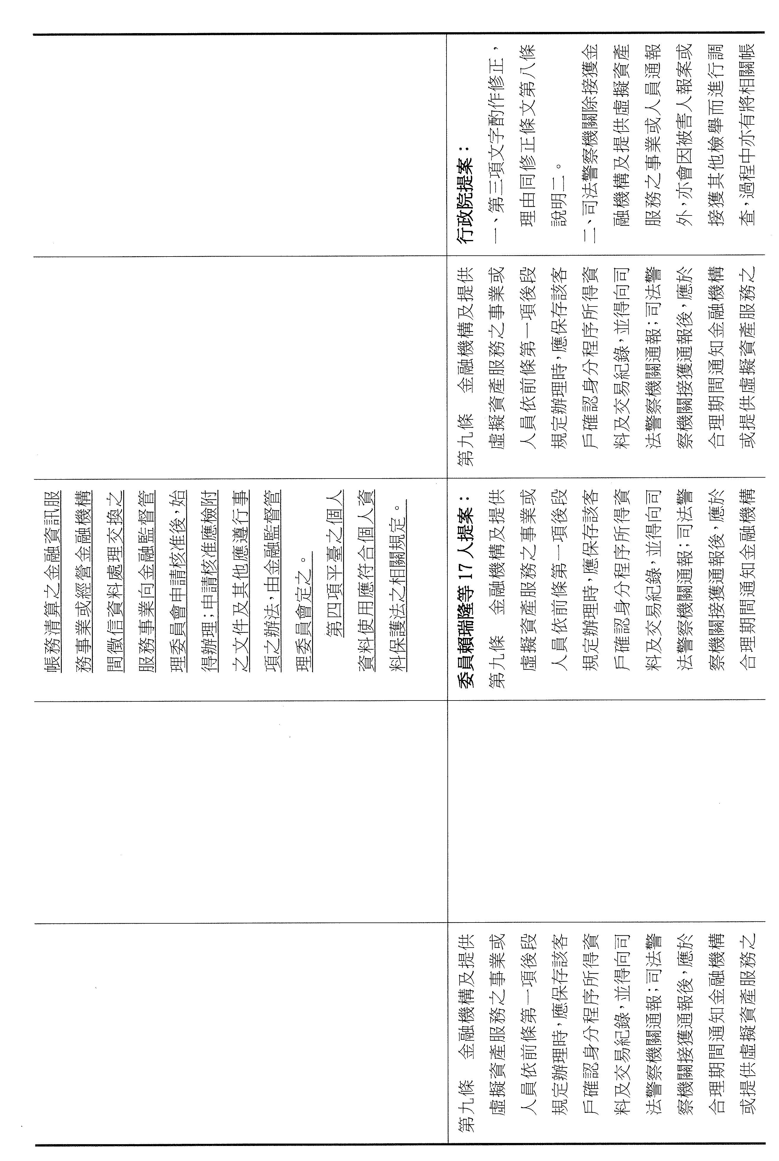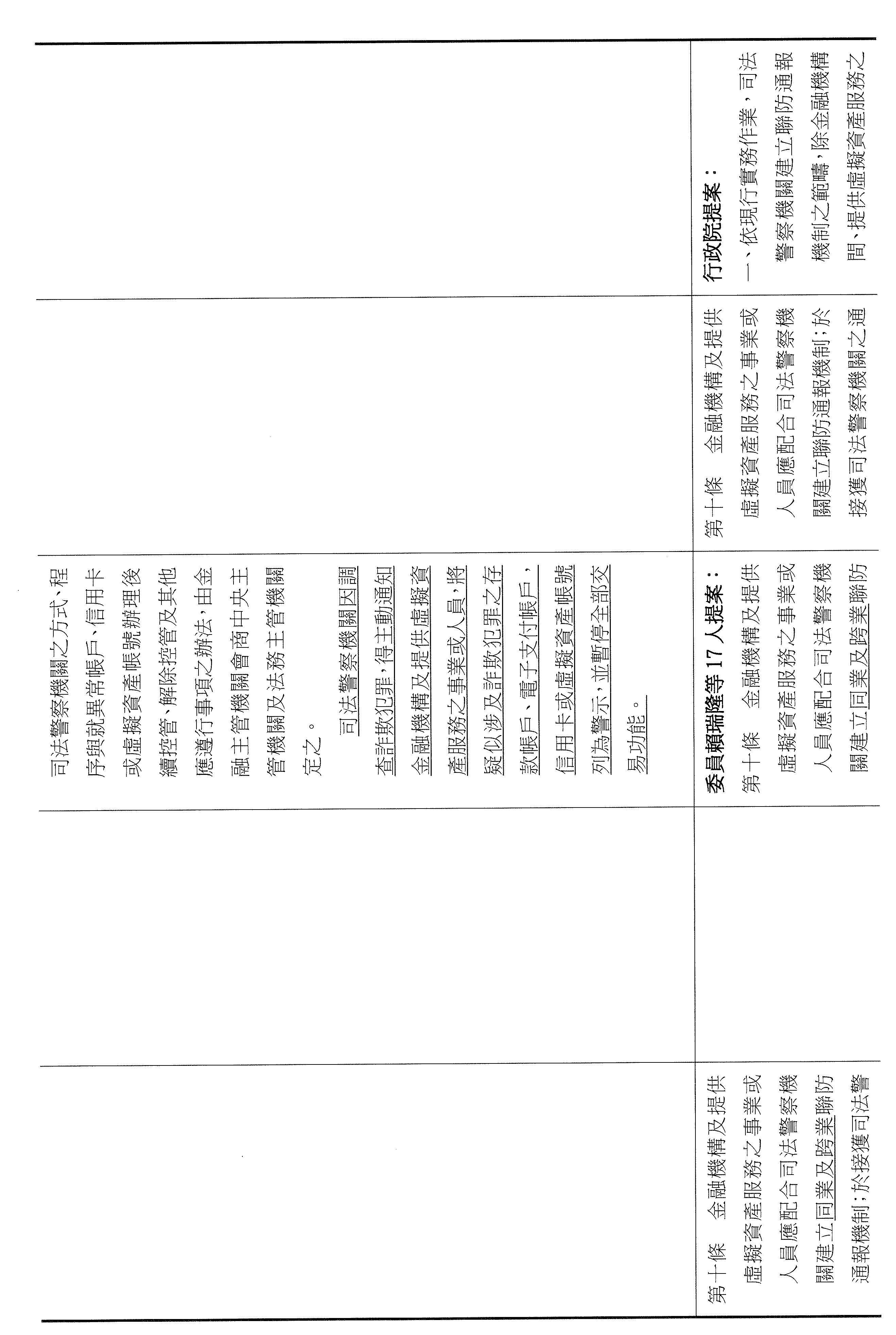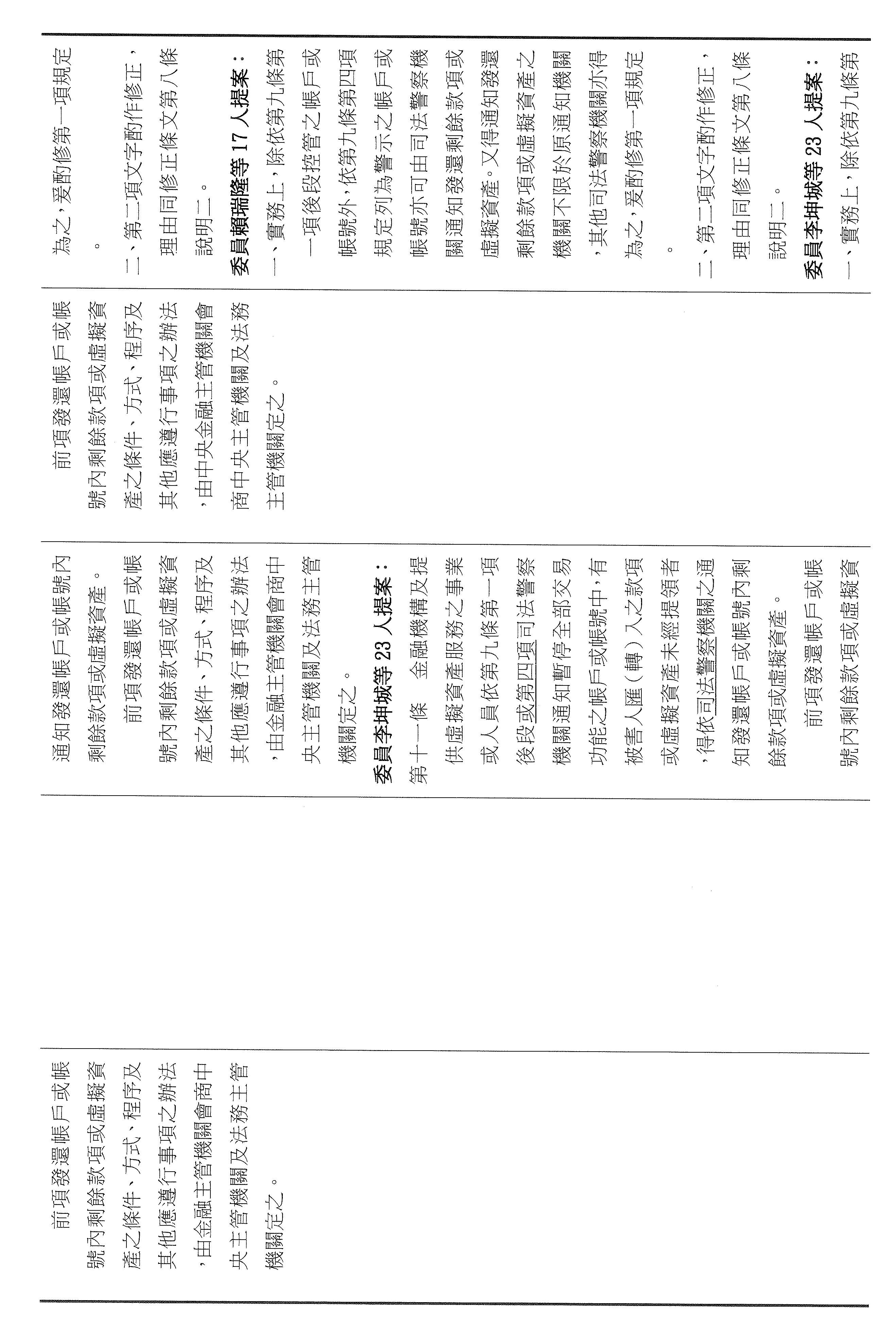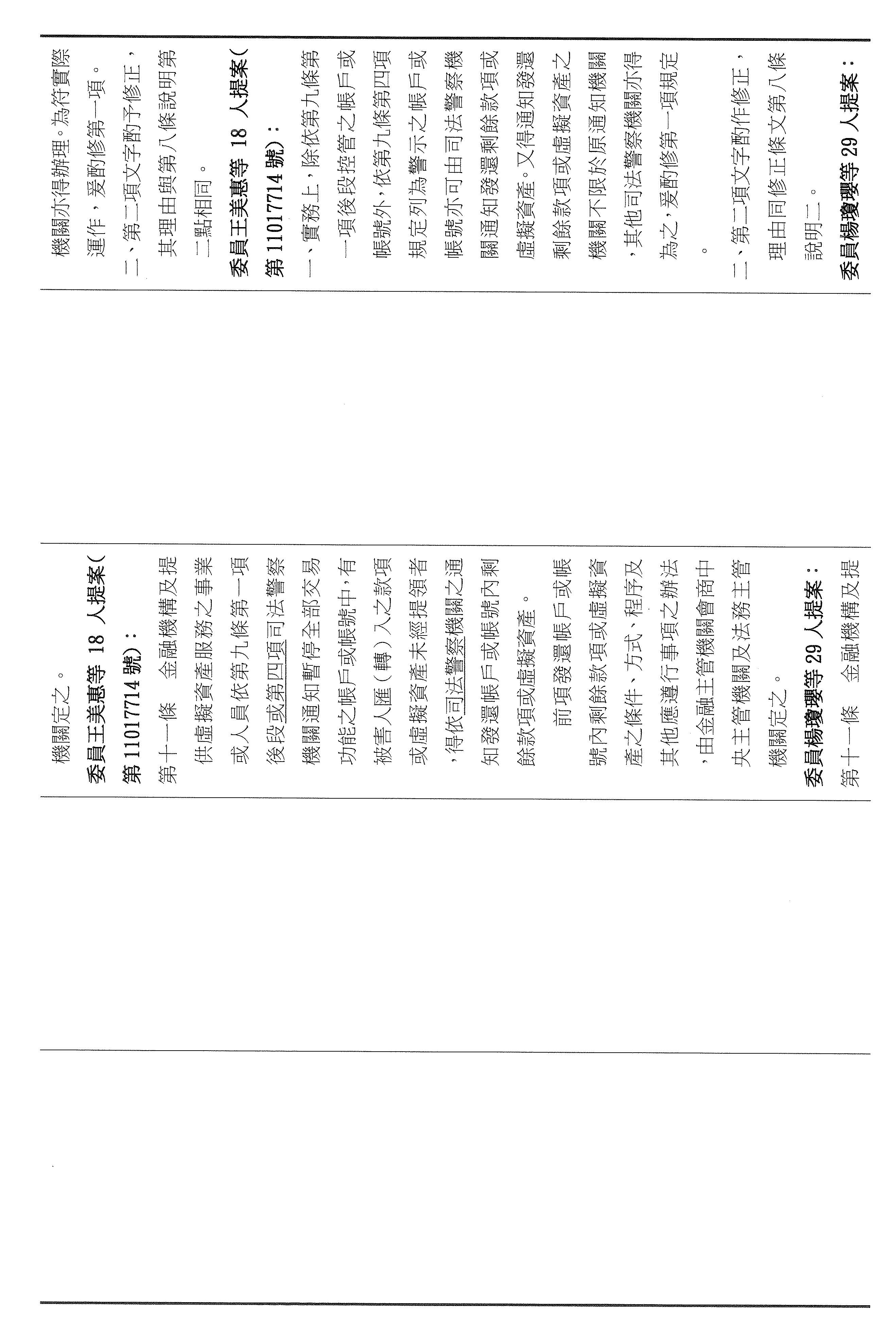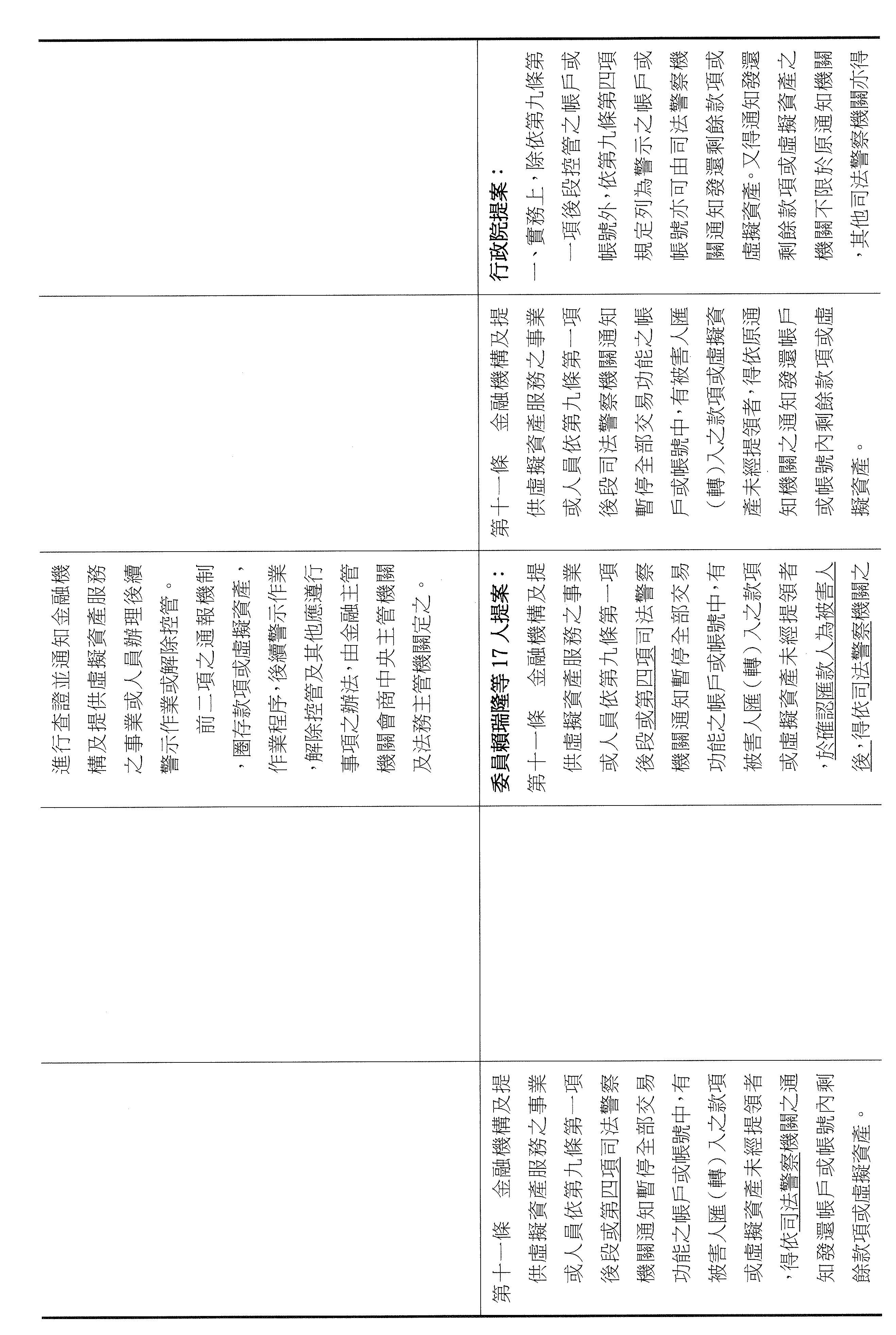 張委員宏陸:其實我們的法條都是連貫的,剛剛講的第九條,主任提到是第七條被害人部分,可是你仔細看,它只有對被害人的帳戶關懷、勸導或通知司法警察機關到場而已,並沒有像第九條寫得這麼明確,所以我剛剛才會問那個問題,不好意思,因為我認為我們應該要很仔細的審這個法條,所以又回到七跟九。