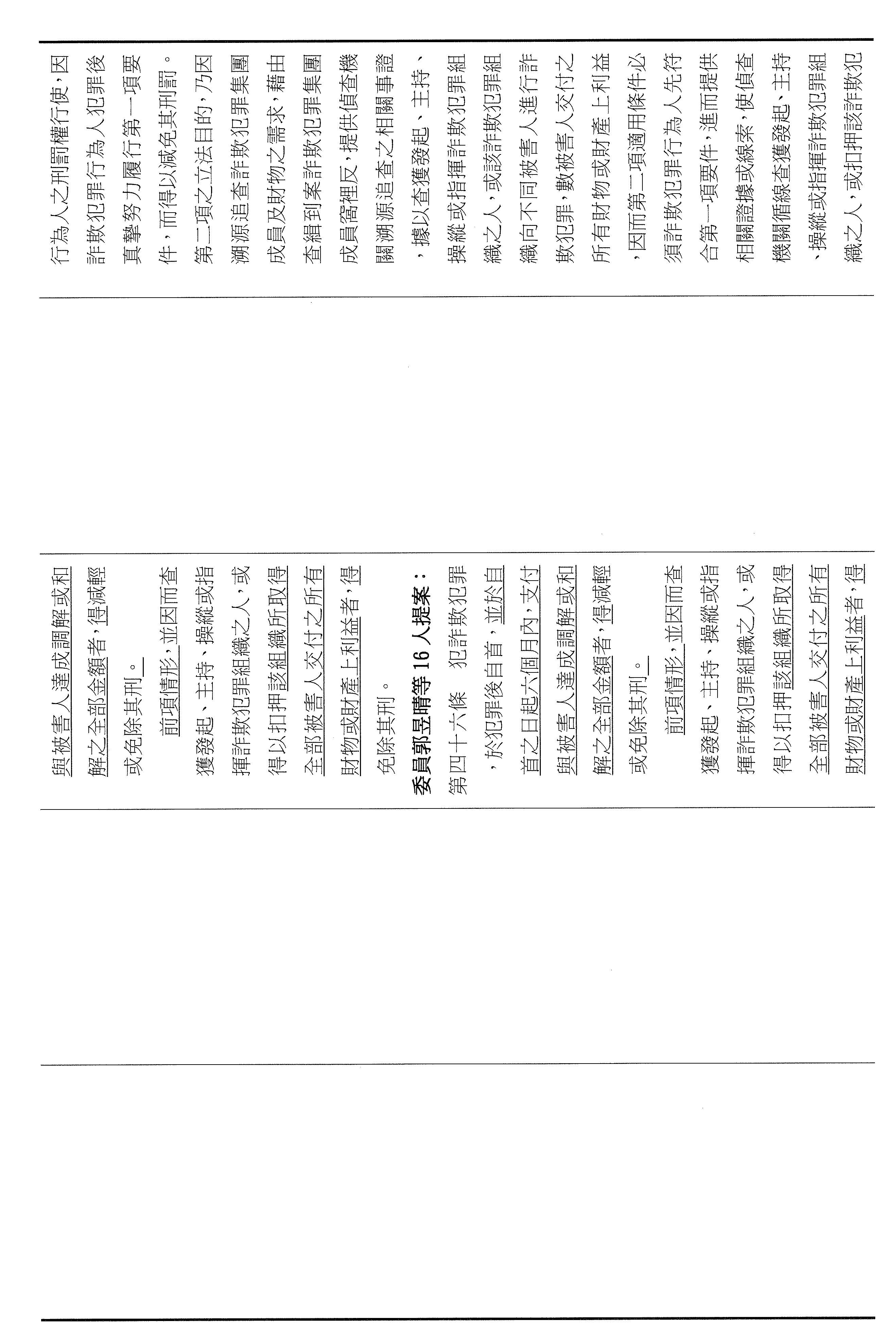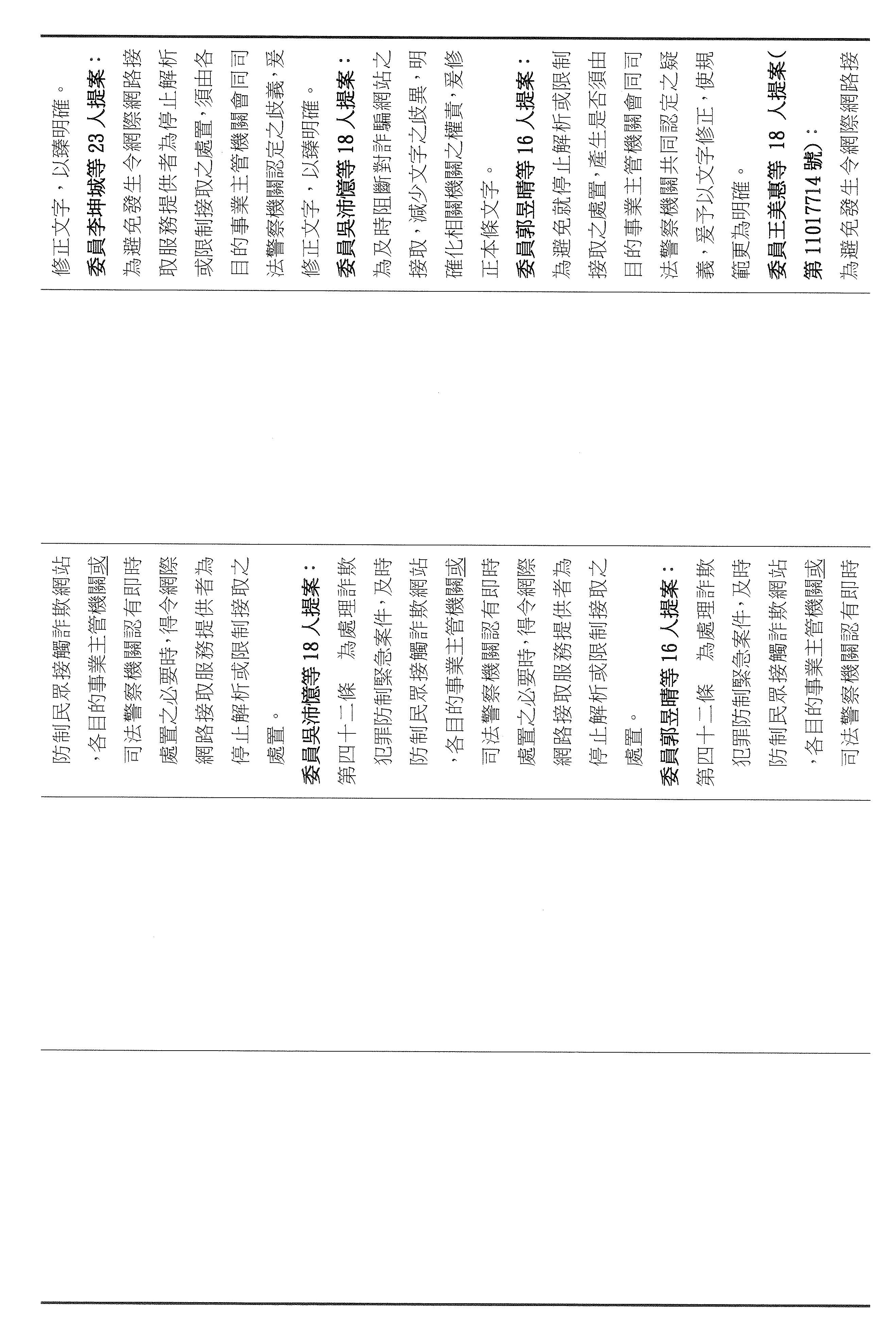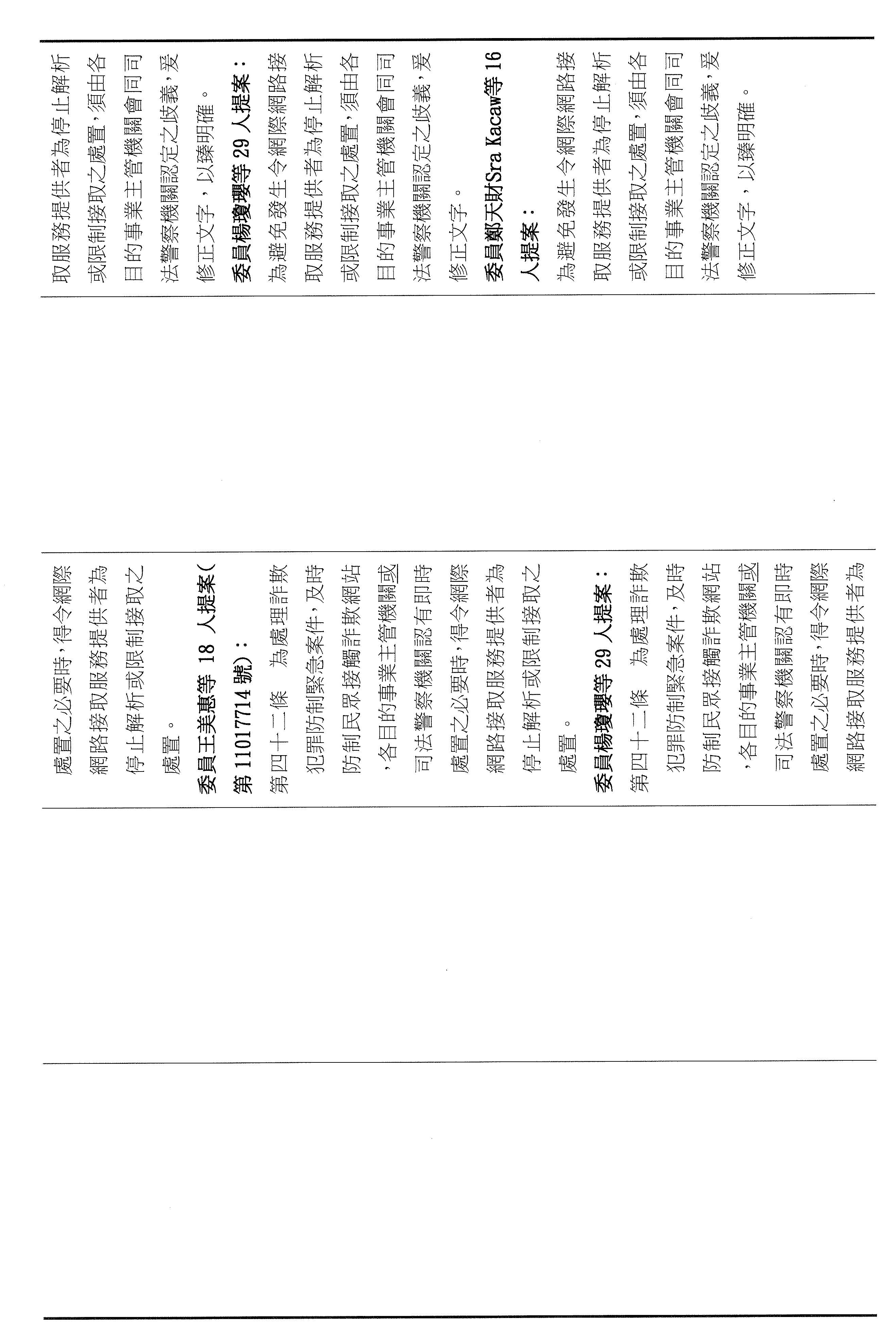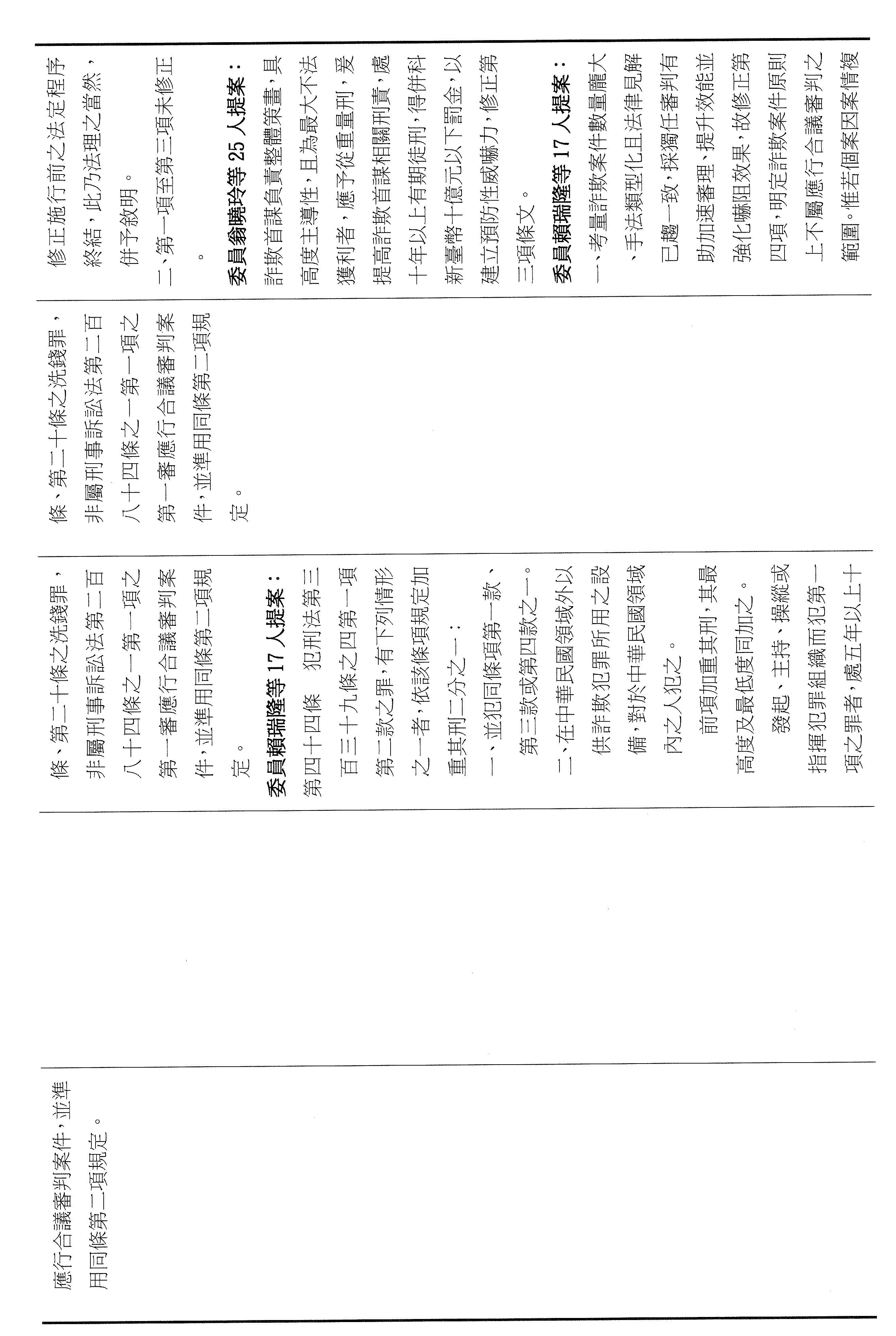 十五、繼續審查委員翁曉玲等24人擬具「詐欺犯罪危害防制條例第四十六條及第四十七條條文修正草案」案。