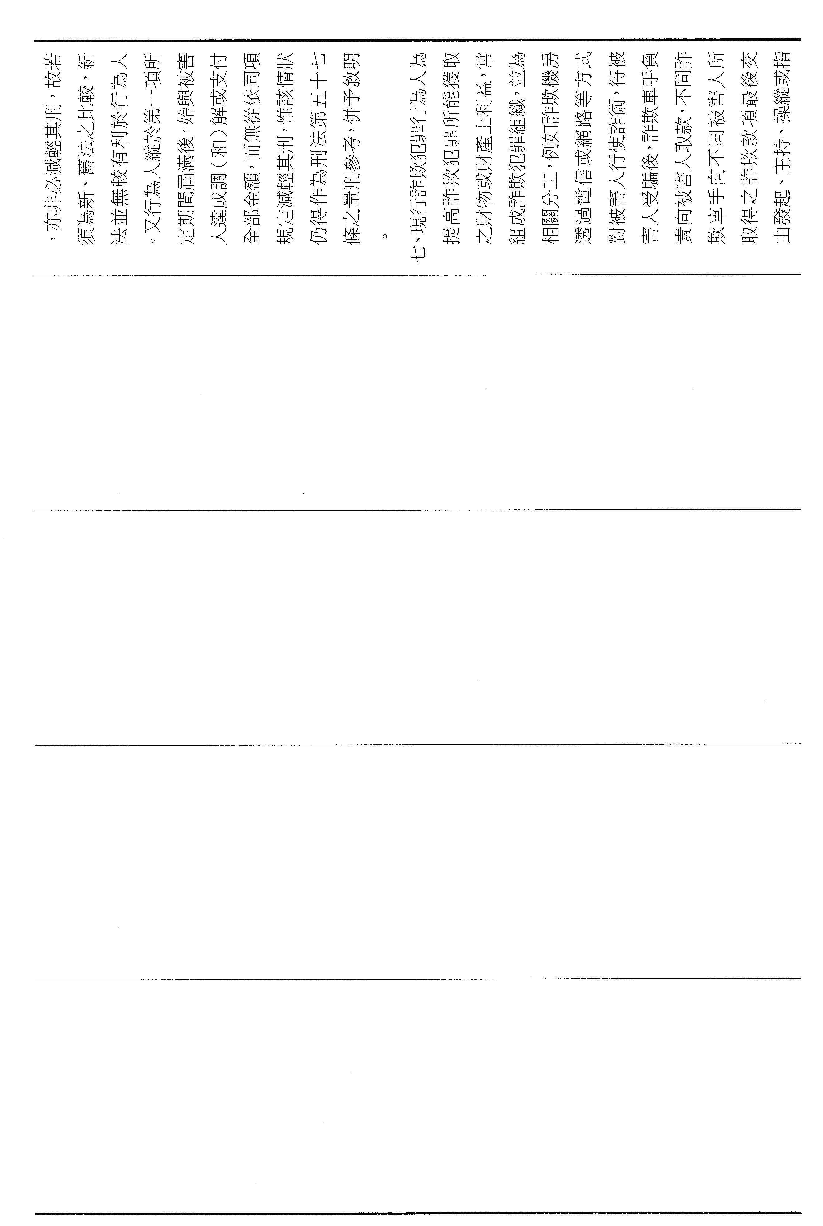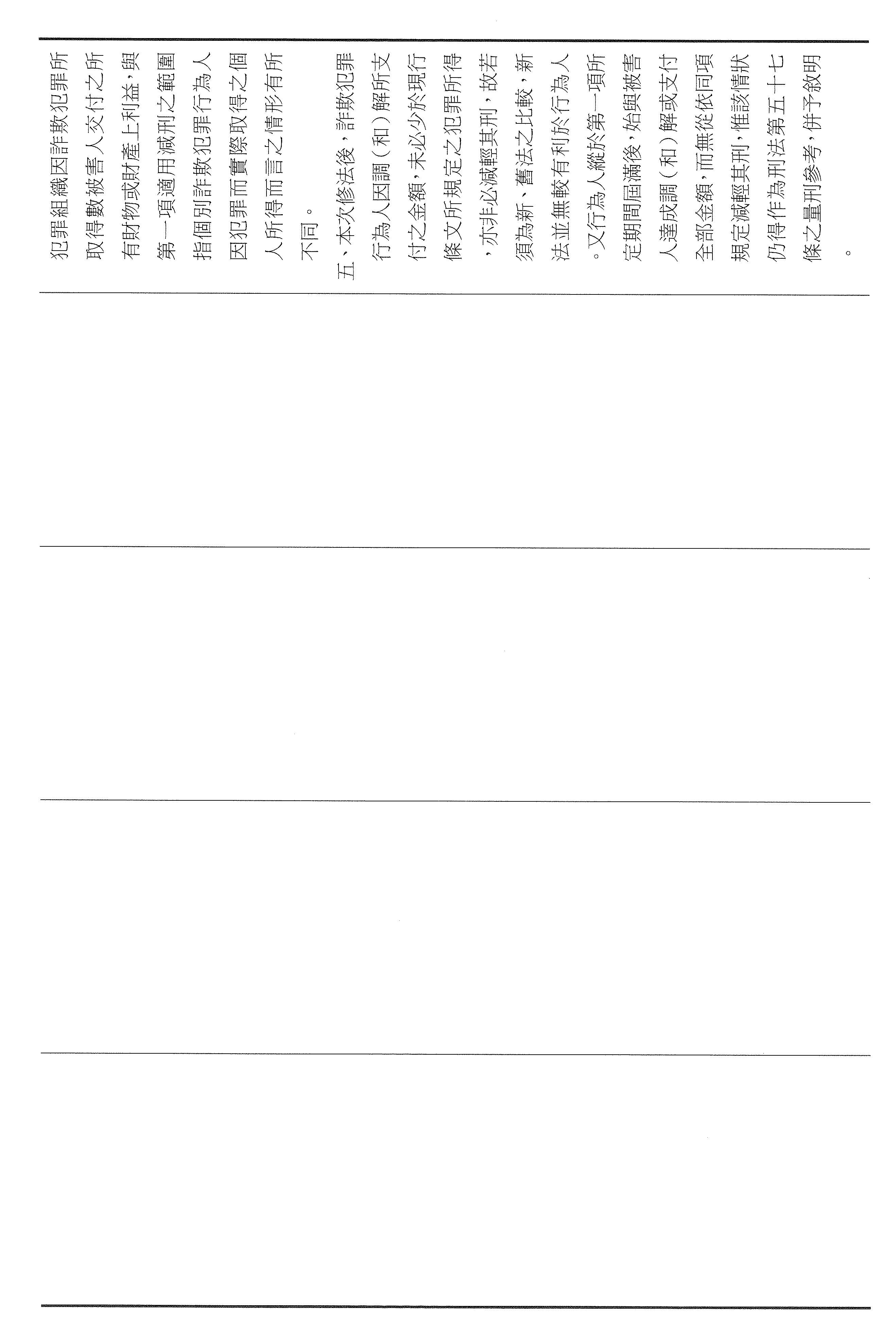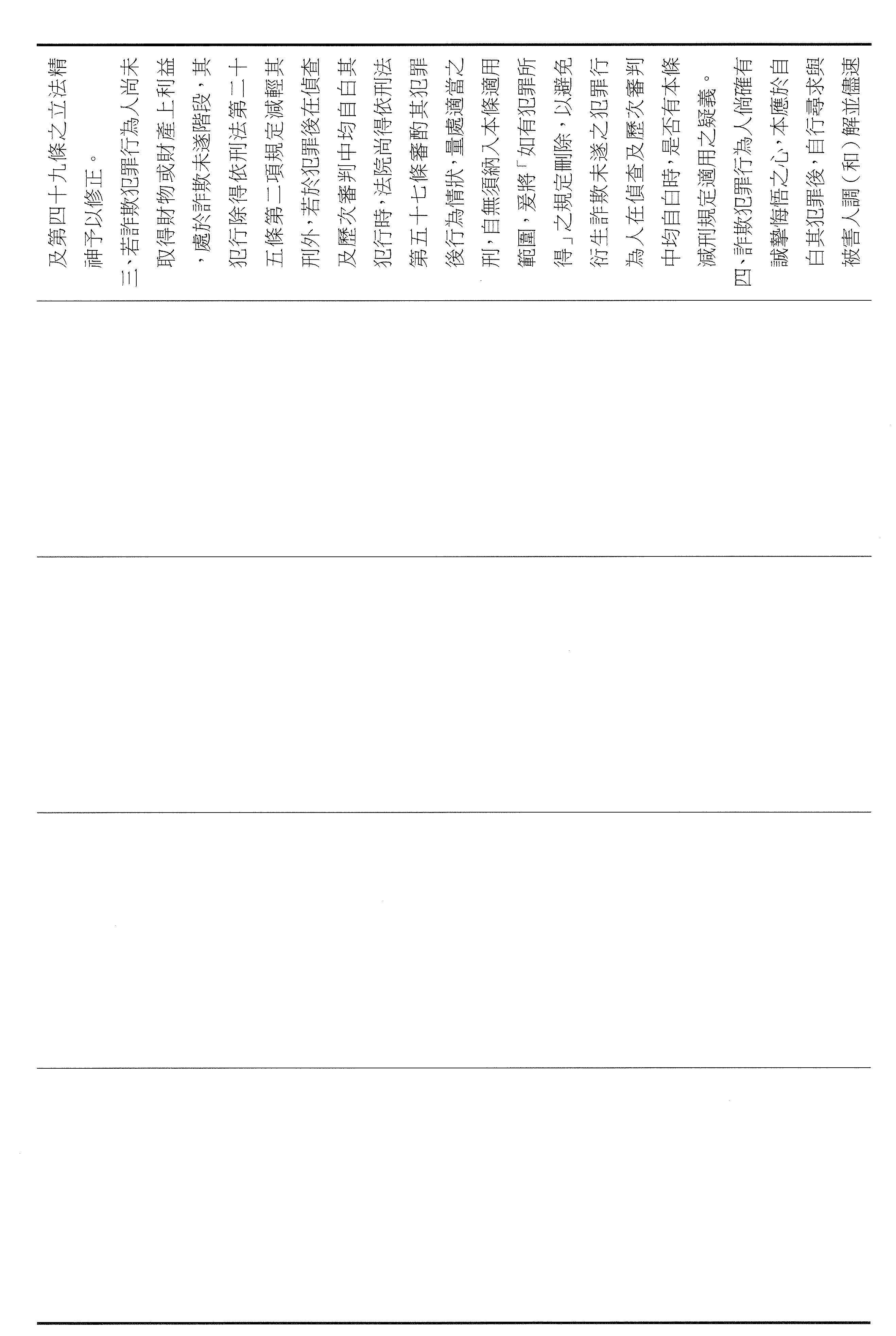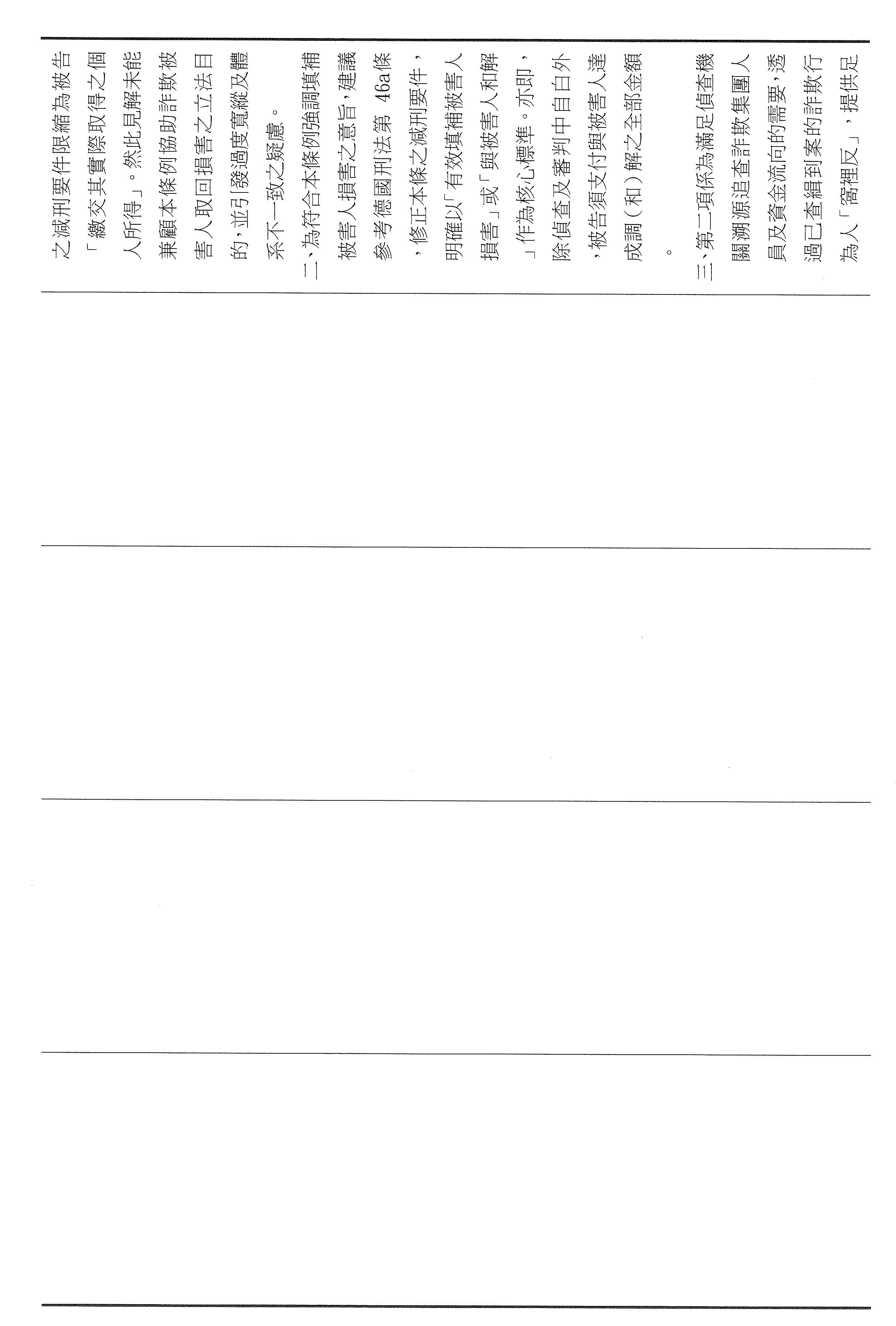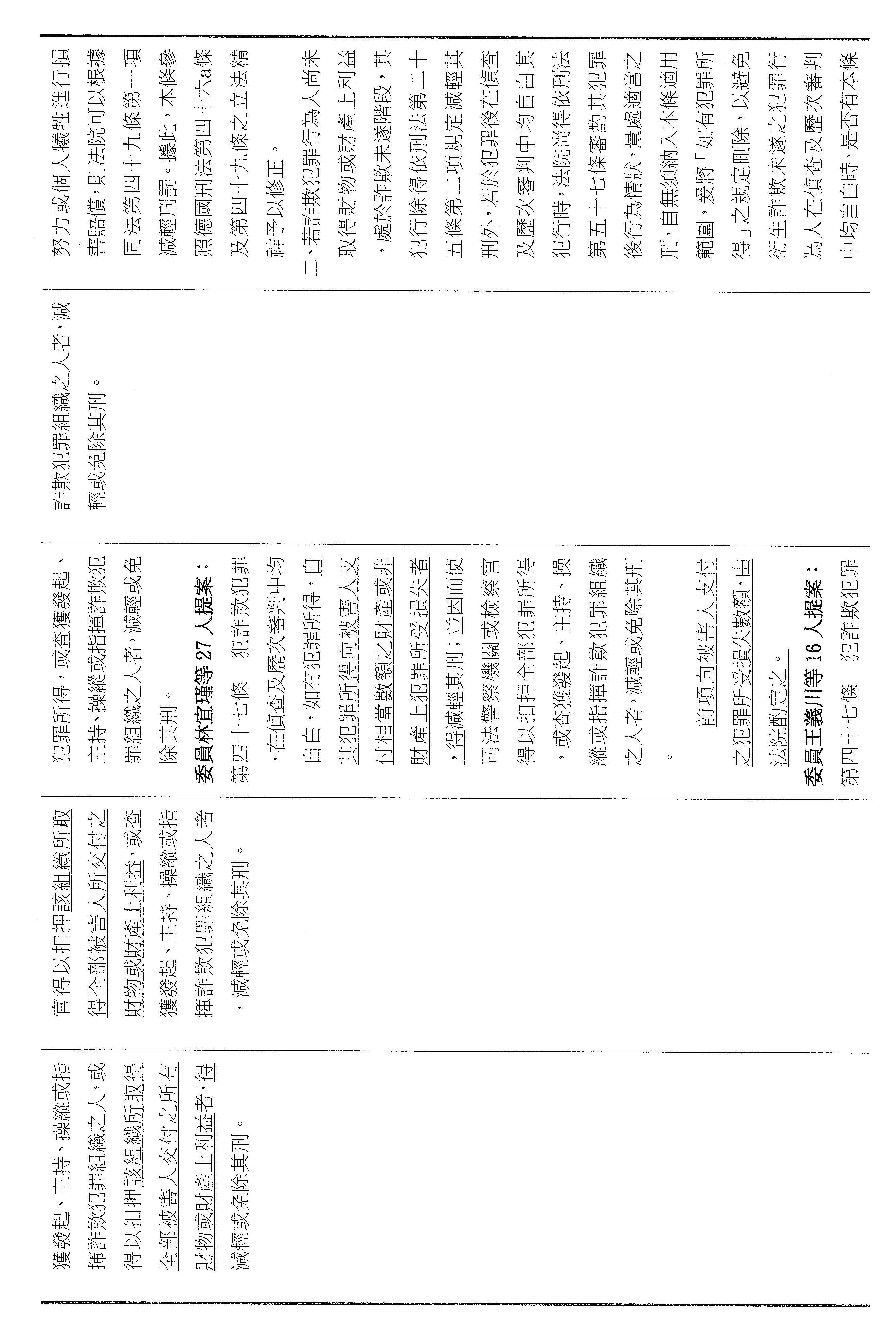 許委員宇甄:謝謝主席。本席所提出的第四十六條修正主要有兩個核心:第一個是要把給減刑機會與實際的補償牢牢地綁在一起,而修正的條文要求自首者必須在自首之日起六個月支付與被害人達成調解或和解的全部金額。為什麼要說六個月?就是要設定防止拖延,也避免有人一邊說悔改,一邊拖著不還,讓被害人在訴訟裡越等越久、越等越絕望。第二個,詐騙大部分都是集團分工,底層的成員不一定握有金流,真正的詐騙集團主腦,如果我們可以往上追,把錢追回來的機率也會變高。所以我也增訂,如果行為人能夠協助查獲發起、主持、操縱或指揮詐欺組織的人,扣押該組織取得的全部被害人財物或財產上的利益,得以免除其刑。這是希望用制度要求犯後要付出看得見的代價跟貢獻,才能夠換到更有利的處理,而且也可以追出比較高的追贓跟瓦解的效果,也回應社會最迫切的期待,這就是本席針對第四十六條修正所提出的意見。謝謝。