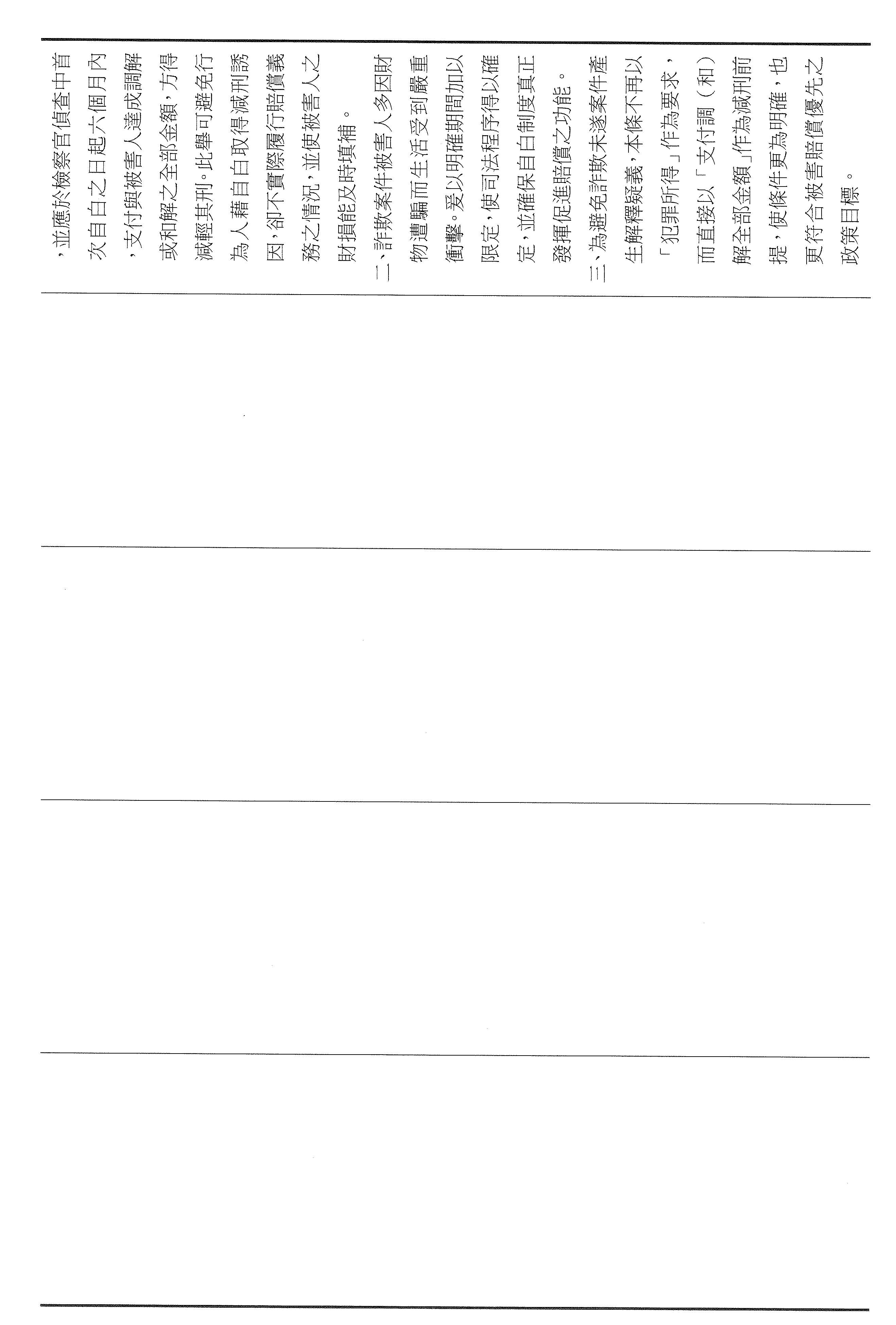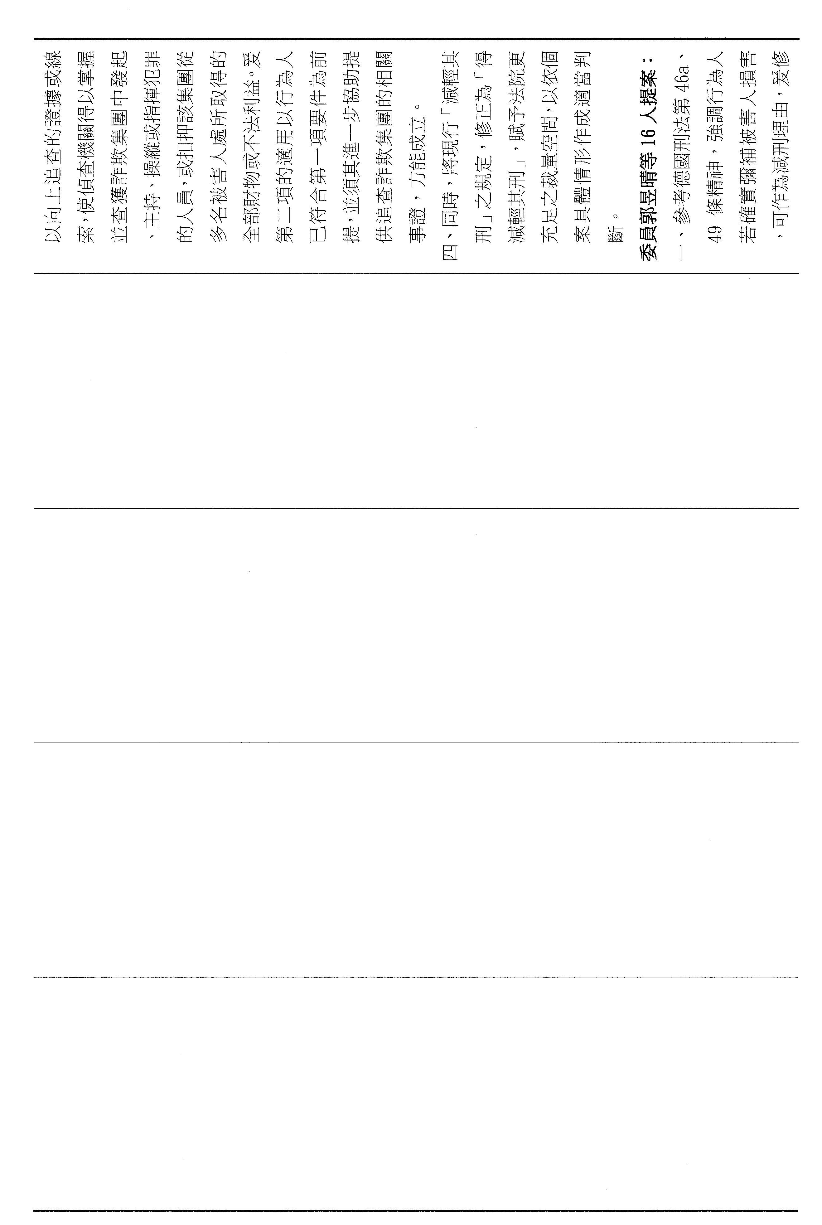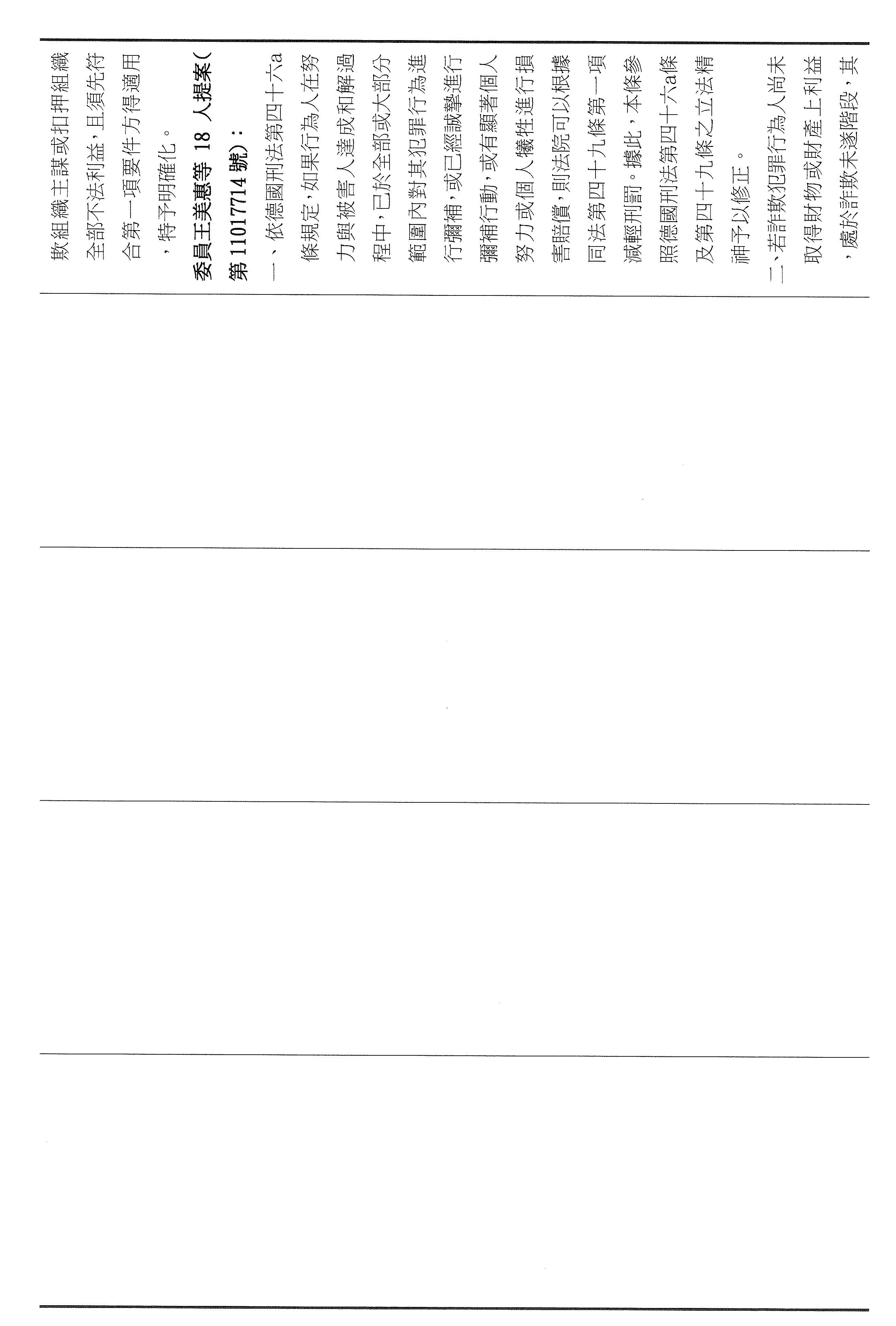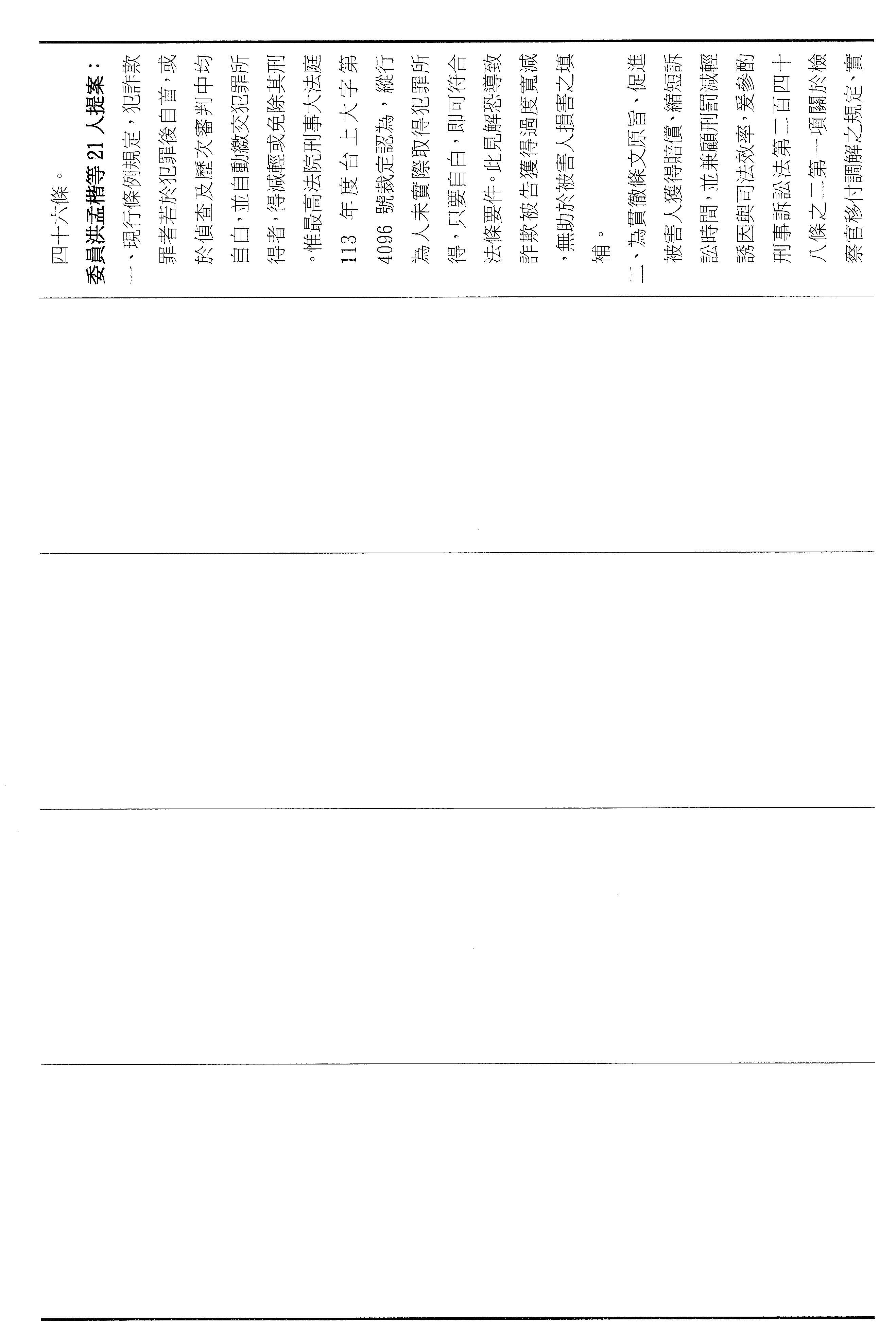 本席這次提案以彌補損害為軸心,將減刑要件具體化、期限化,並把重點從抽象的犯罪所得拉回到可驗證的補償行為,避免行為人以未實際取得財物為由推託返還。其中第四十六條明定,行為人犯罪後自首,應於自首之日起六個月內支付與被害人達成調解與和解的全部金額,始得減輕或免除其刑。第四十七條亦明定,行為人在偵查或歷次審判中均自白者,應於檢察官偵查中首次自白之日起六個月支付前述的全部金額,始得減輕其刑。以明確的期限,避免訴訟程序因等待籌款而一再地拖延,也讓減刑不再只是口頭的表態,而是能夠以實際的全額補償來換取。