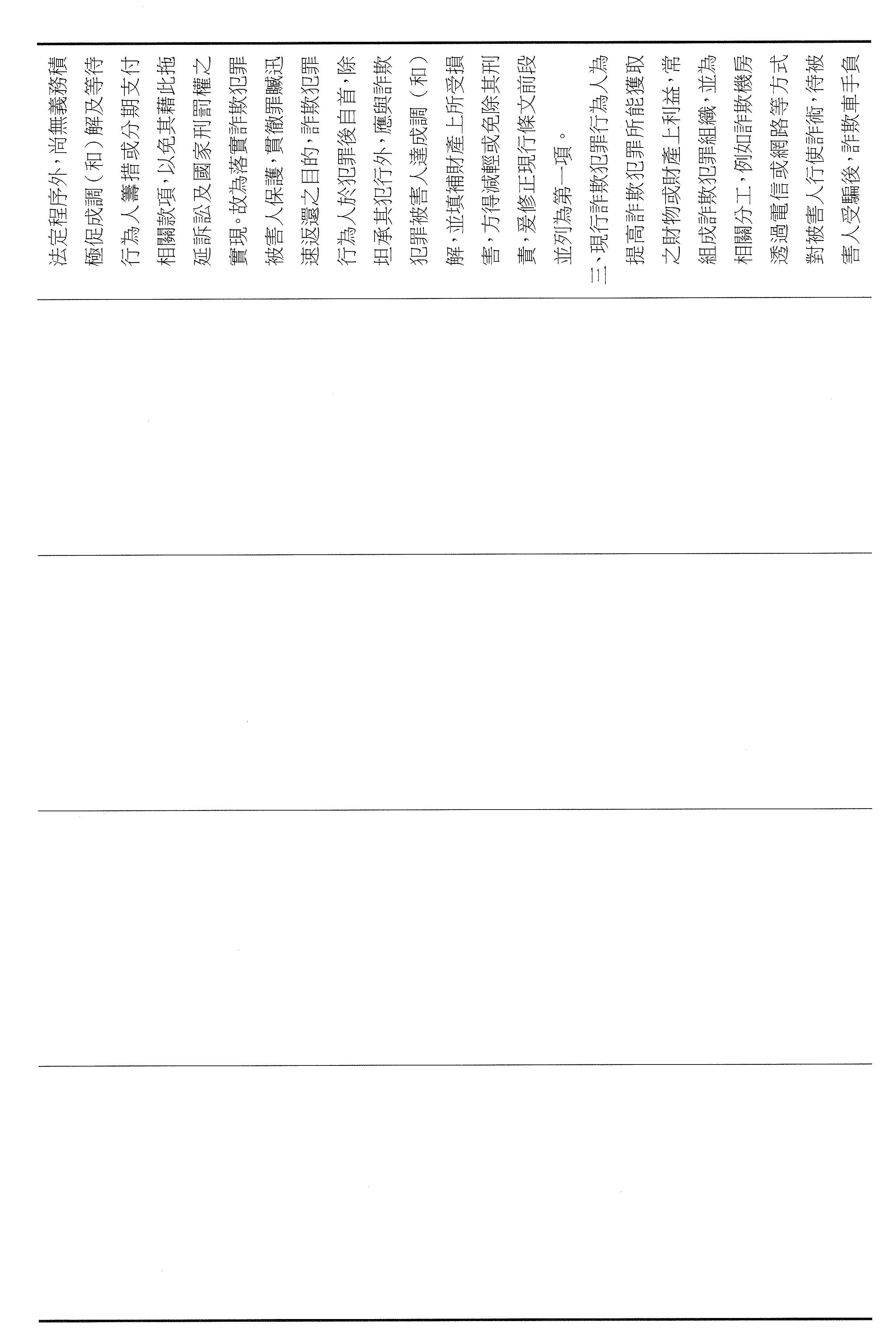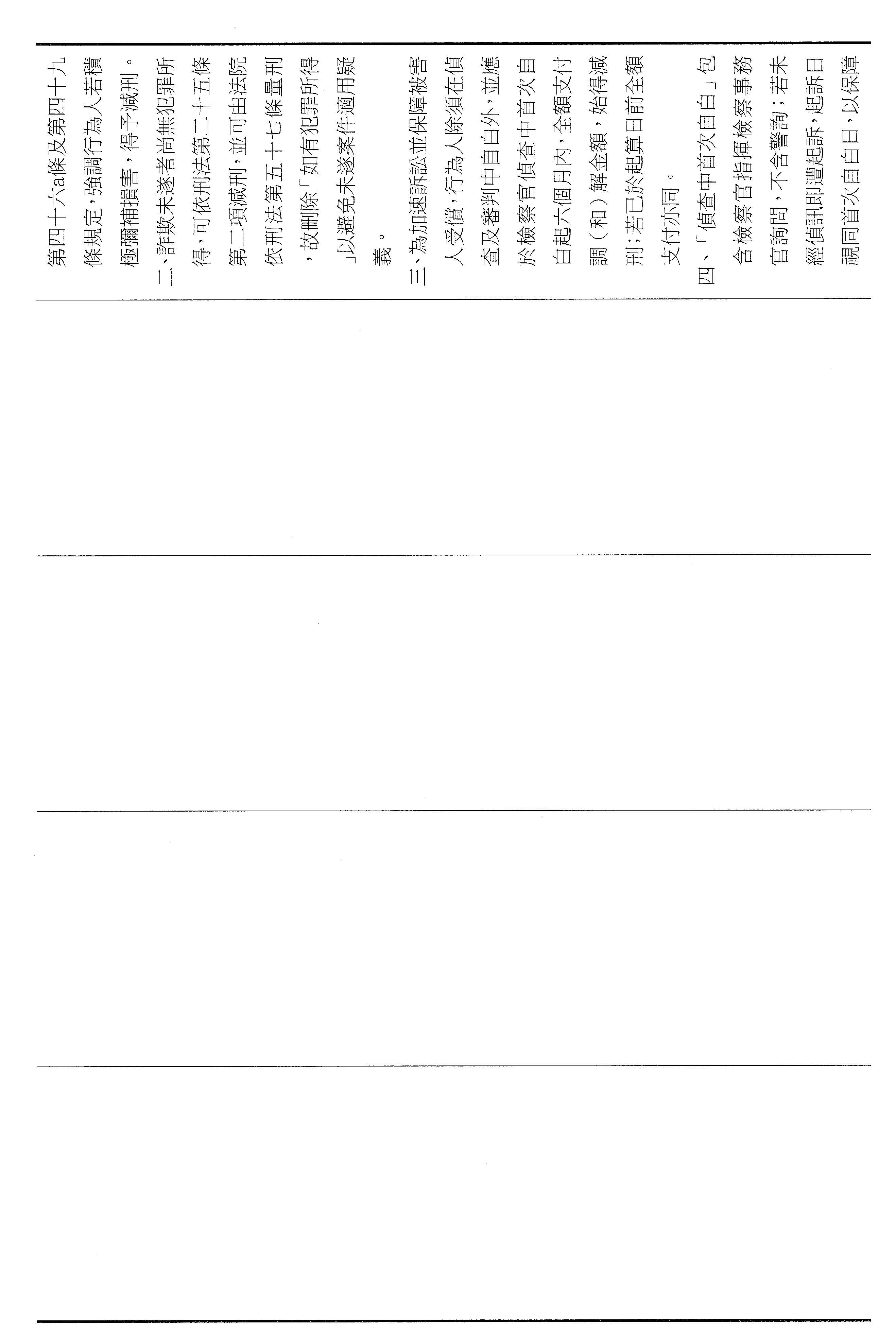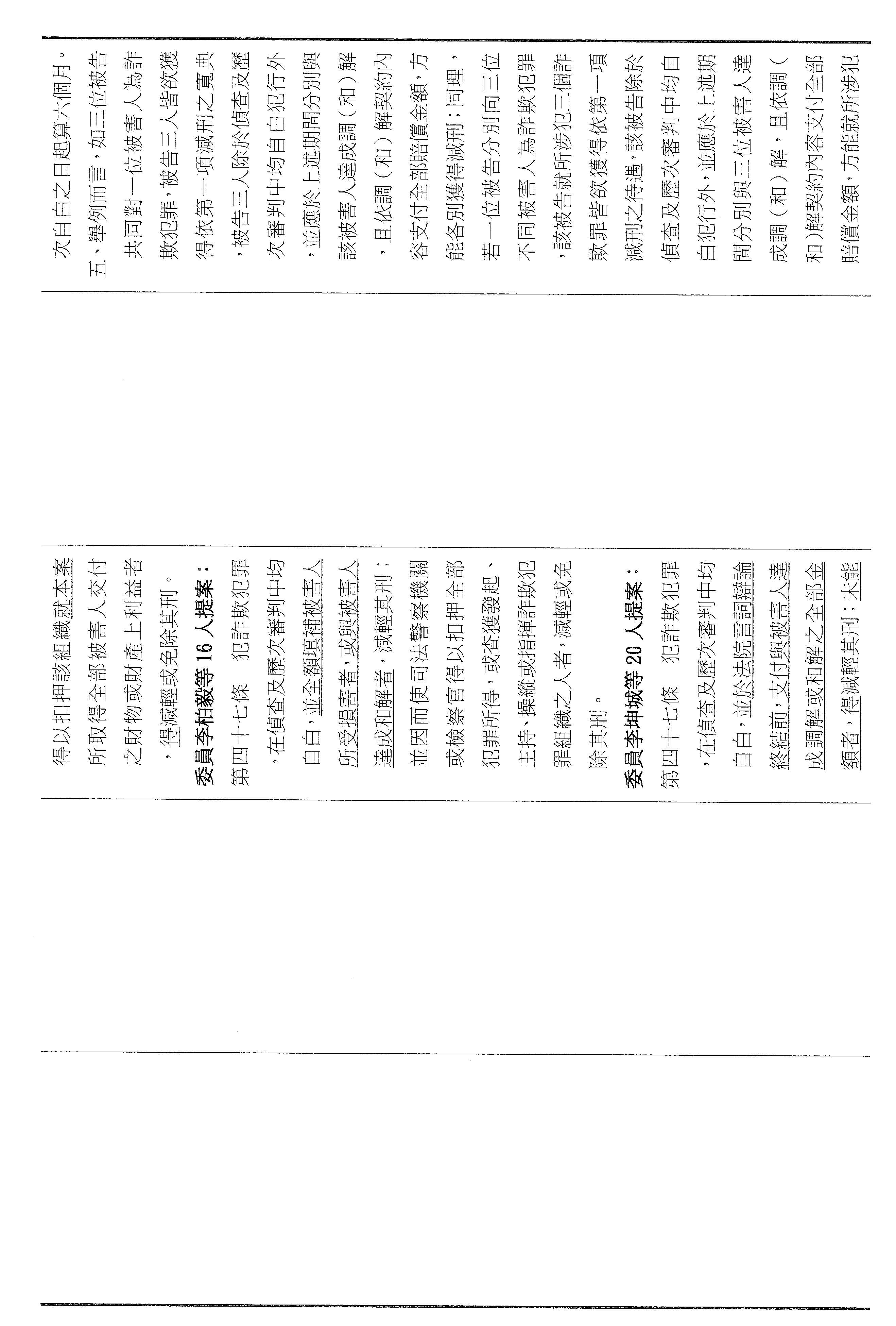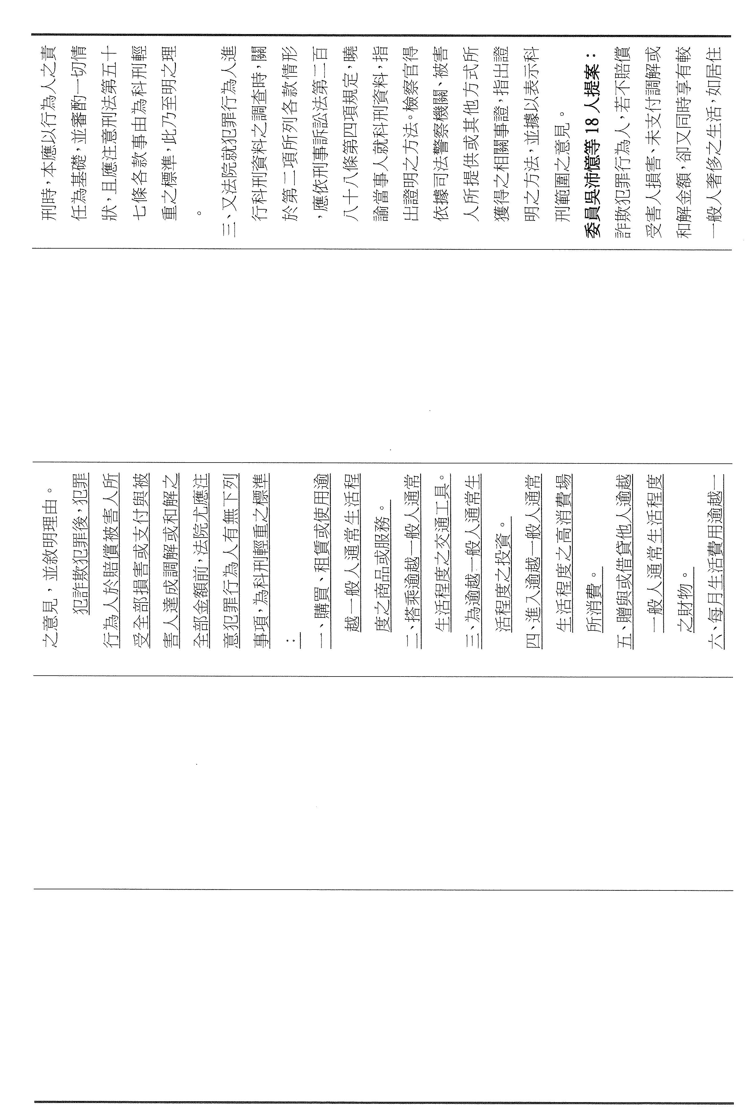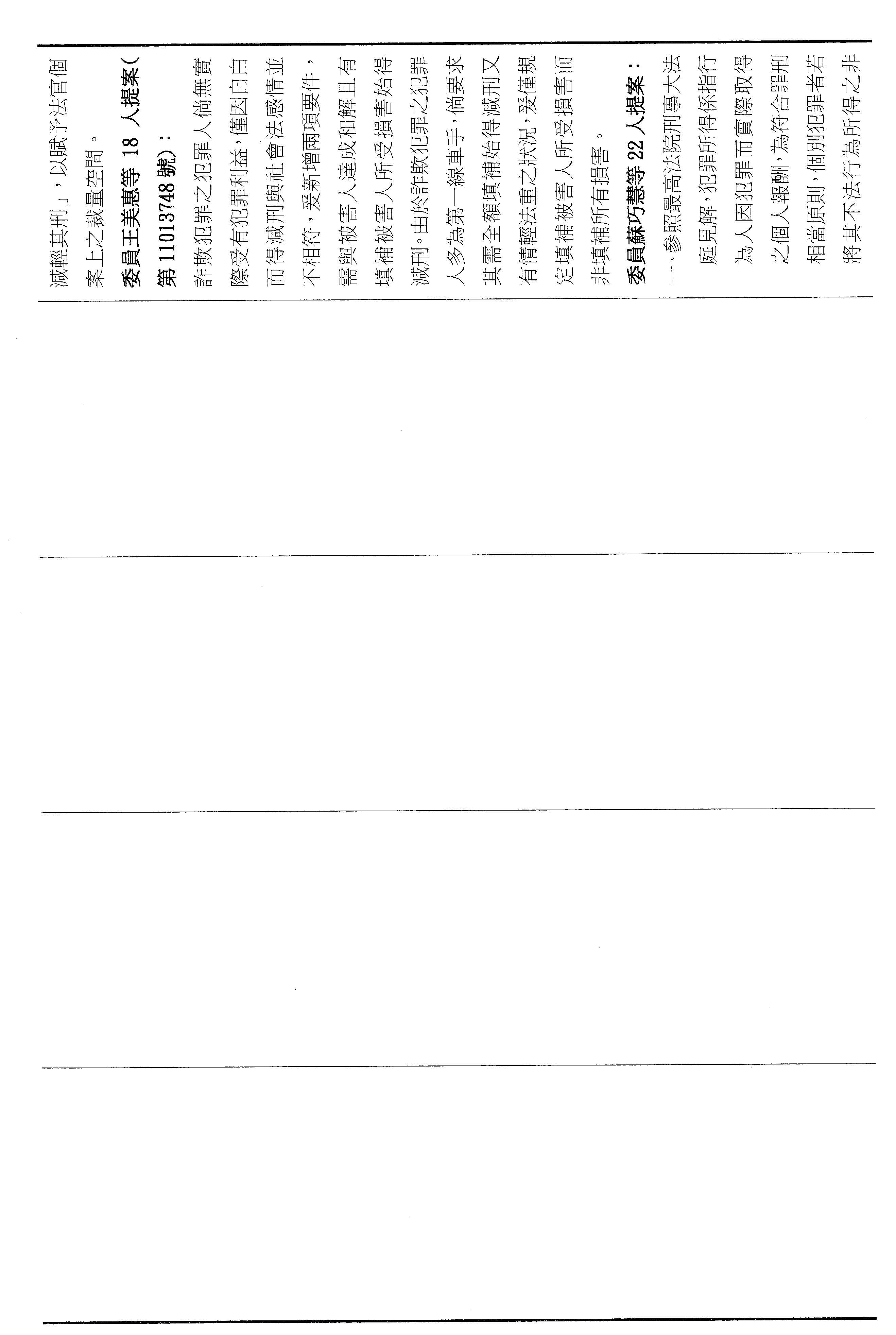本席這次提案以彌補損害為軸心,將減刑要件具體化、期限化,並把重點從抽象的犯罪所得拉回到可驗證的補償行為,避免行為人以未實際取得財物為由推託返還。其中第四十六條明定,行為人犯罪後自首,應於自首之日起六個月內支付與被害人達成調解與和解的全部金額,始得減輕或免除其刑。第四十七條亦明定,行為人在偵查或歷次審判中均自白者,應於檢察官偵查中首次自白之日起六個月支付前述的全部金額,始得減輕其刑。以明確的期限,避免訴訟程序因等待籌款而一再地拖延,也讓減刑不再只是口頭的表態,而是能夠以實際的全額補償來換取。