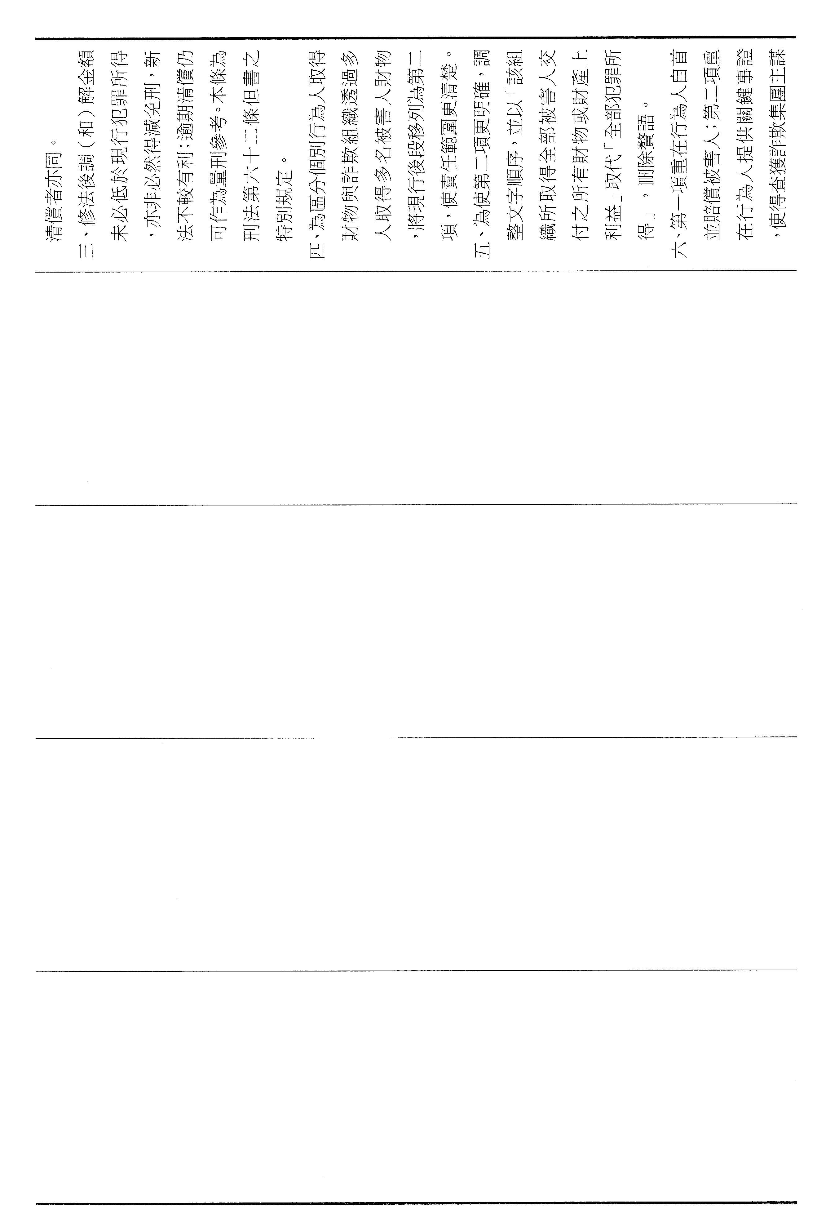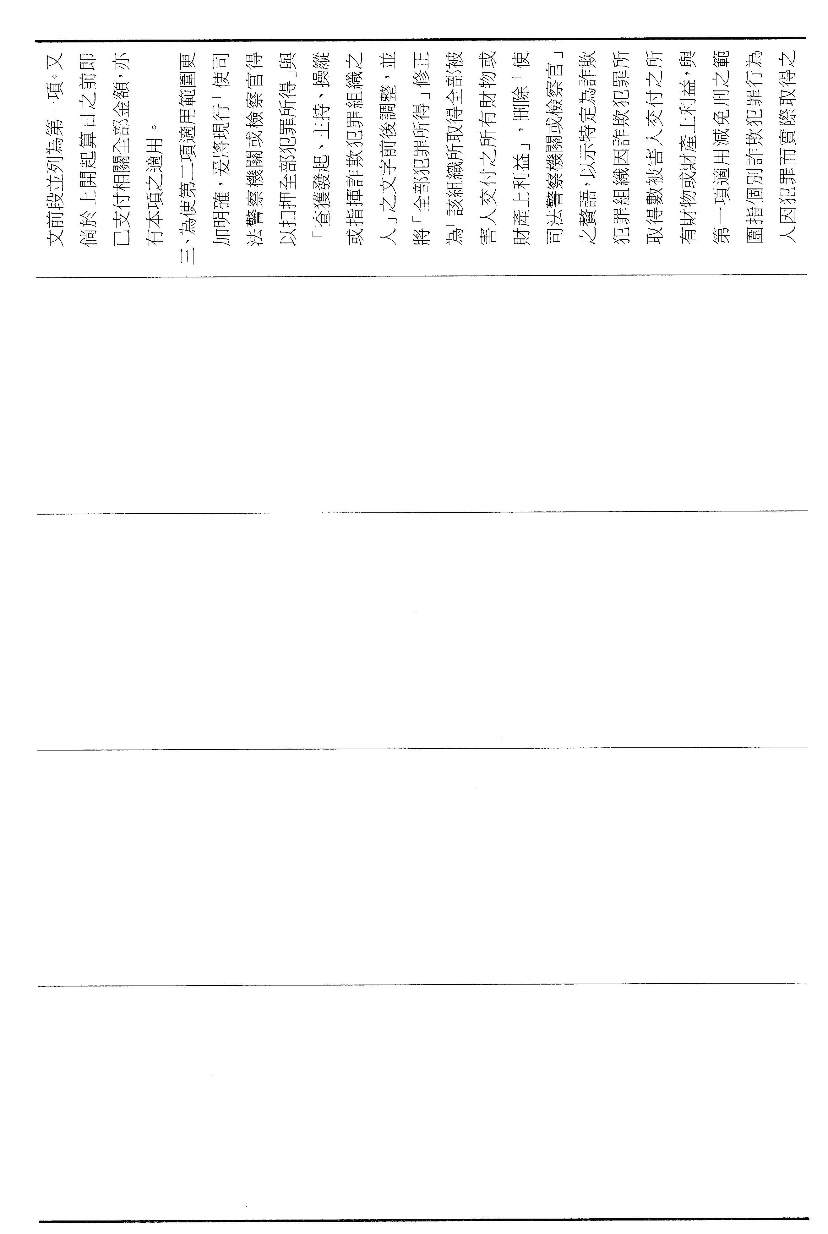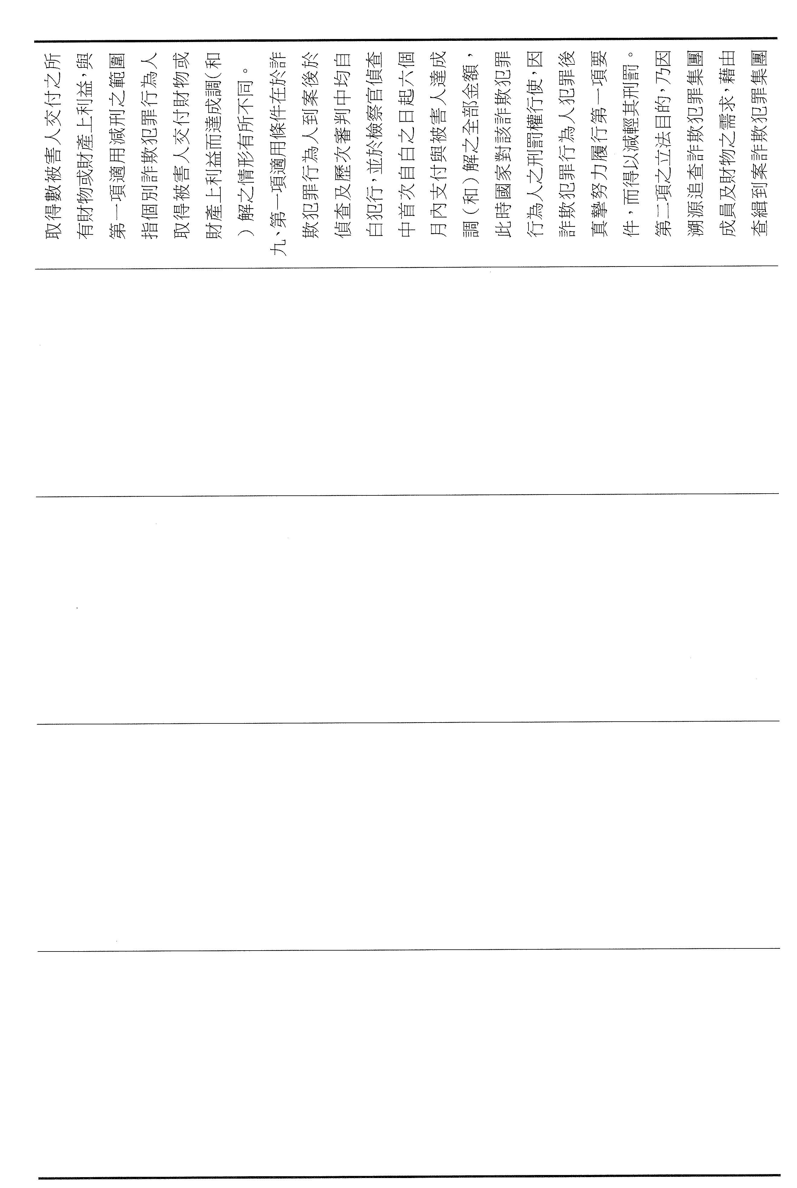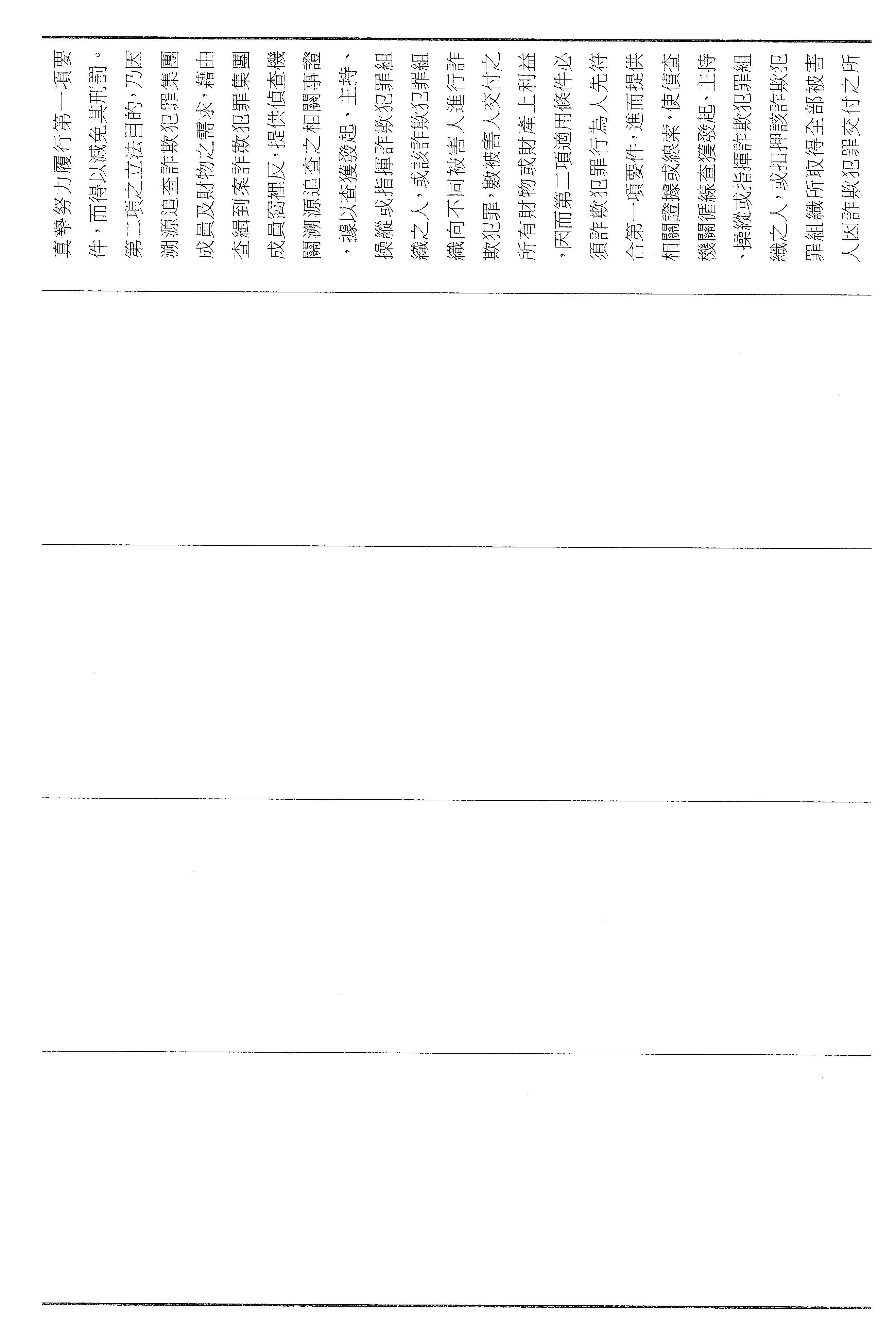 第二,區隔賠償責任,強化溯源誘因。我們也修正了第四十七條第二項的規定,明確區隔個別行為人的賠償責任以及犯罪組織追贓的範圍,如果犯罪者能進一步提供具體的事證,協助檢警查獲詐欺集團的首腦,或者是查扣該組織自所有被害人所取得的不法利得才能獲得減除其刑。透過明確的層次區分才可以保障被害人的求償權利,而且可以引誘集團內部成員窩裡反,讓吹哨者有機會實現成效,協助瓦解詐欺集團。