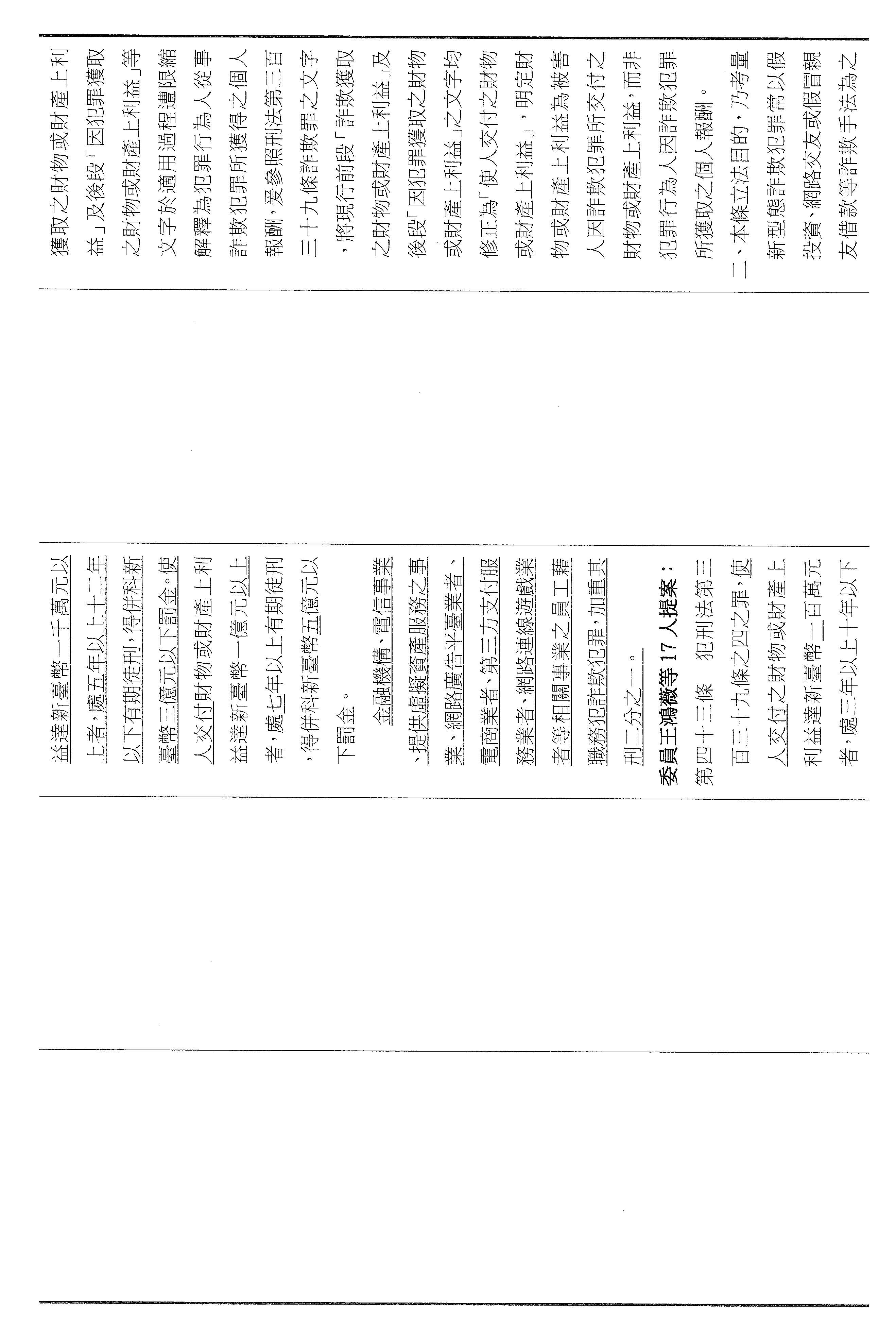 二十七、審查委員王鴻薇等17人擬具「詐欺犯罪危害防制條例第四十三條及第五十條條文修正草案」案。