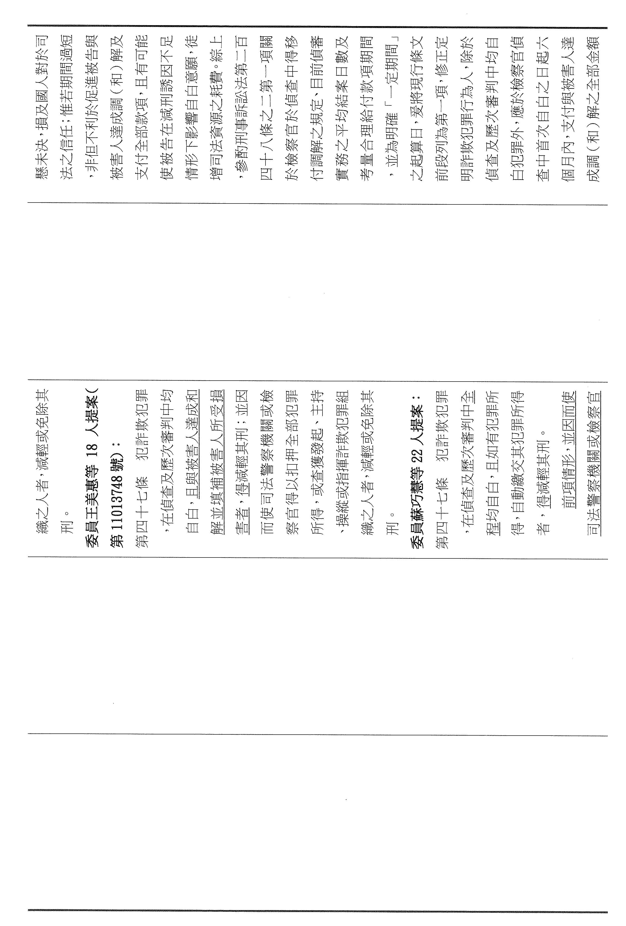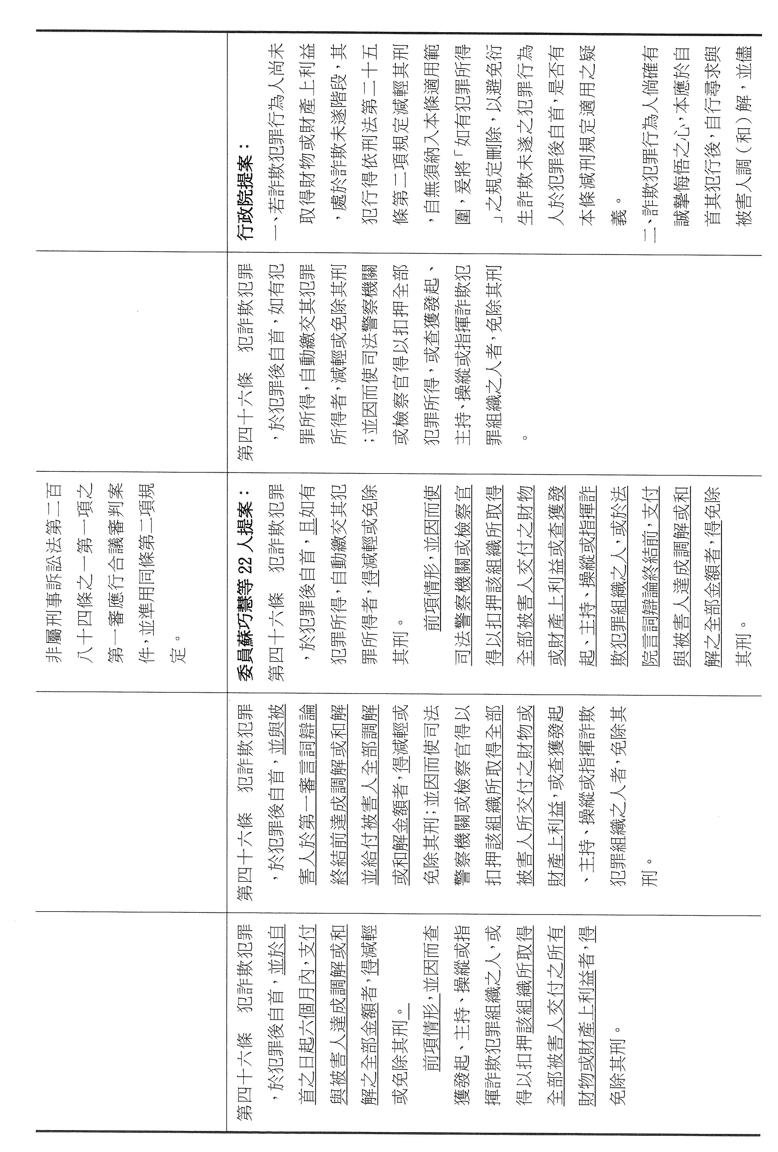 蘇委員巧慧:謝謝主席。針對第四十六條和第四十七條,我先講第四十六條,其實我們就是在現行條文實施之後發現,本來會希望因為法條的設計而讓犯罪者交出他的犯罪所得,也就是讓被害人可以儘速取得補償,結果當時的好意在實務執行上卻反而產生漏洞這樣的狀況,所以這次大家都是希望來填補,如果在這樣的狀況之下,其實剛剛大家講的意旨都差不多,甚至我個人其實也有版本,但我們現在來看行政院版本,其實我覺得已經把各家的意見都納含進去了,包括說要追錢才可以,錢追到了才可以減輕其刑,而且不是一定,是可以考量而已,是「得」!然後有期間、有裁量空間,文字又比我們其他人的版本都簡潔,所以我個人是覺得可以支持院版,我也認為大家可以再看一下院版,我們就照院版通過。
