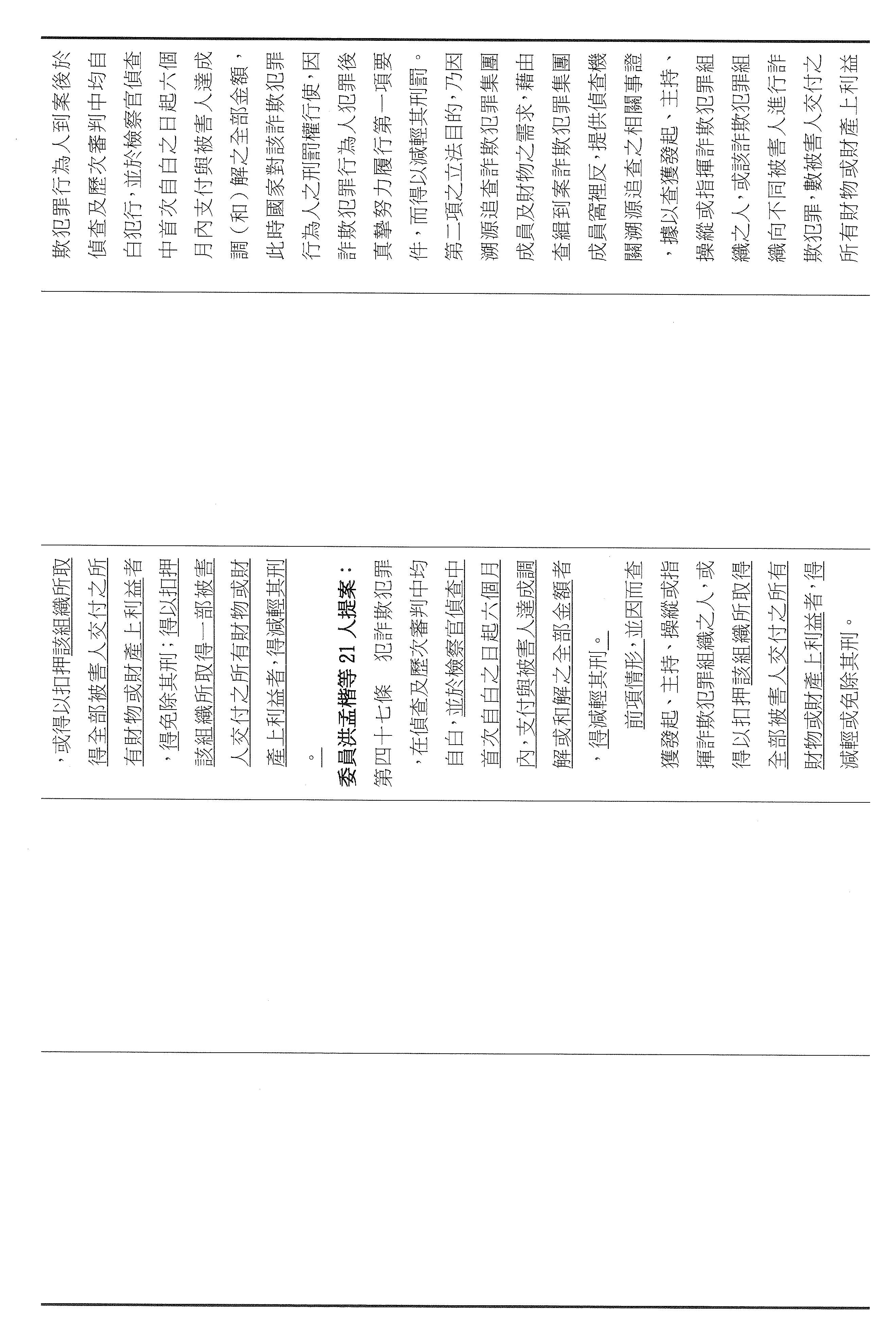 二十三、審查委員洪孟楷等21人擬具「詐欺犯罪危害防制條例第四十六條及第四十七條條文修正草案」案。
