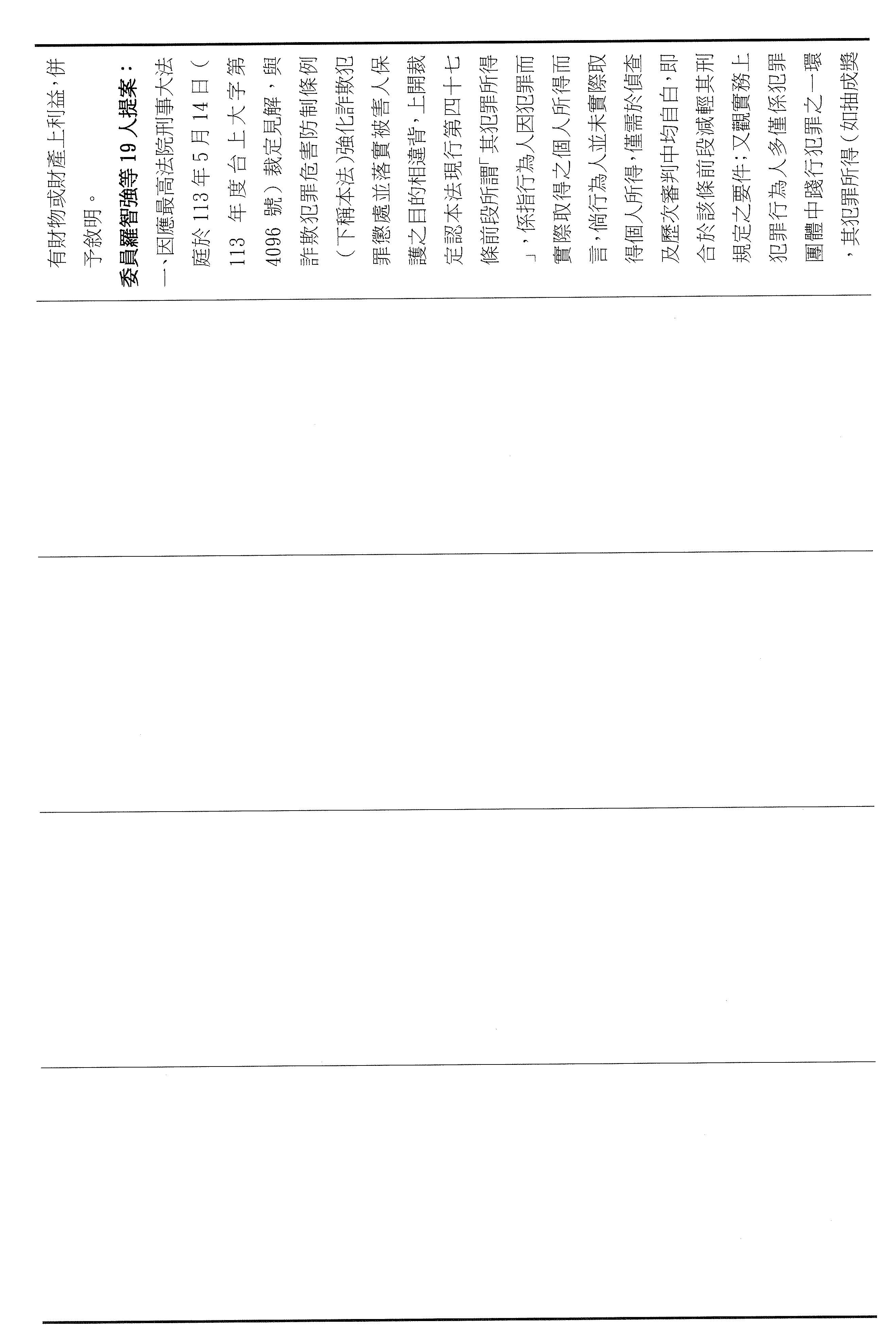 張委員智倫:主席、各位同仁。本席跟17位委員連署,針對現行詐欺犯罪防制條例第四十六條及第四十七條提出修正草案,目的是為填補現在司法實務上的漏洞,也真正落實被害人損害填補的立法初衷。首先,剛剛很多委員提到,最高法院刑事大法庭113年的最新裁定,將減刑要件犯罪所得的解釋限縮於犯罪行為人實際獲取之個人所得,這樣的見解好像跟立法初衷不符。