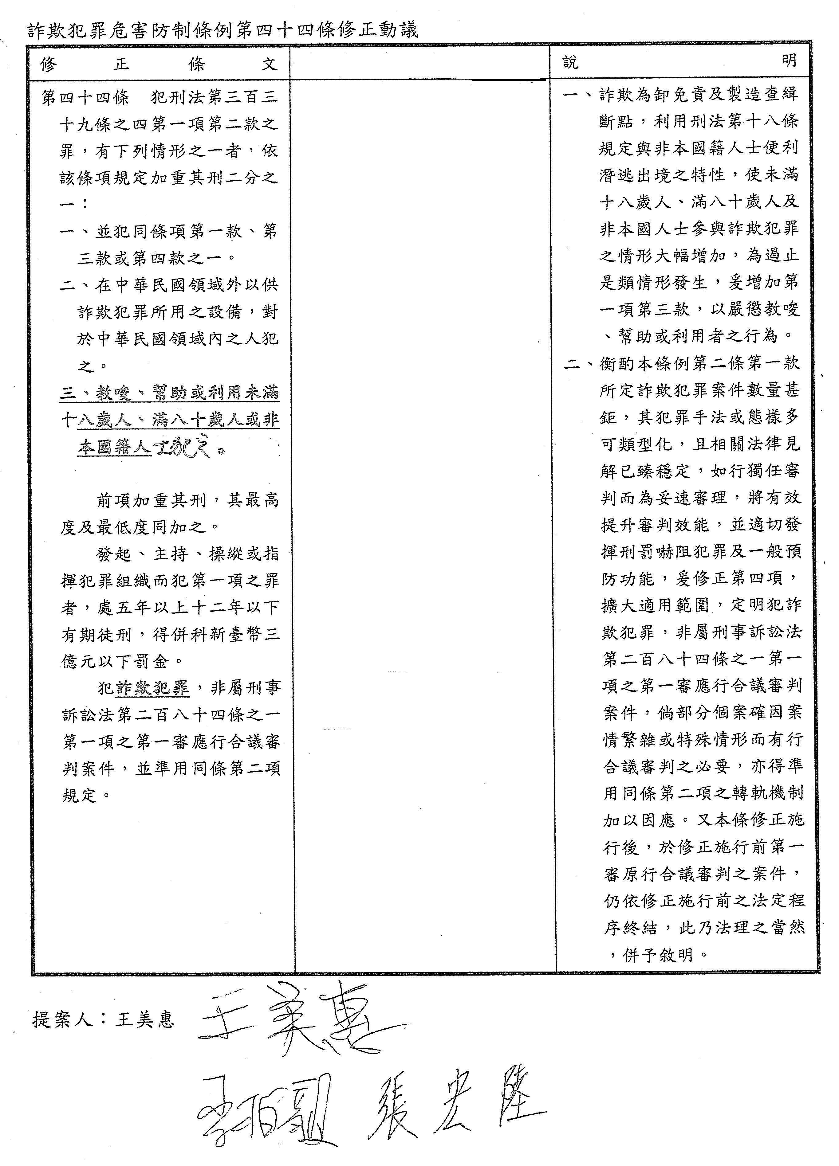 麥委員玉珍:主席,第四十四條我們有提出修正動議,針對這一條的修正我們都贊同,但是希望在行政院版中增訂第一項第三款的規範,主要也是因為詐騙集團常利用80歲以上長者或者非本國籍人士從事犯罪,這個族群比較容易受控,所以需要加重處罰,以保護弱勢,若沒有異議的話,我們建議照我們提案的修正條文通過。因為刑事警察局詐欺犯罪防制中心有提到未成年的部分,考量另外有少年事件處理法第八十五條規定,成年人教唆、幫助或利用未滿18歲之人犯罪或與之共同實施犯罪者,依其所犯之罪,加重其刑至二分之一。因此,若在本條納入是否可能就不適用少年事件處理法第八十五條,反而幫利用18歲以下之人的詐騙犯減刑?所以本席提出修正動議,暫不將未成年寫進這個法案,謝謝。