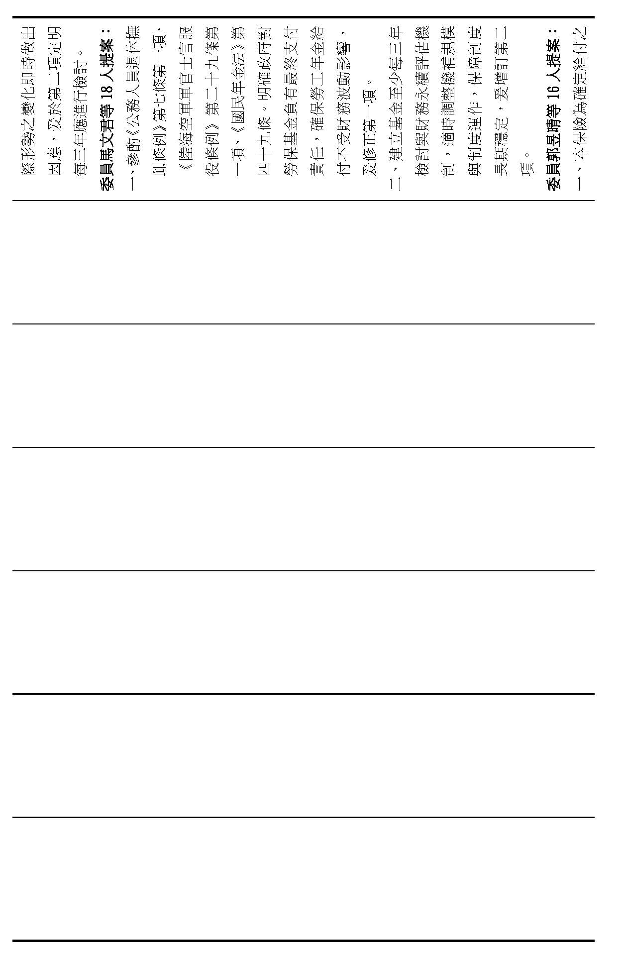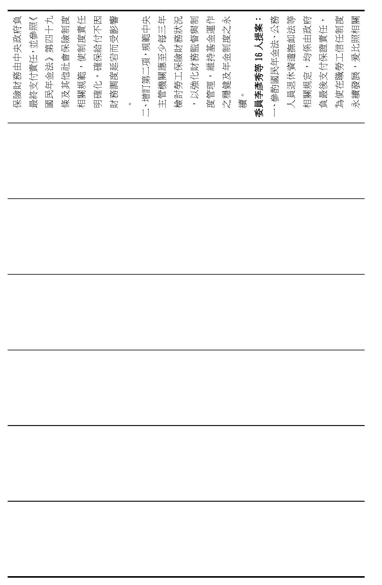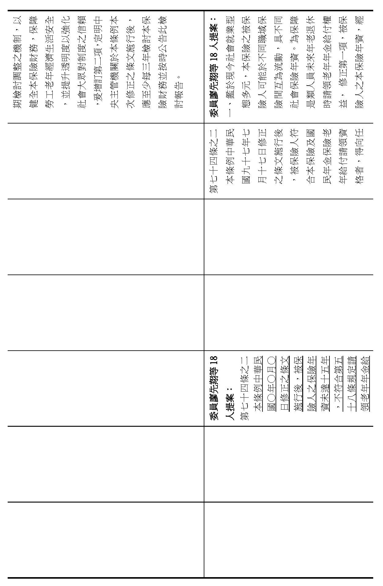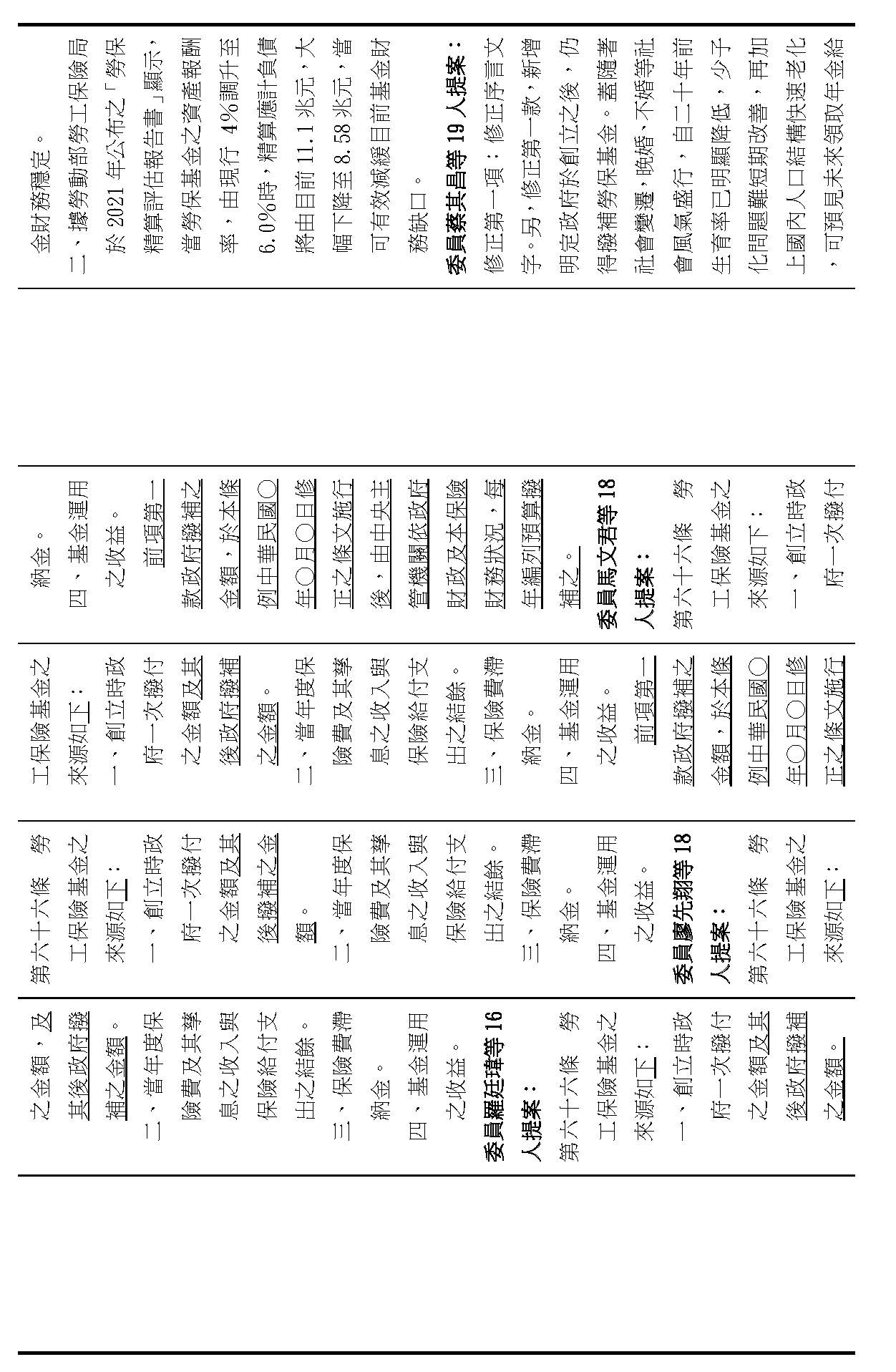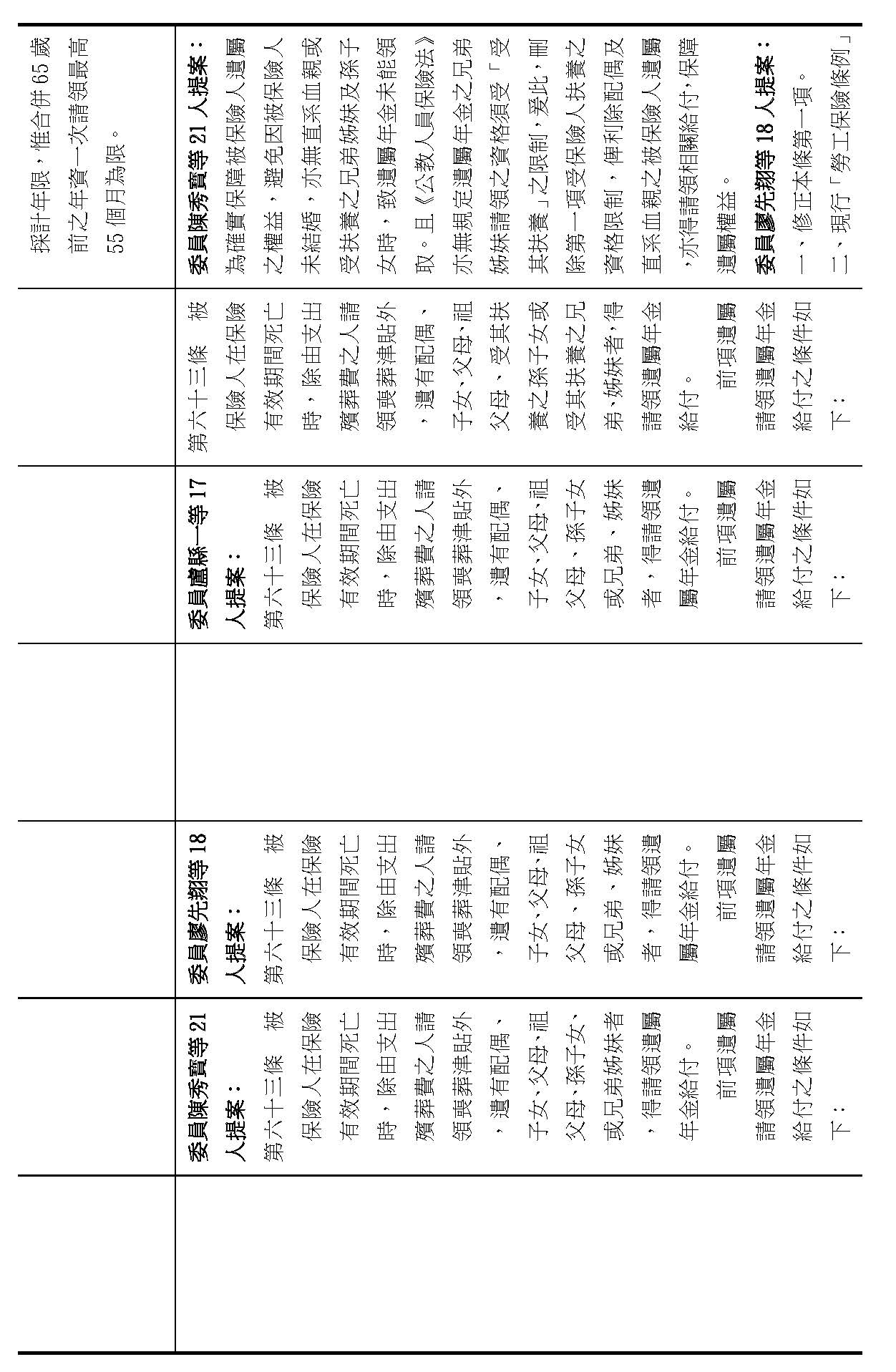 王委員正旭:對,我想委員的想法是很希望能夠對於我們的這些勞工朋友有更好的保障,不過因為提案會涉及到擴大年金整個請領的對象,而且這個請領條件也都有適度的處理,可是在給付標準的修正等等,這是屬於制度上的重大變革,所以會涉及到各個社會保險年金制度的調合、整合跟財務,所以基於政府做整體政策通盤規劃的過程裡面,這部分是不是可以用其他該有的一些處理方式,而不是在這邊做調整,以上跟大家說明,謝謝。