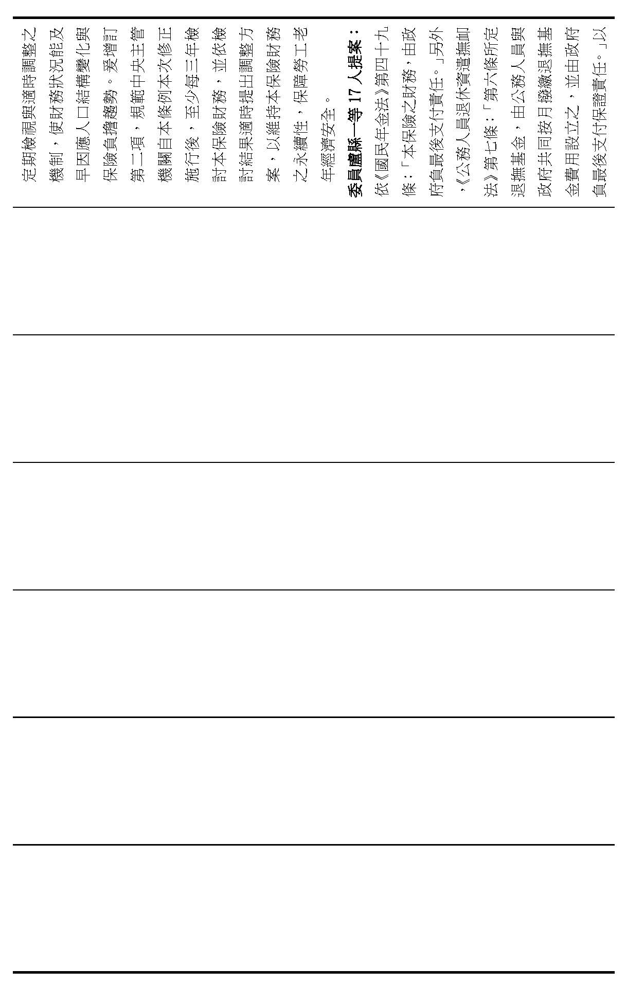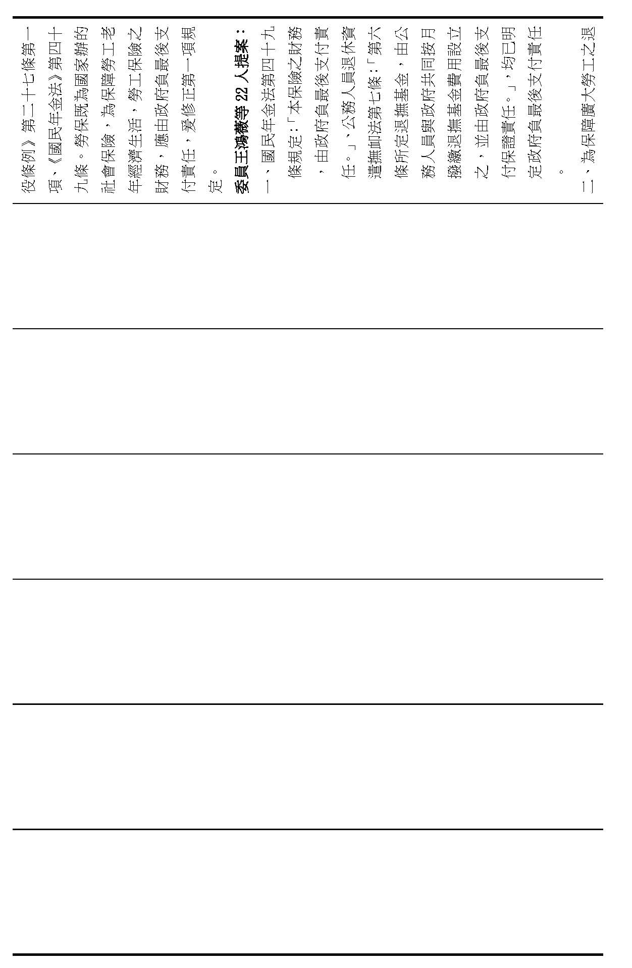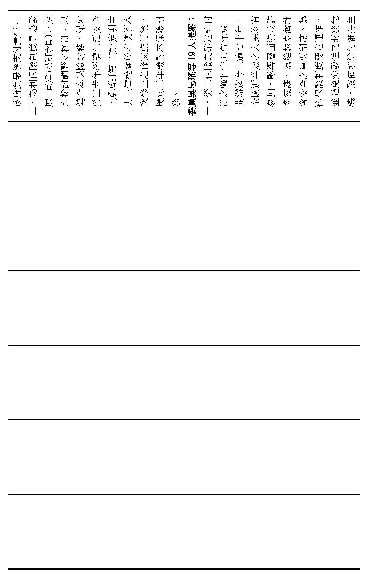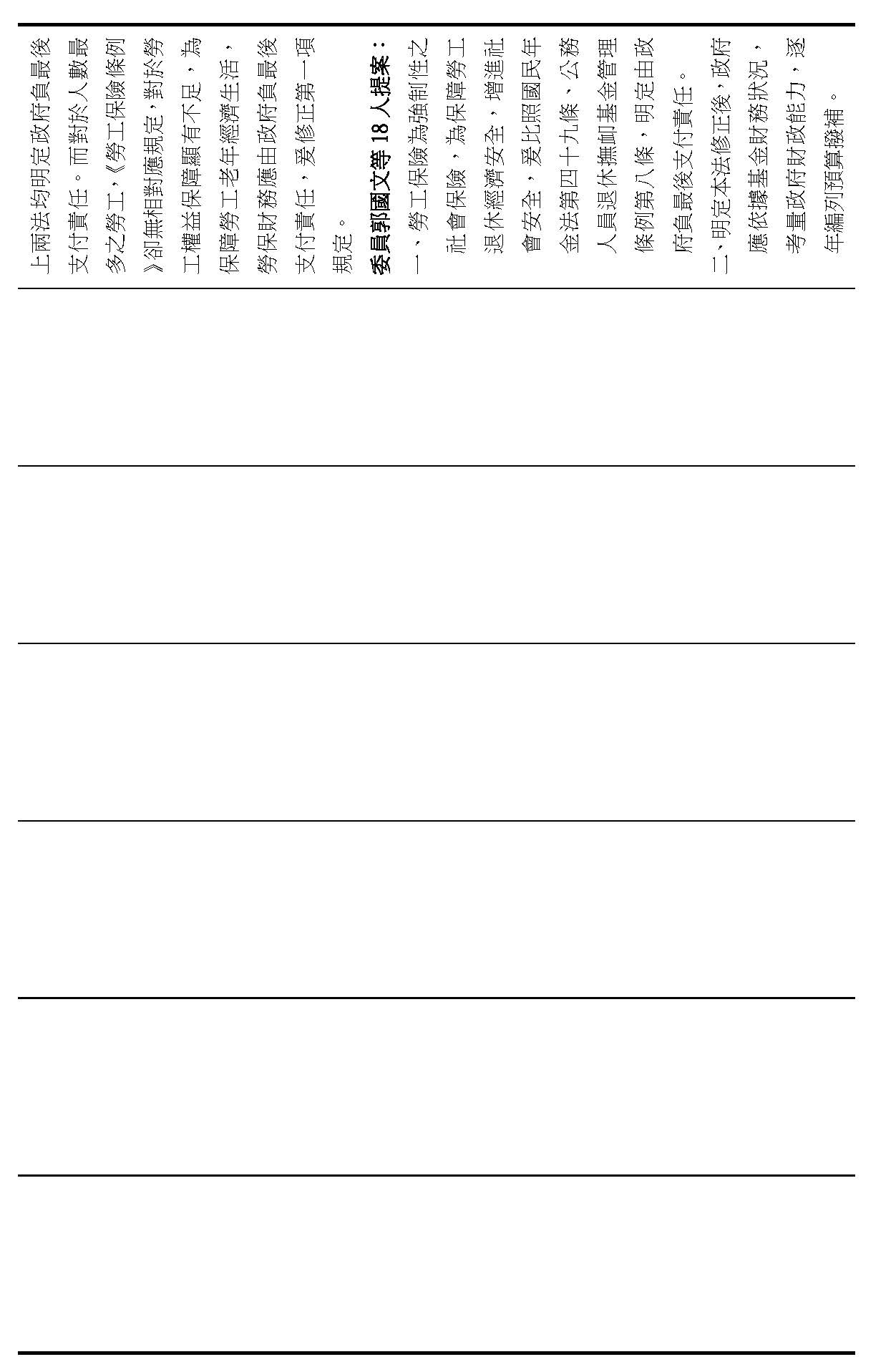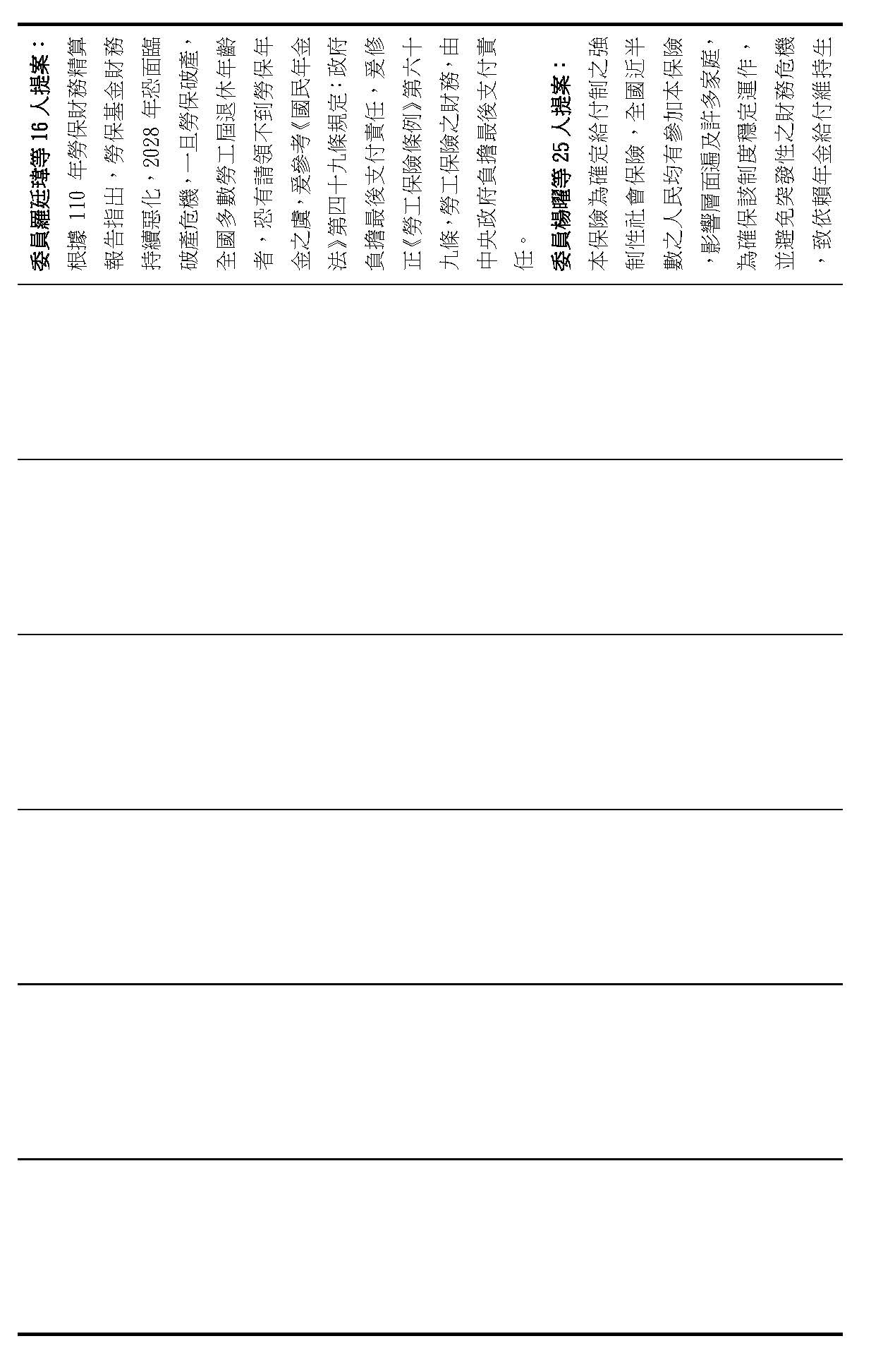 王委員正旭:對,我想委員的想法是很希望能夠對於我們的這些勞工朋友有更好的保障,不過因為提案會涉及到擴大年金整個請領的對象,而且這個請領條件也都有適度的處理,可是在給付標準的修正等等,這是屬於制度上的重大變革,所以會涉及到各個社會保險年金制度的調合、整合跟財務,所以基於政府做整體政策通盤規劃的過程裡面,這部分是不是可以用其他該有的一些處理方式,而不是在這邊做調整,以上跟大家說明,謝謝。