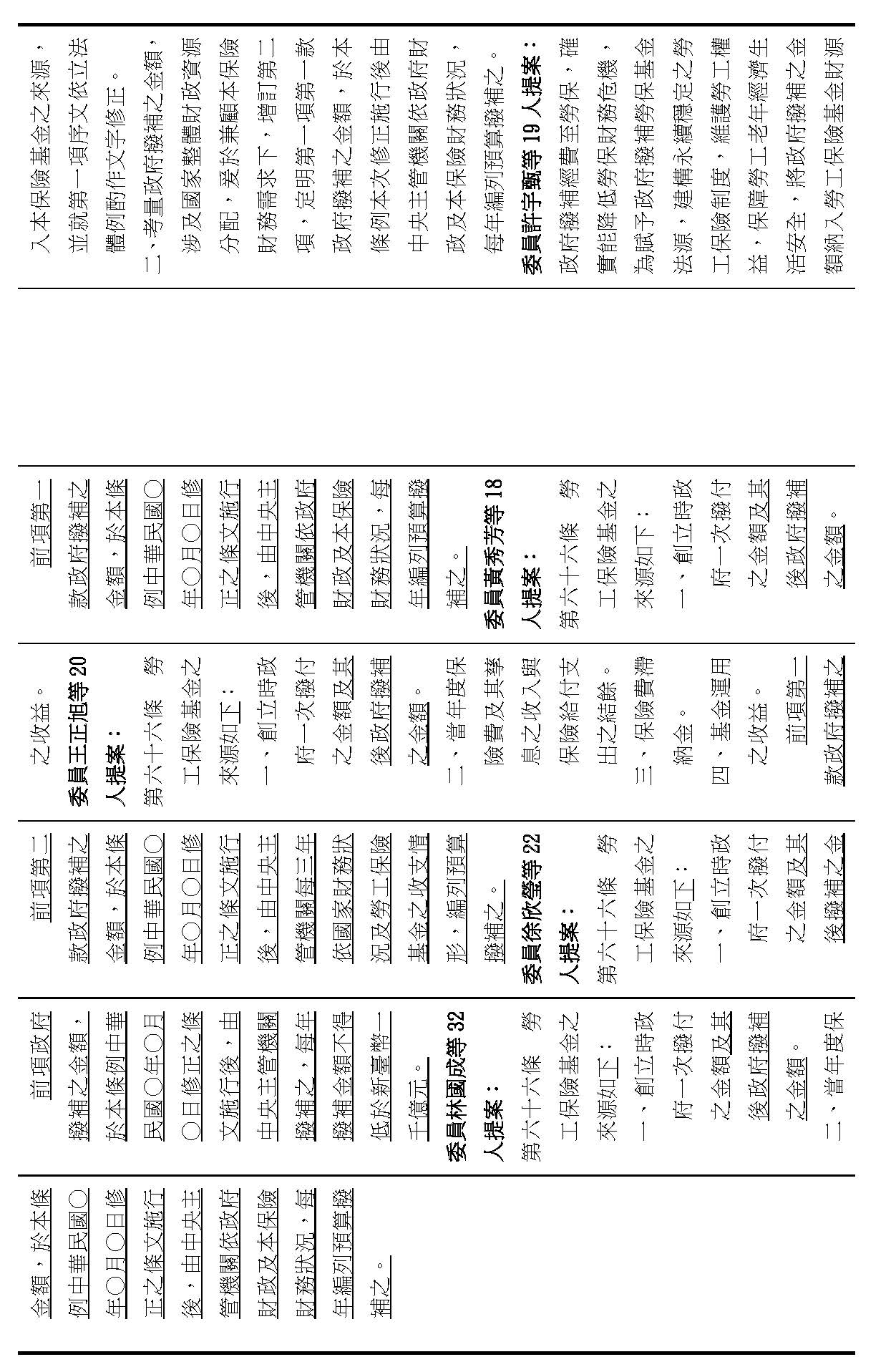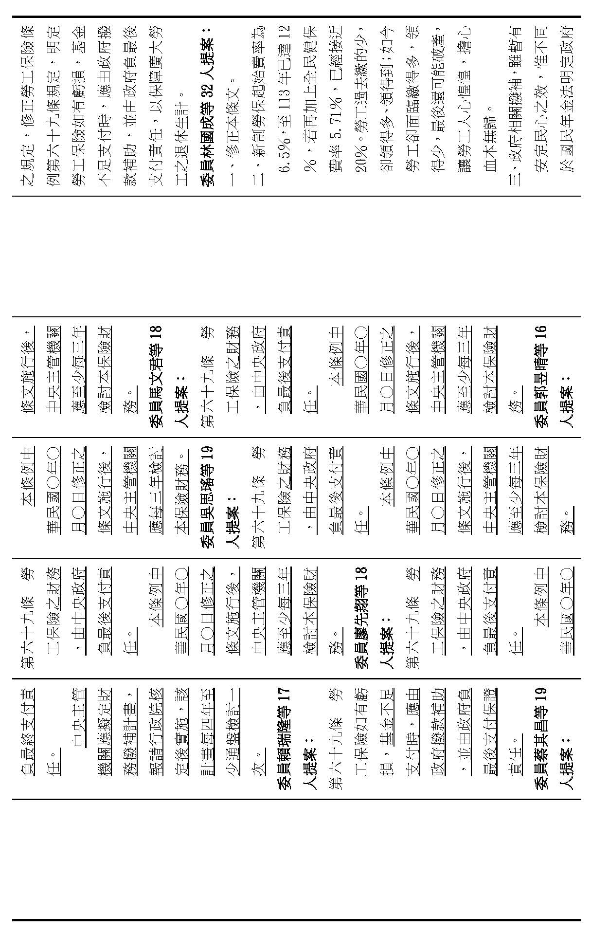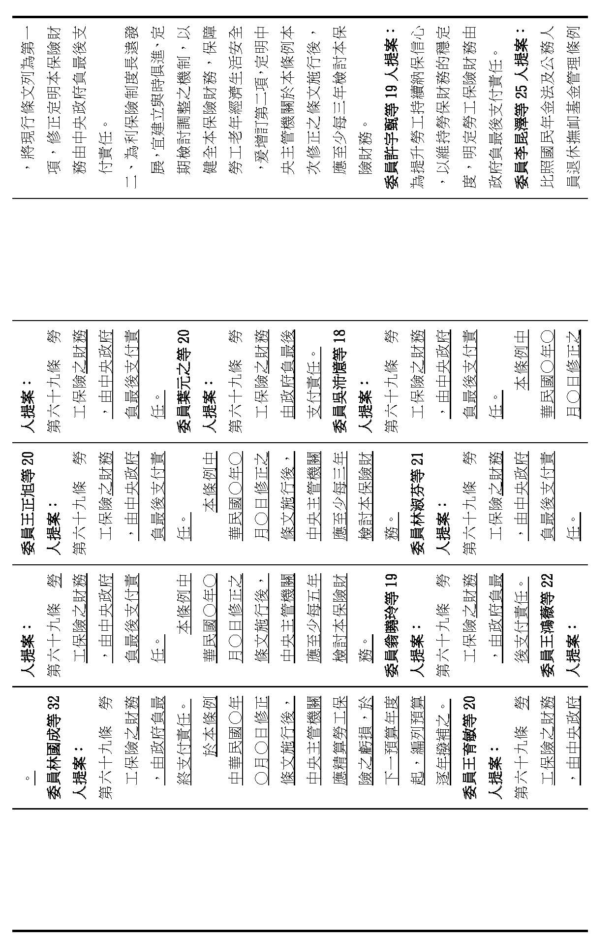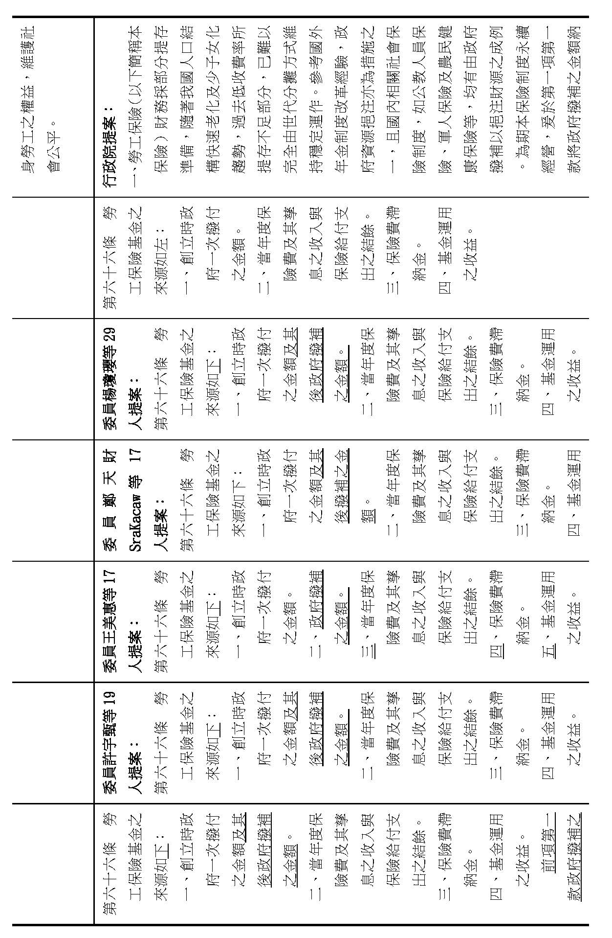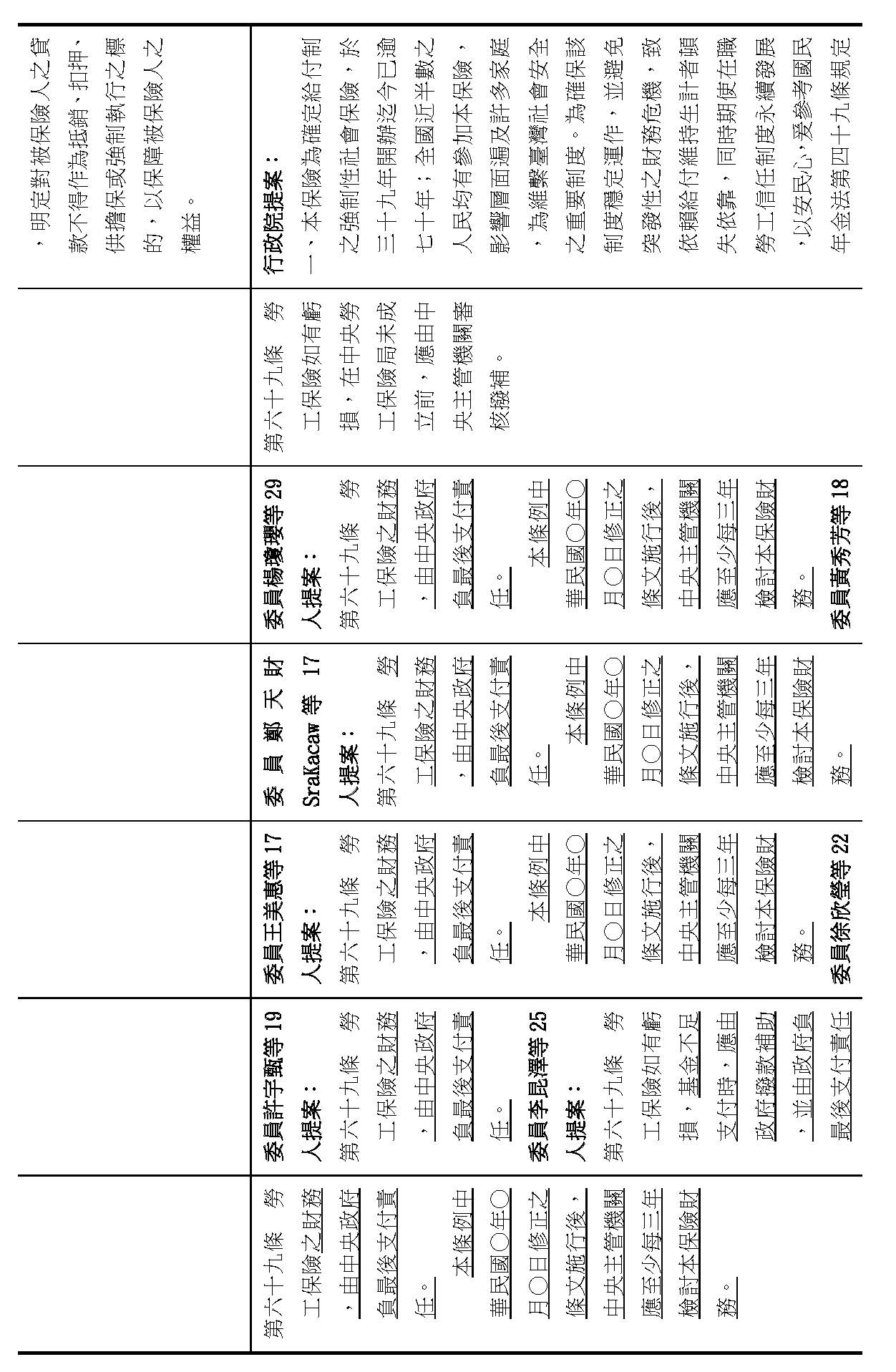 陳司長美女:跟主席及各位委員報告,在第六十九條第一項的部分,行政院的提案是「勞工保險之財務,由中央政府負最後支付責任」,各委員的版本文字略有不同,但目的都是一樣的,所以我們建議照行政院提案通過,跟行政院提案大概有一些文字上相同的,包括委員王美惠等17人、委員王鴻薇等22人、委員鄭天財等17人、委員王正旭等20人、委員吳思瑤等19人、委員李坤城等20人、委員陳俊宇等20人、委員李彥秀等16人、委員陳培瑜等17人、委員楊瓊瓔等29人、委員吳沛憶等18人及委員馬文君等18人的提案通過。