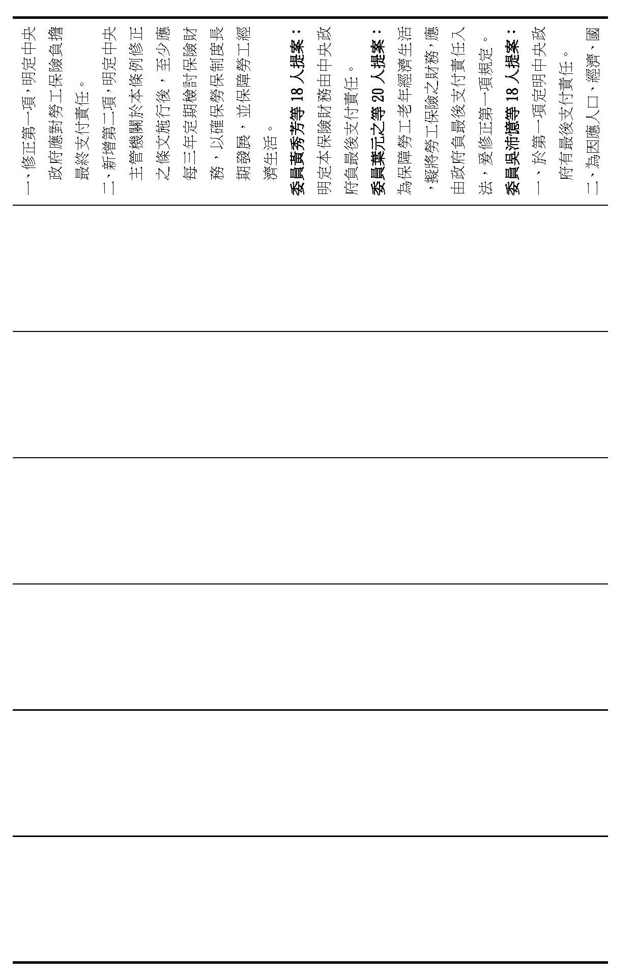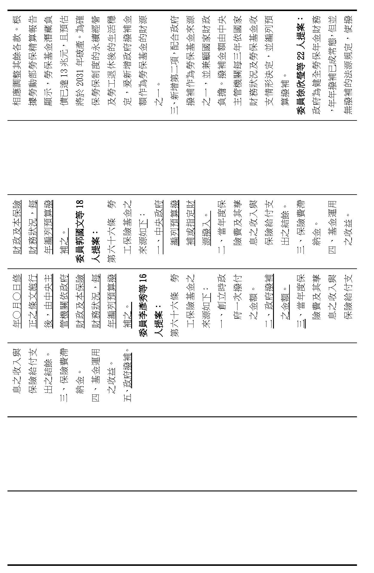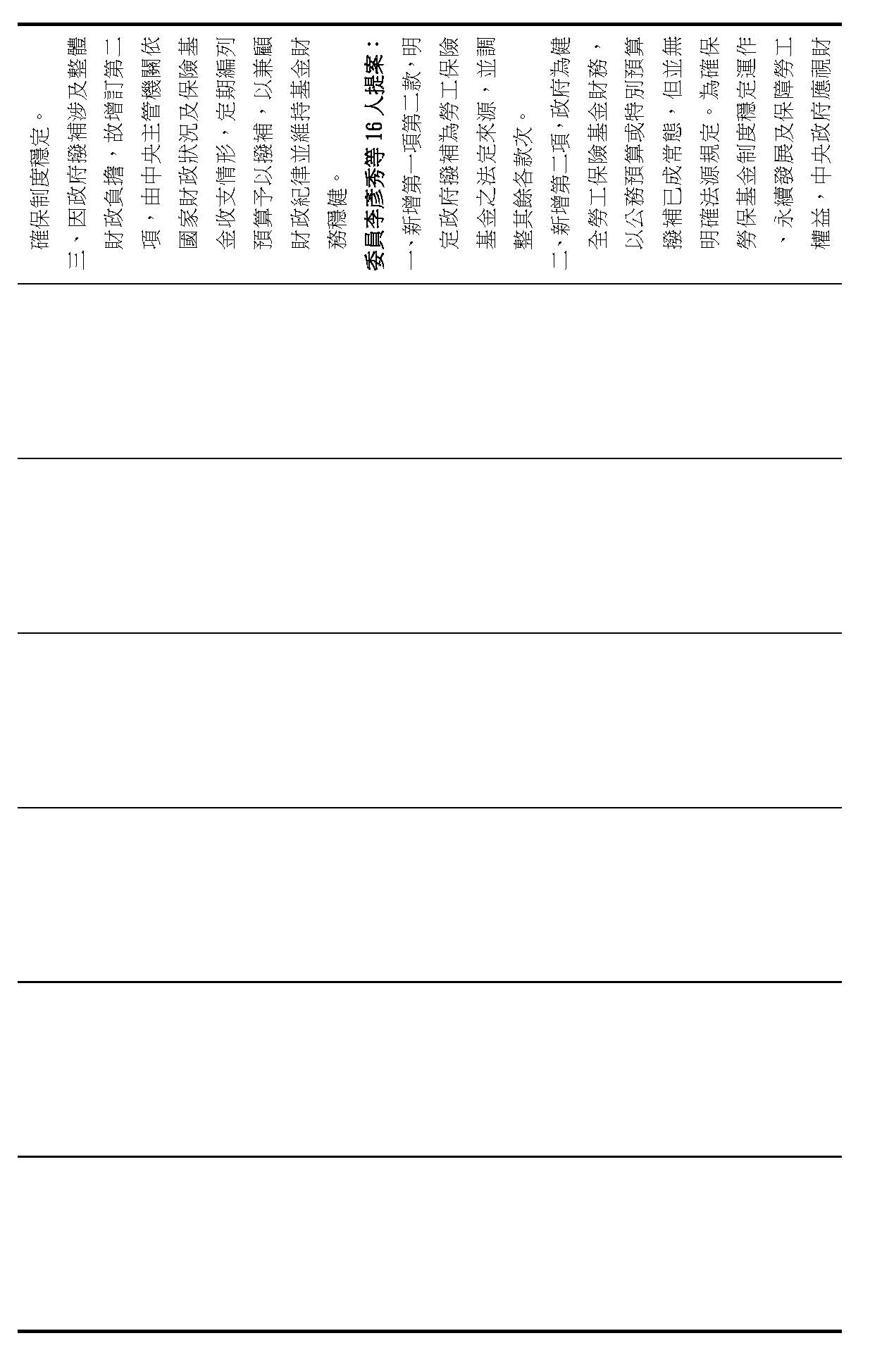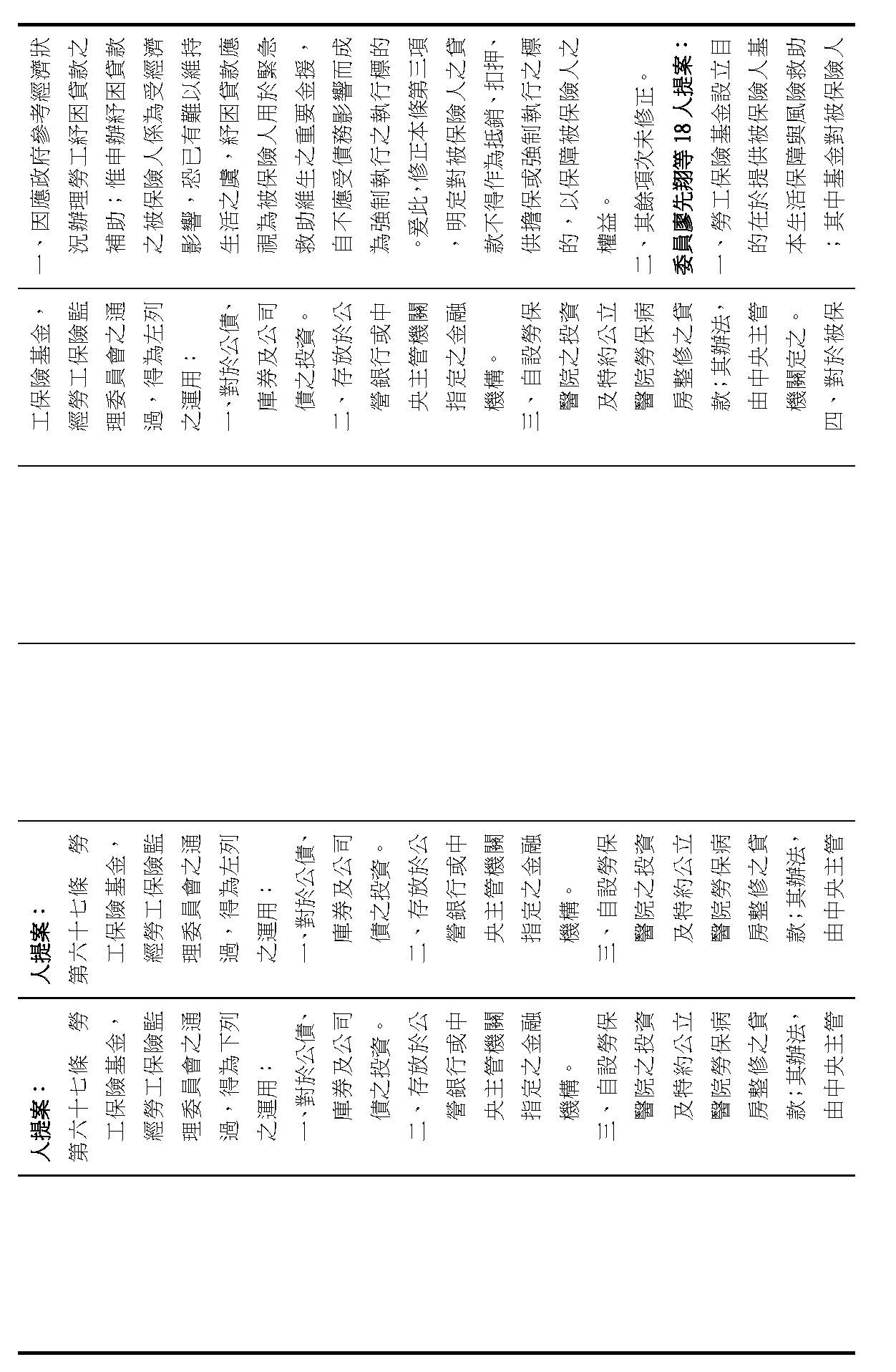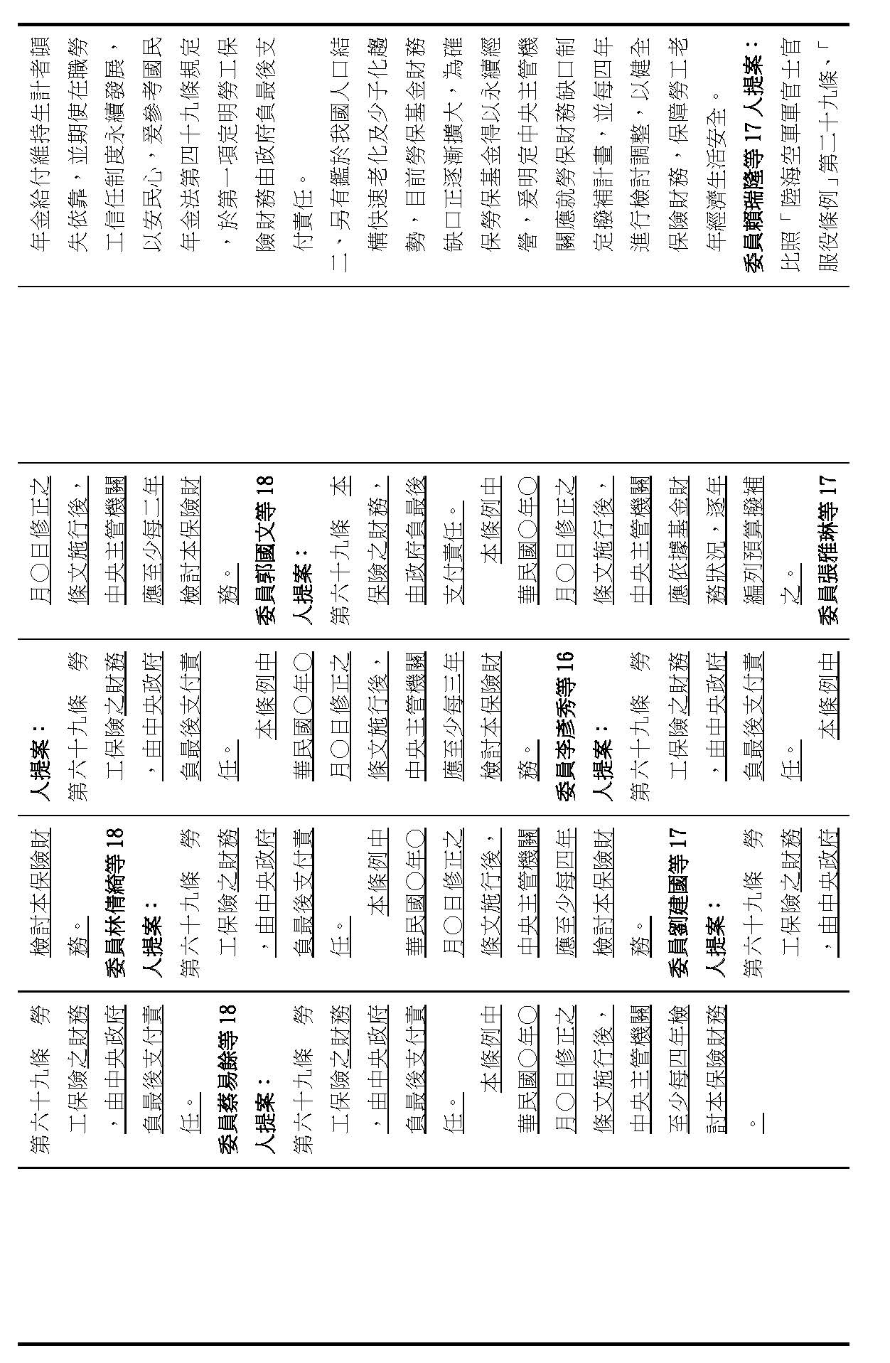 陳司長美女:跟主席及各位委員報告,在第六十九條第一項的部分,行政院的提案是「勞工保險之財務,由中央政府負最後支付責任」,各委員的版本文字略有不同,但目的都是一樣的,所以我們建議照行政院提案通過,跟行政院提案大概有一些文字上相同的,包括委員王美惠等17人、委員王鴻薇等22人、委員鄭天財等17人、委員王正旭等20人、委員吳思瑤等19人、委員李坤城等20人、委員陳俊宇等20人、委員李彥秀等16人、委員陳培瑜等17人、委員楊瓊瓔等29人、委員吳沛憶等18人及委員馬文君等18人的提案通過。