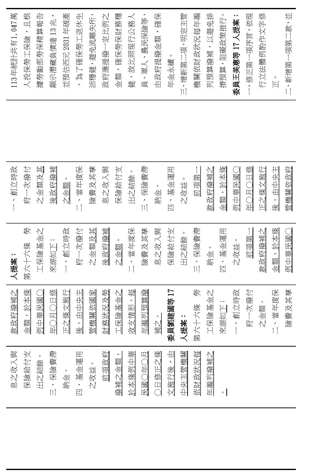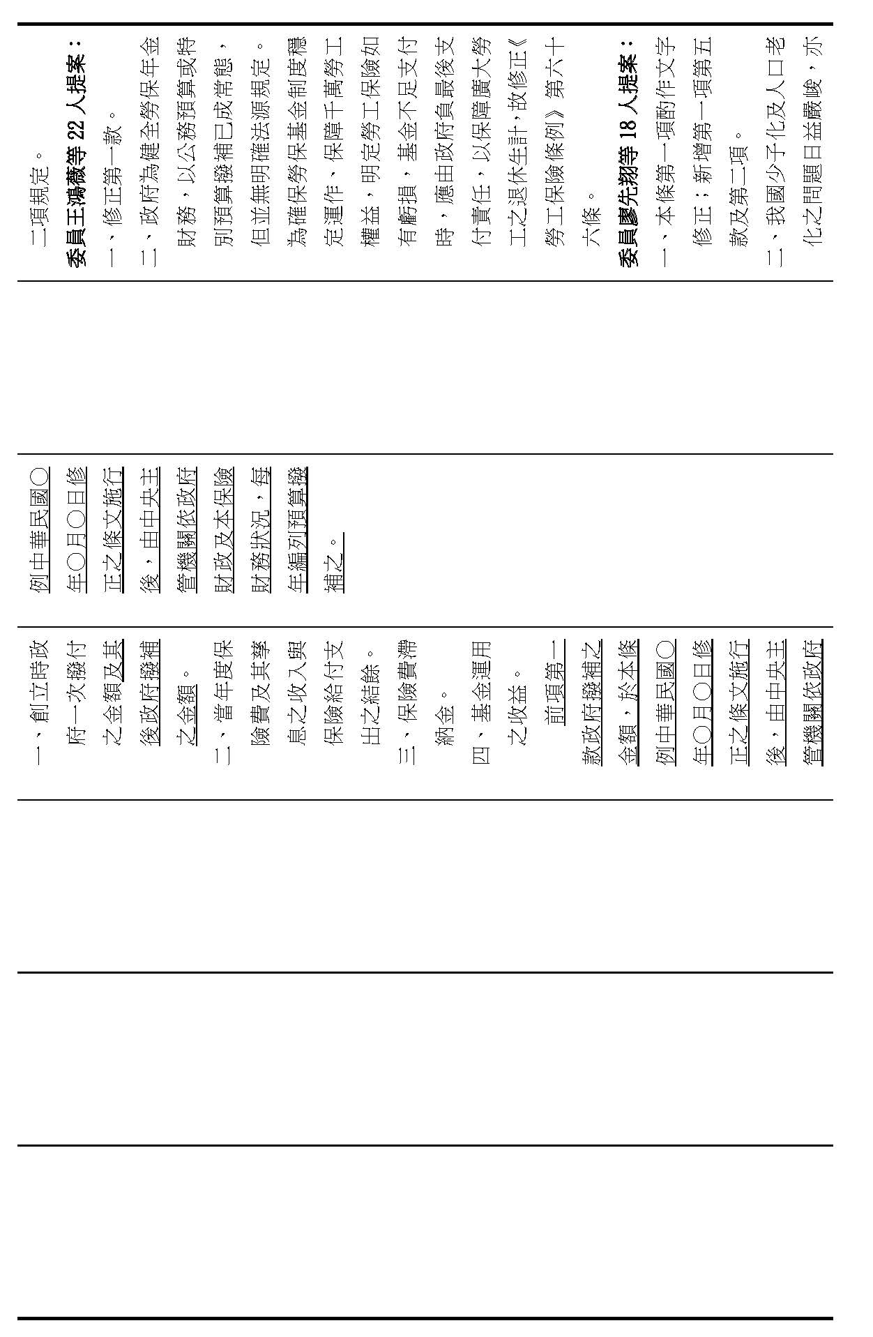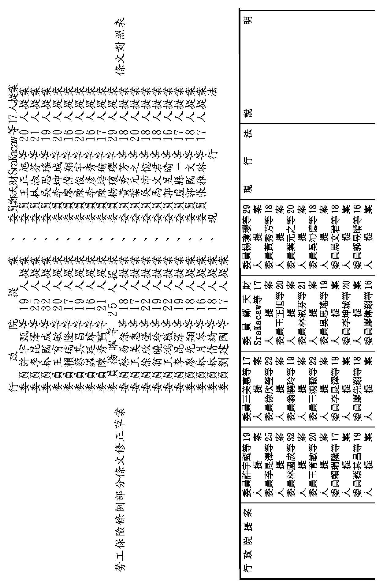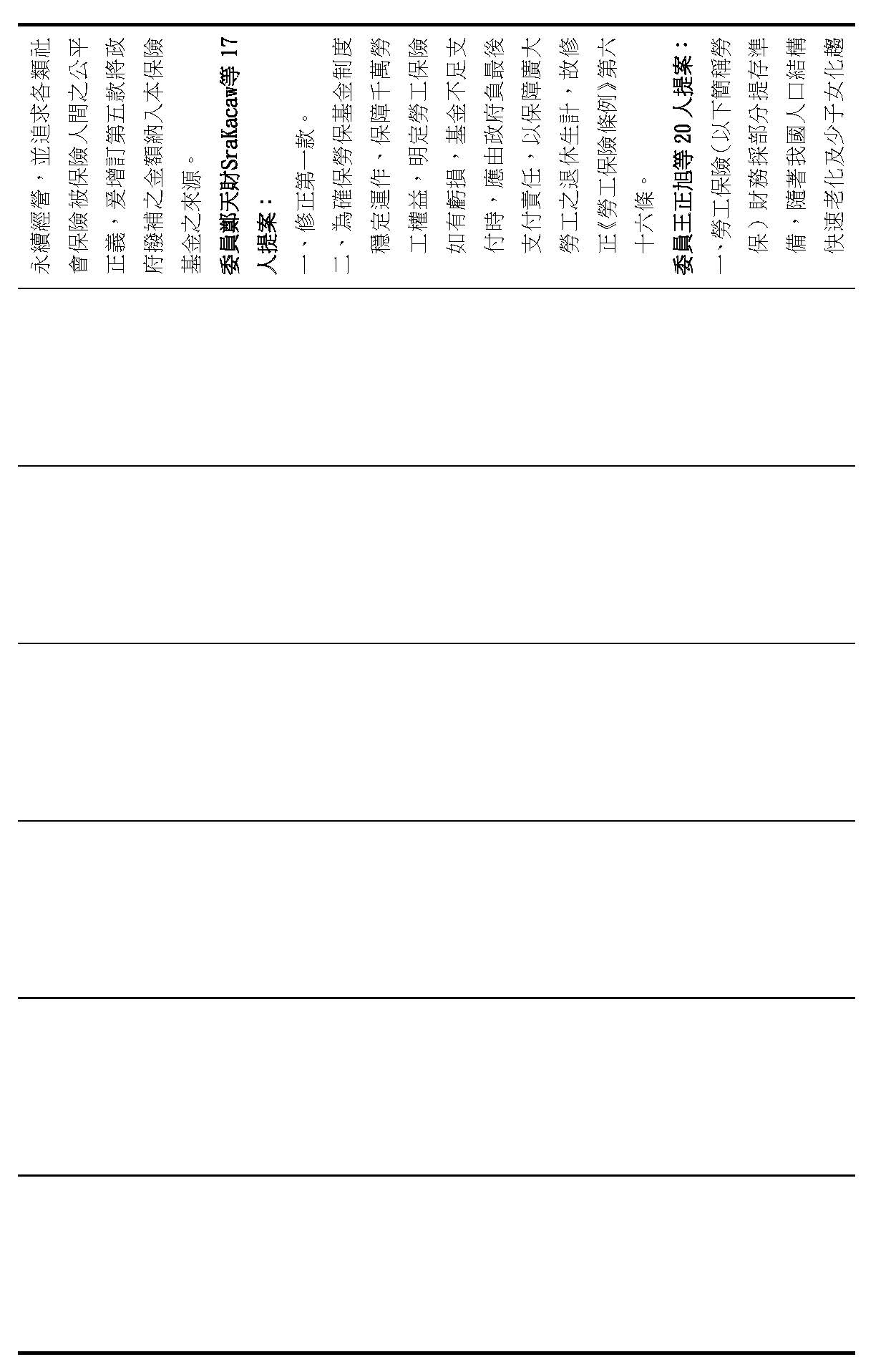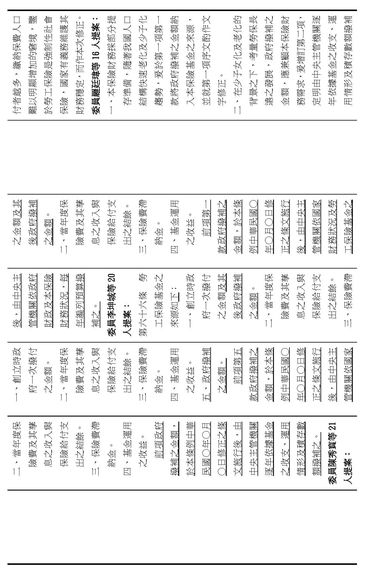 陳司長美女:跟主席及各位委員報告,在第六十九條第一項的部分,行政院的提案是「勞工保險之財務,由中央政府負最後支付責任」,各委員的版本文字略有不同,但目的都是一樣的,所以我們建議照行政院提案通過,跟行政院提案大概有一些文字上相同的,包括委員王美惠等17人、委員王鴻薇等22人、委員鄭天財等17人、委員王正旭等20人、委員吳思瑤等19人、委員李坤城等20人、委員陳俊宇等20人、委員李彥秀等16人、委員陳培瑜等17人、委員楊瓊瓔等29人、委員吳沛憶等18人及委員馬文君等18人的提案通過。
