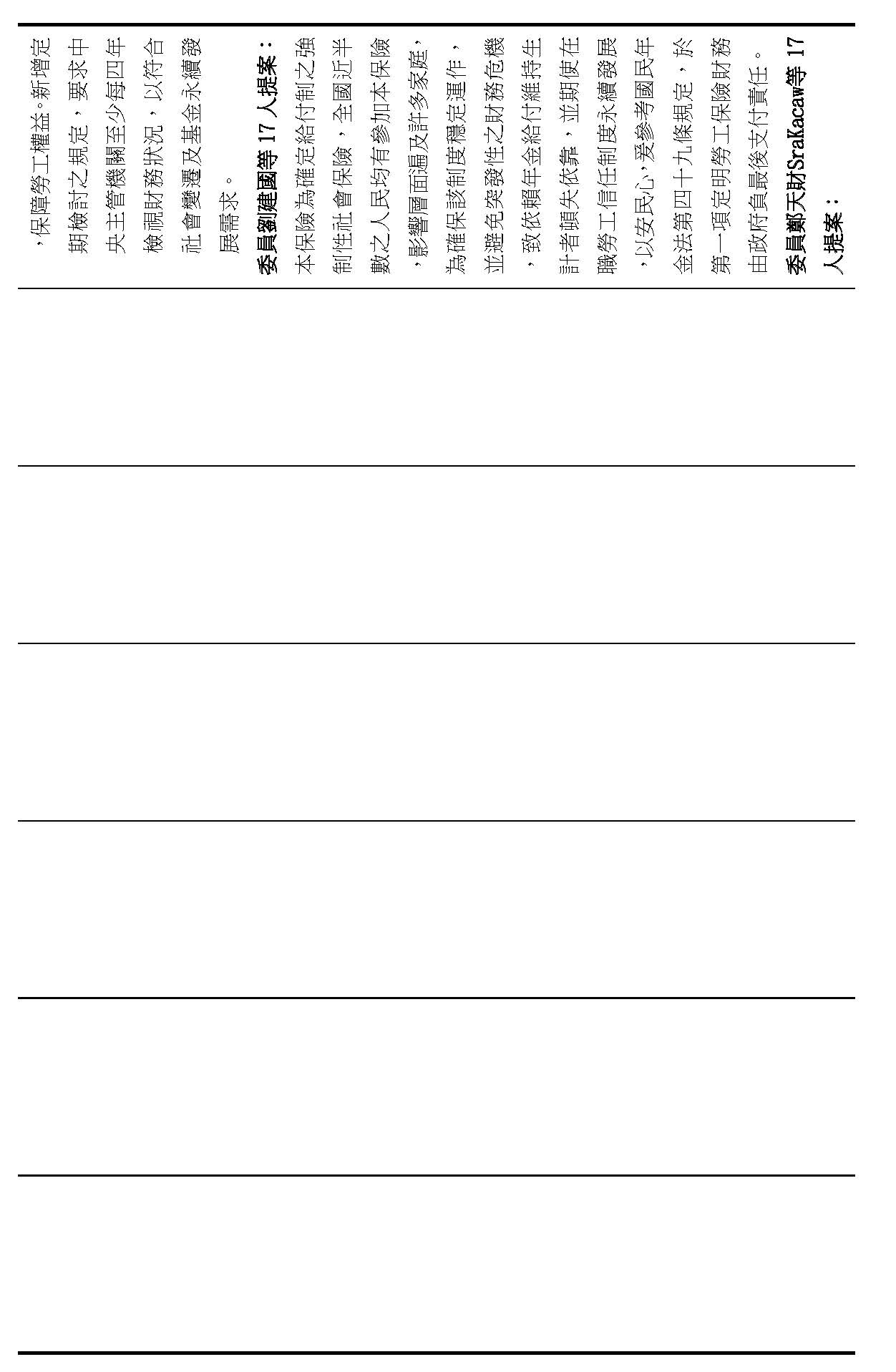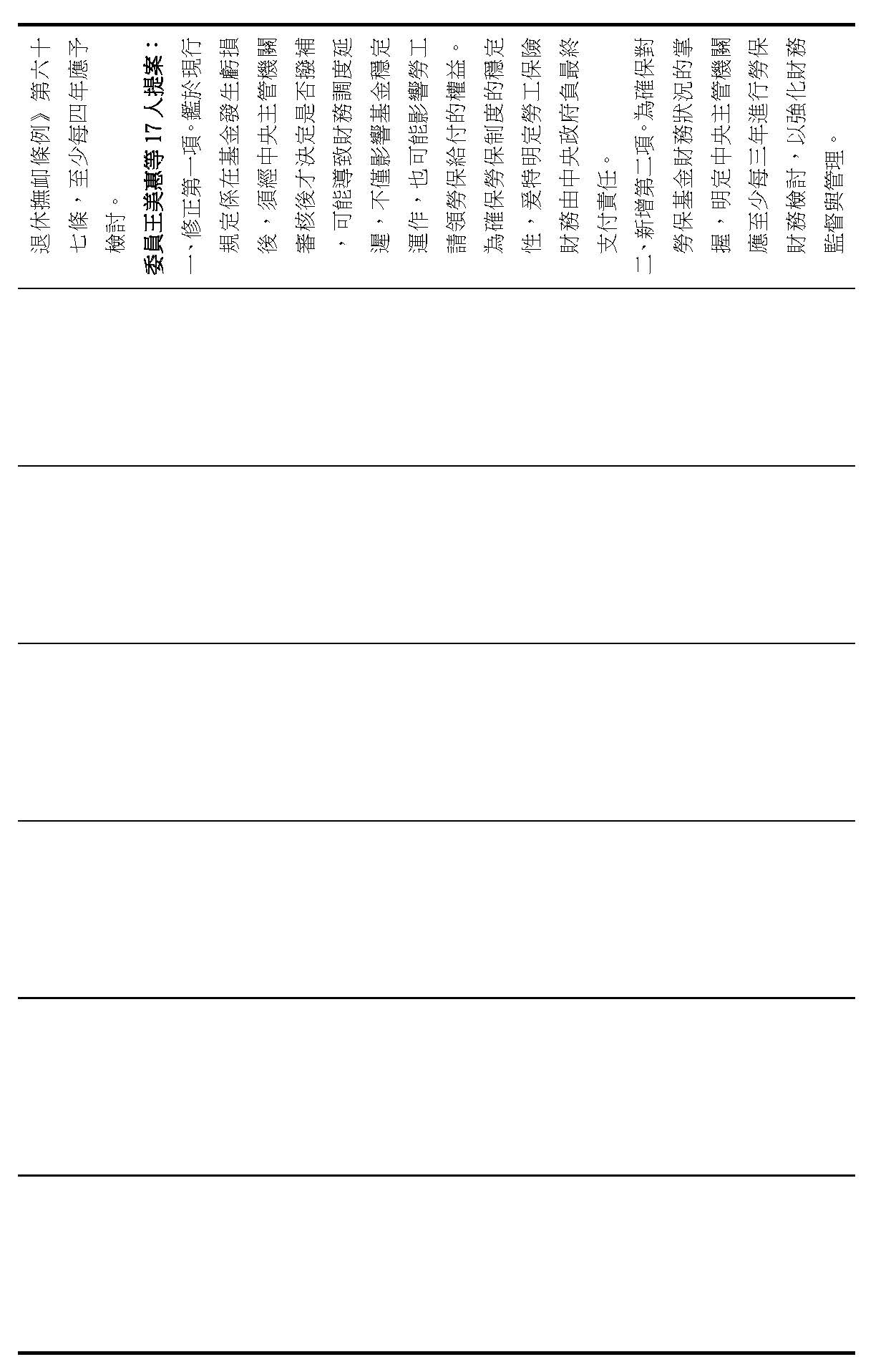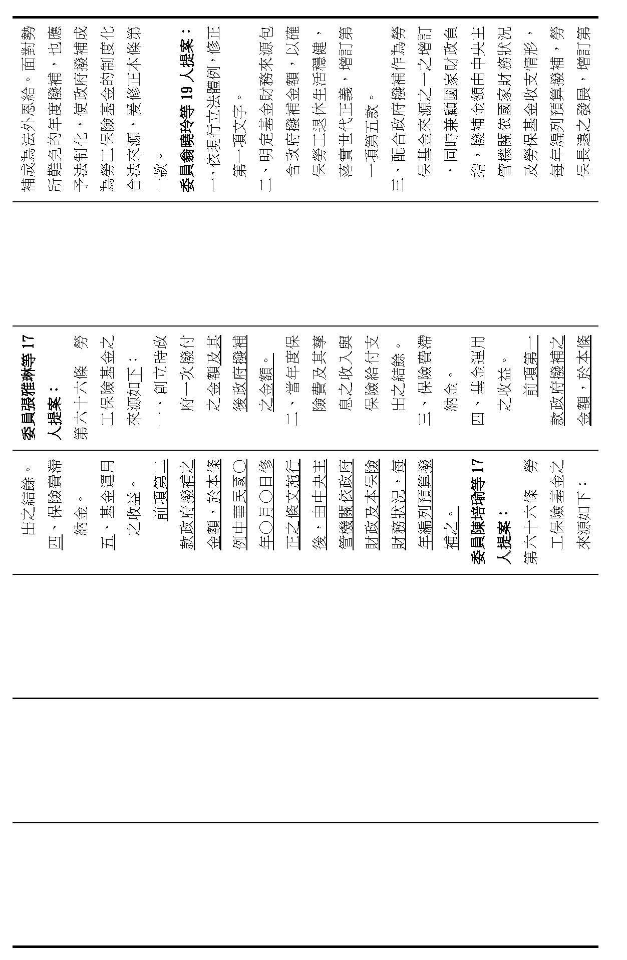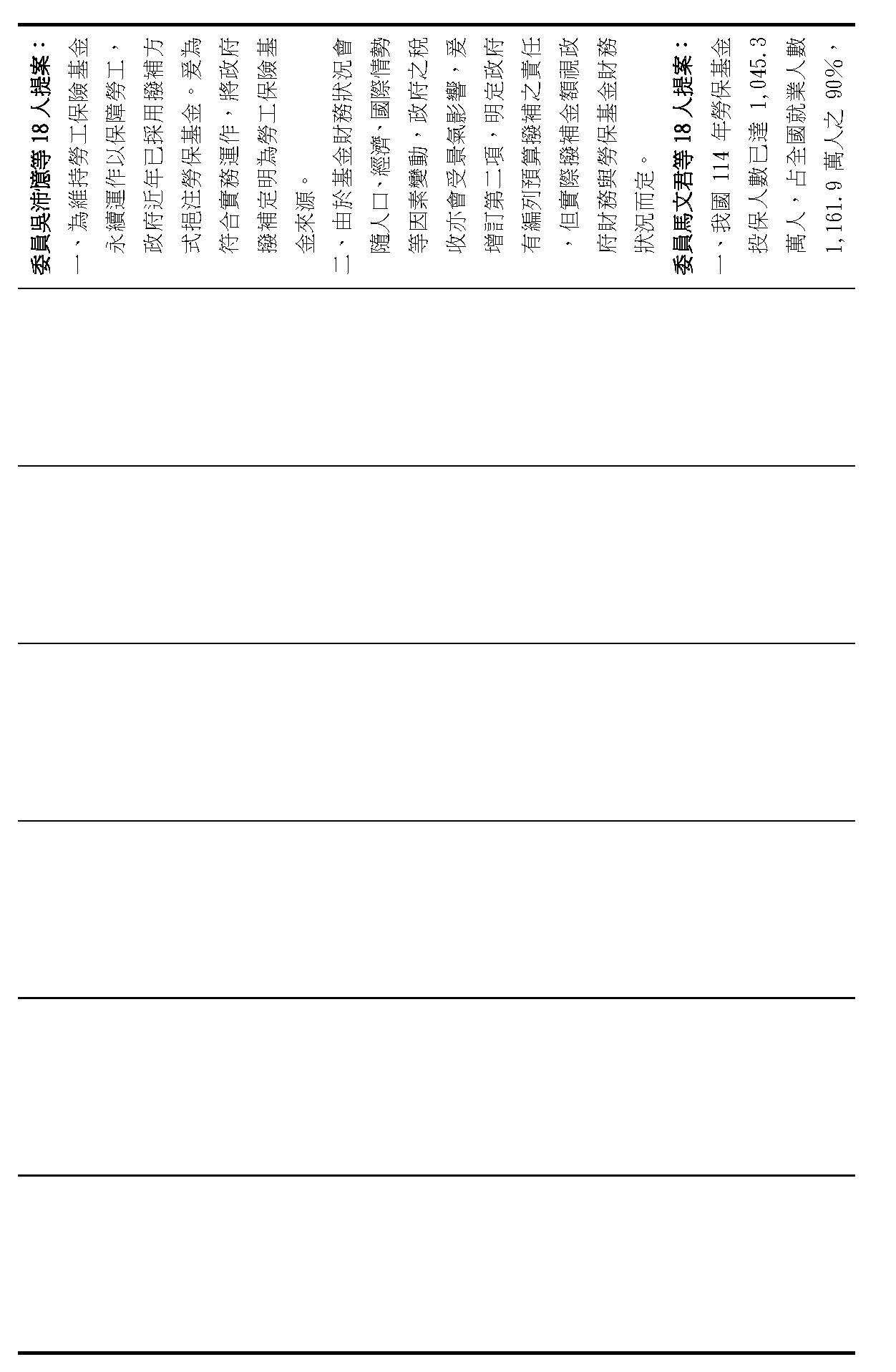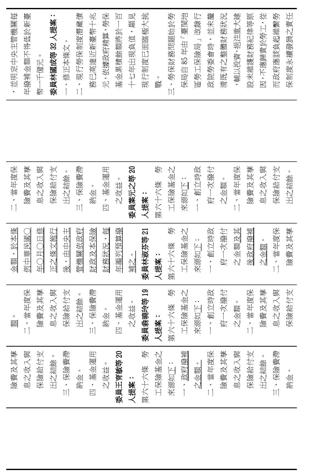 陳司長美女:跟主席及各位委員報告,在第六十九條第一項的部分,行政院的提案是「勞工保險之財務,由中央政府負最後支付責任」,各委員的版本文字略有不同,但目的都是一樣的,所以我們建議照行政院提案通過,跟行政院提案大概有一些文字上相同的,包括委員王美惠等17人、委員王鴻薇等22人、委員鄭天財等17人、委員王正旭等20人、委員吳思瑤等19人、委員李坤城等20人、委員陳俊宇等20人、委員李彥秀等16人、委員陳培瑜等17人、委員楊瓊瓔等29人、委員吳沛憶等18人及委員馬文君等18人的提案通過。