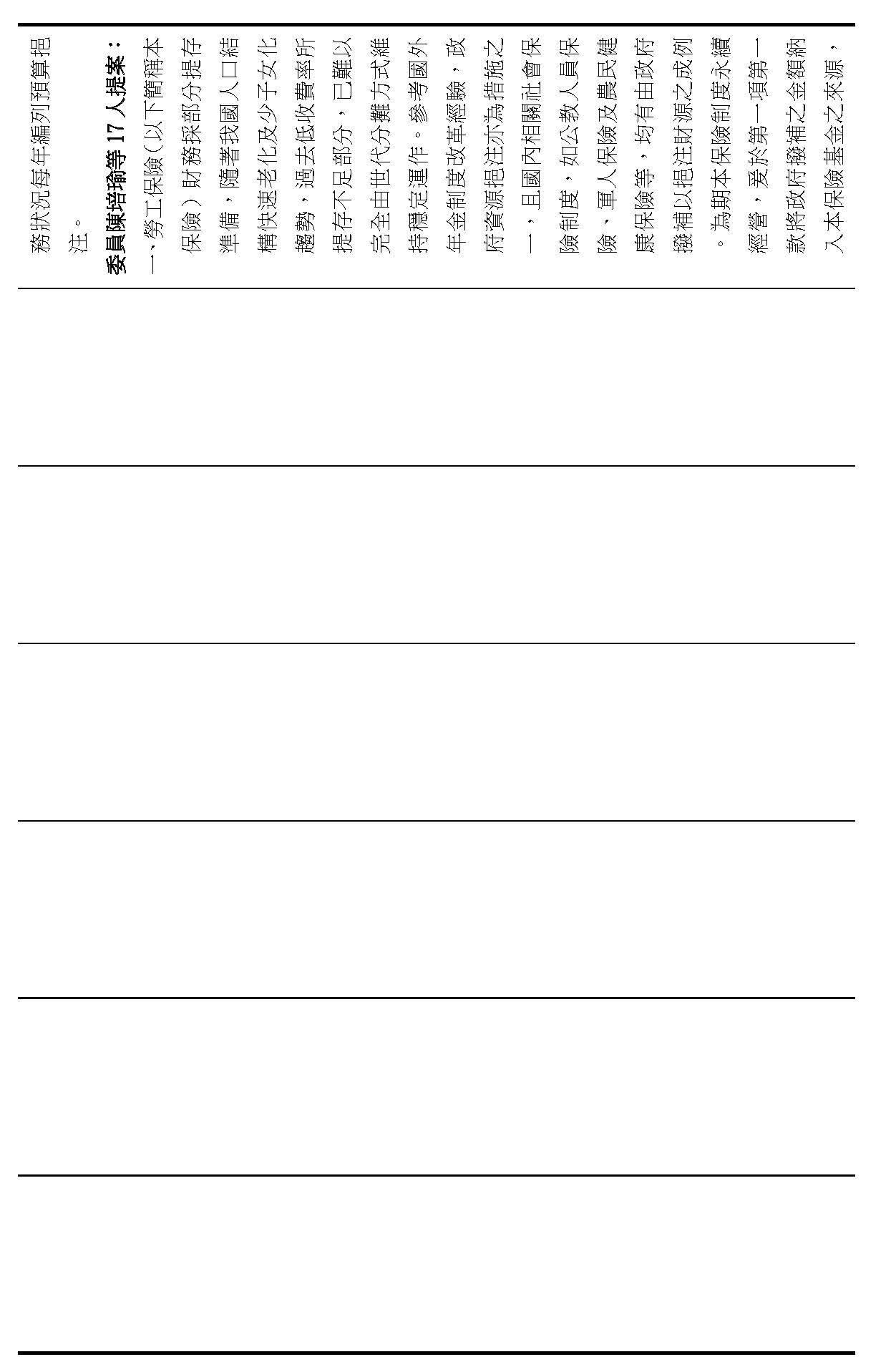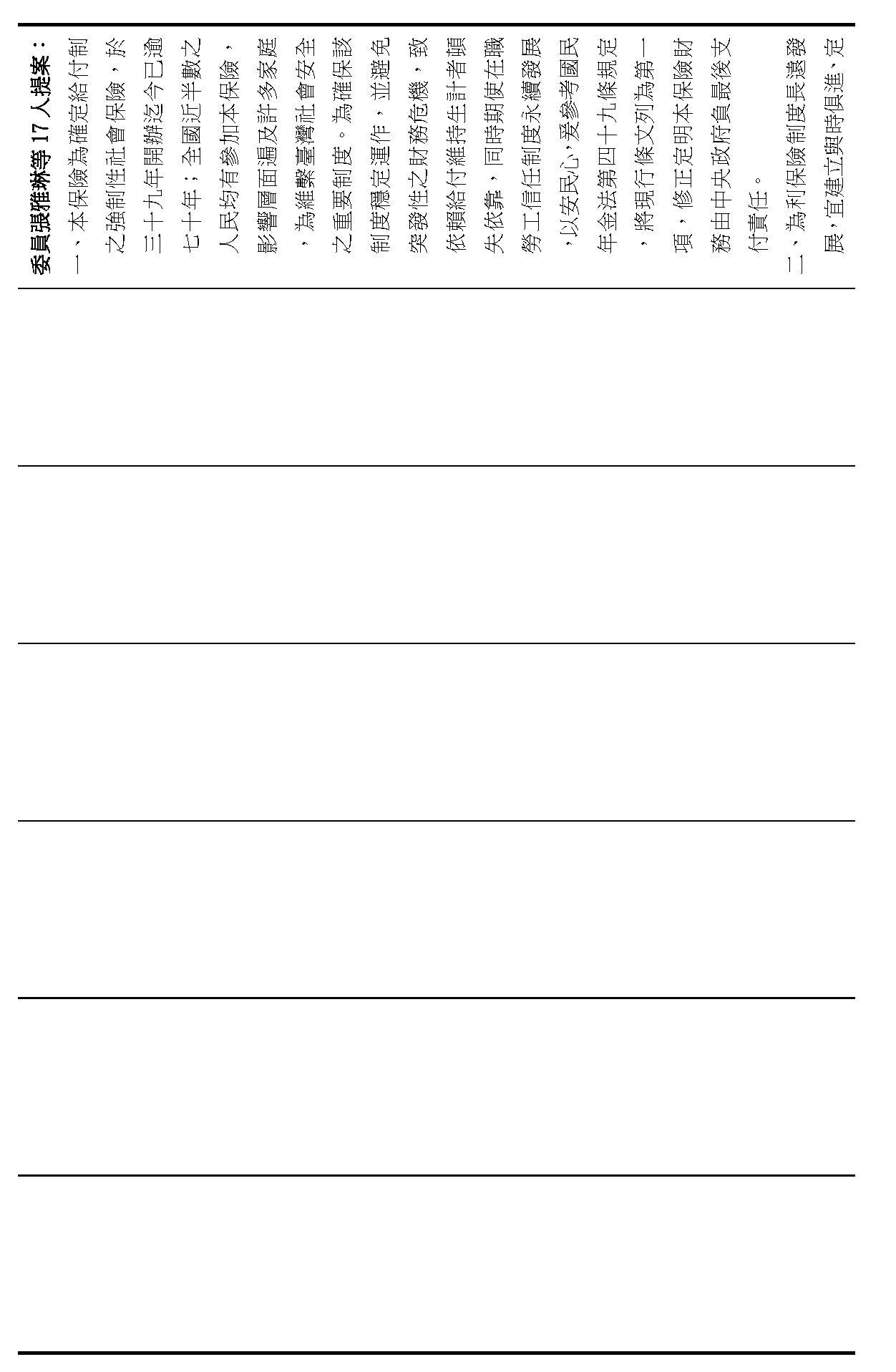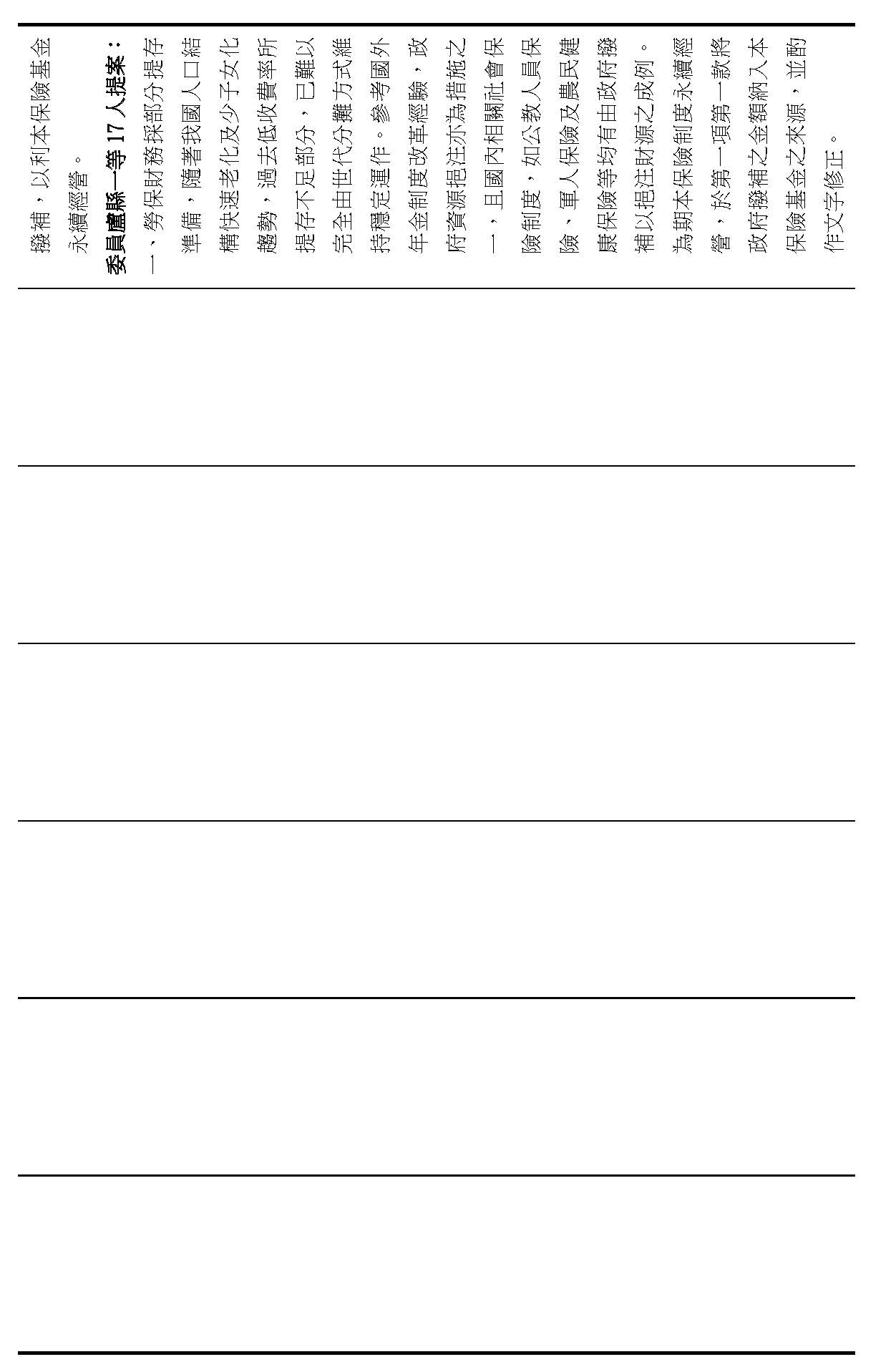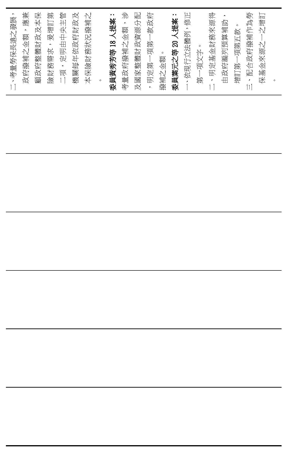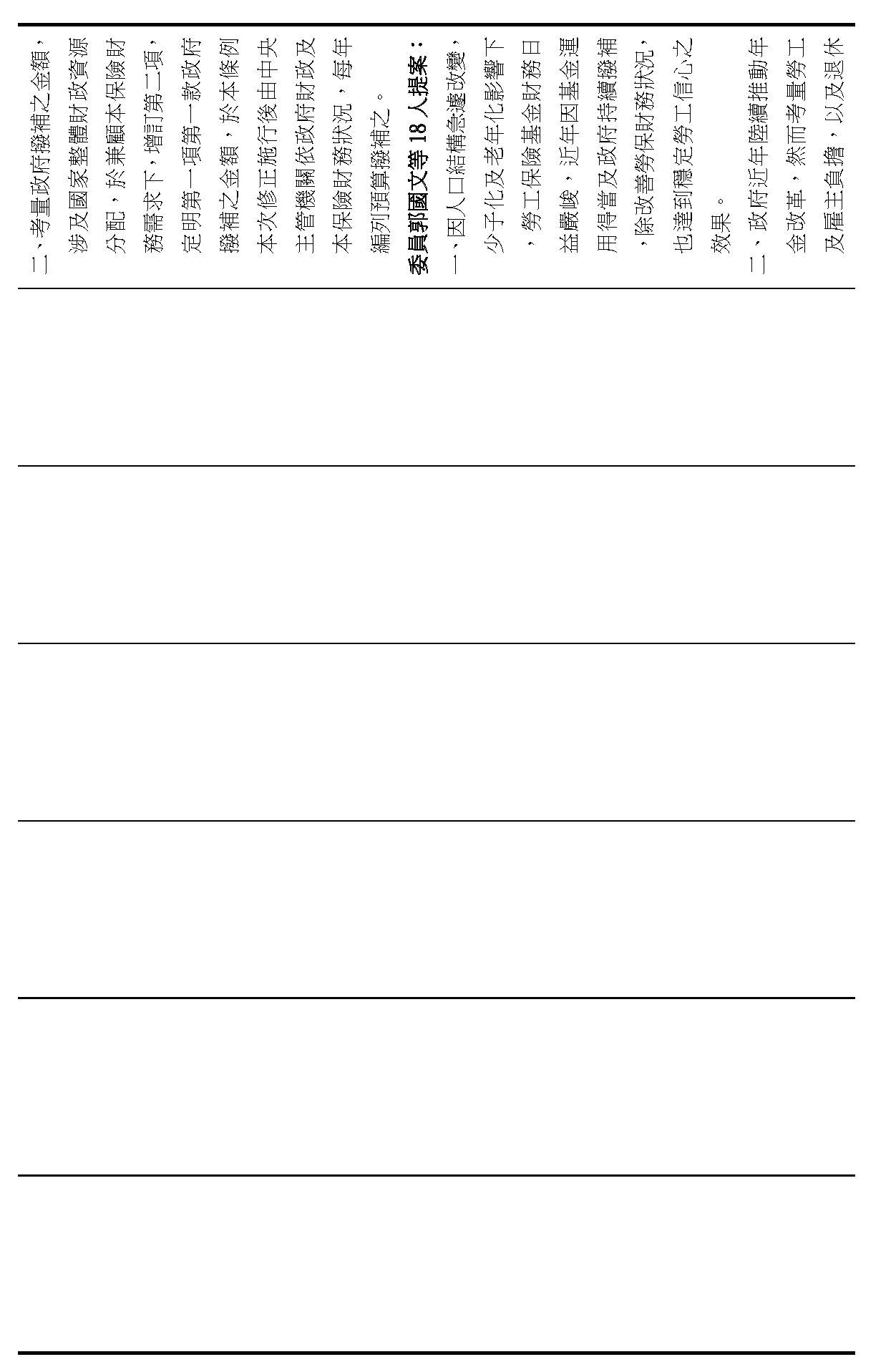 陳司長美女:跟主席及各位委員報告,在第六十九條第一項的部分,行政院的提案是「勞工保險之財務,由中央政府負最後支付責任」,各委員的版本文字略有不同,但目的都是一樣的,所以我們建議照行政院提案通過,跟行政院提案大概有一些文字上相同的,包括委員王美惠等17人、委員王鴻薇等22人、委員鄭天財等17人、委員王正旭等20人、委員吳思瑤等19人、委員李坤城等20人、委員陳俊宇等20人、委員李彥秀等16人、委員陳培瑜等17人、委員楊瓊瓔等29人、委員吳沛憶等18人及委員馬文君等18人的提案通過。