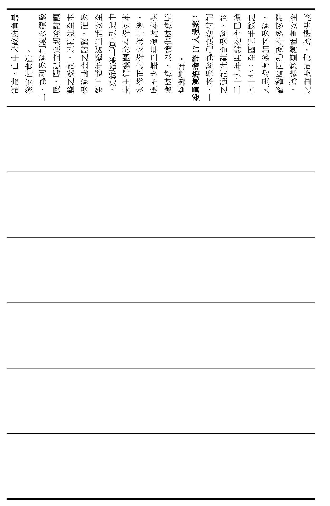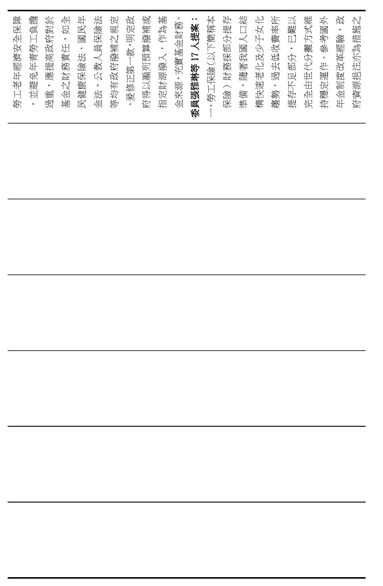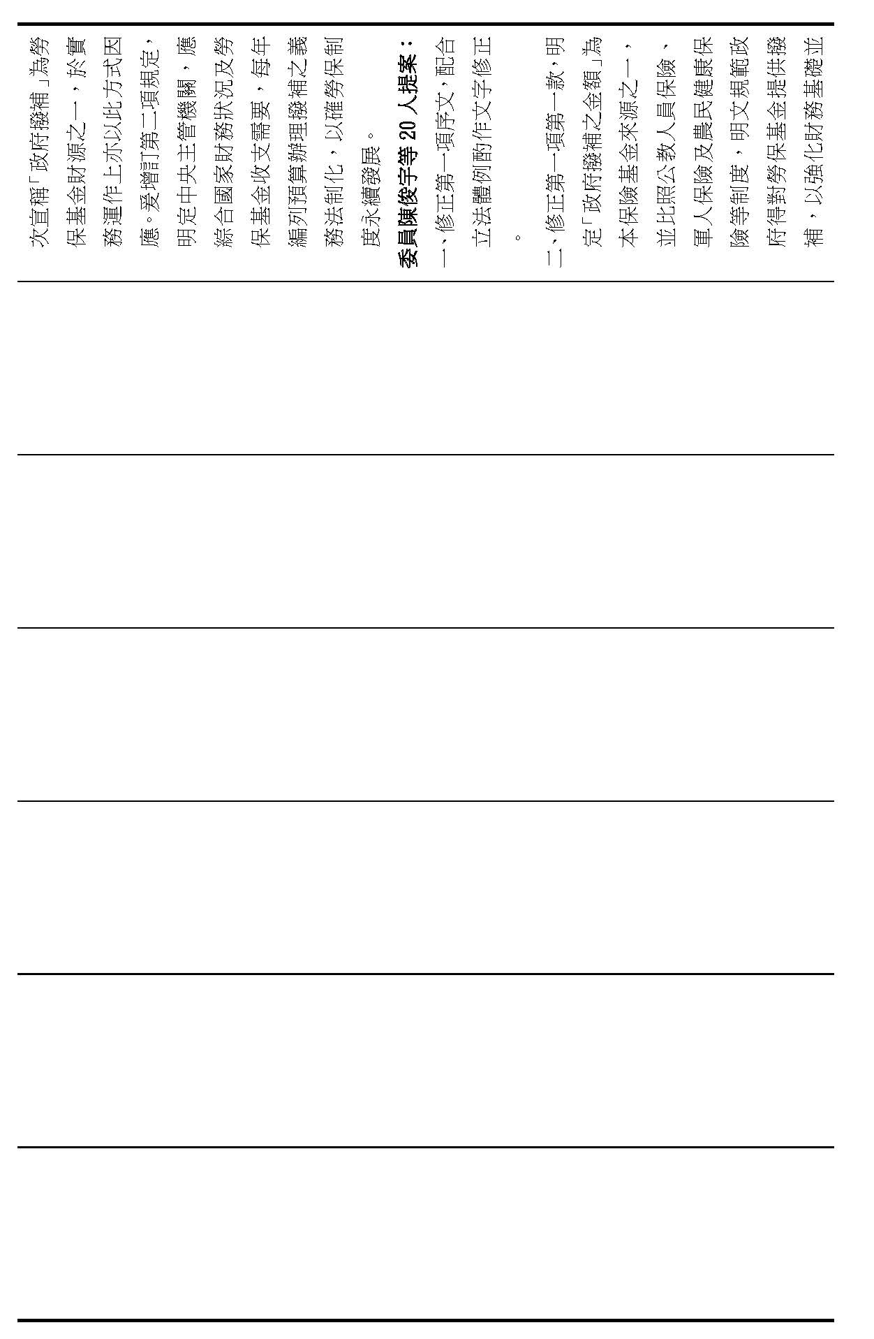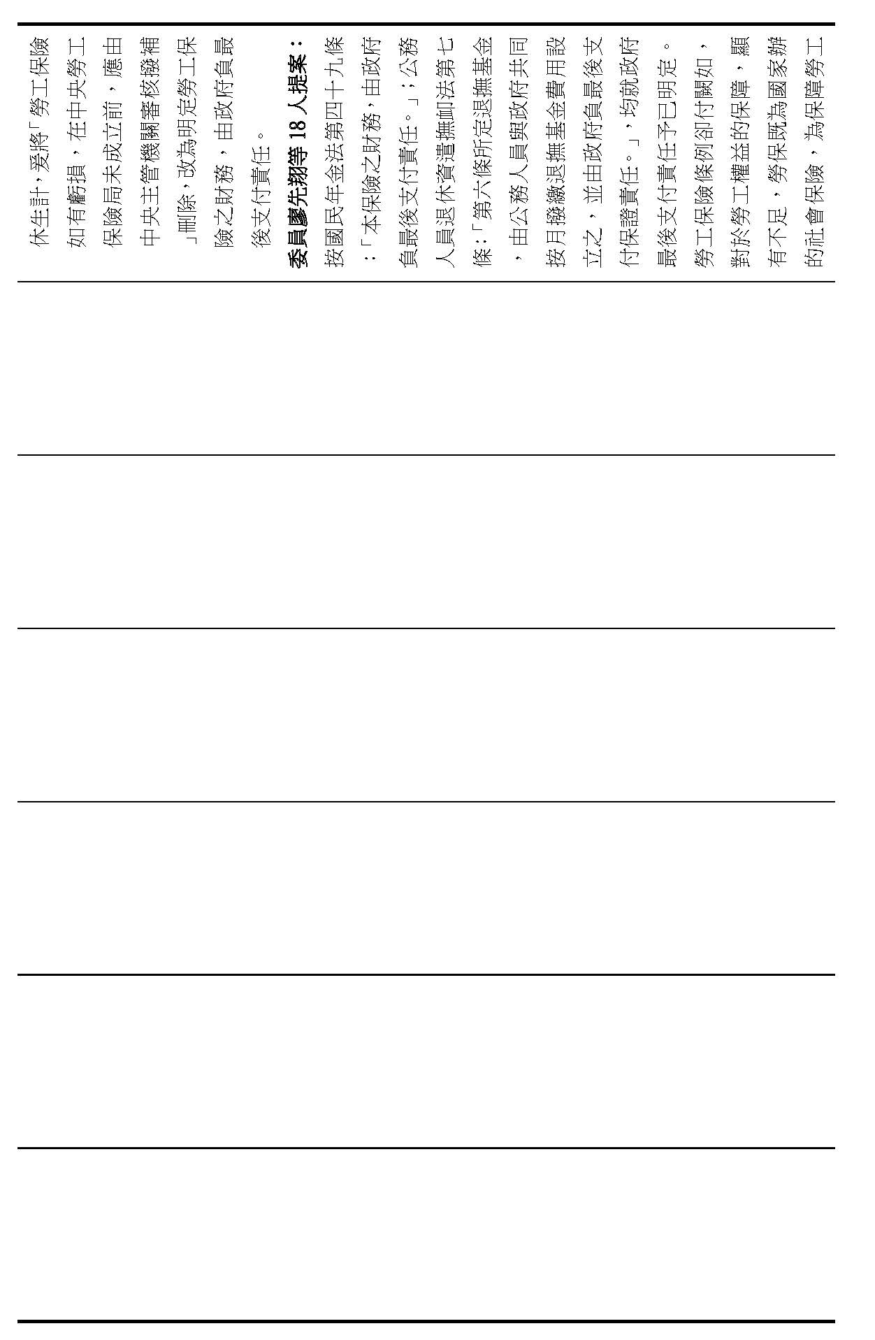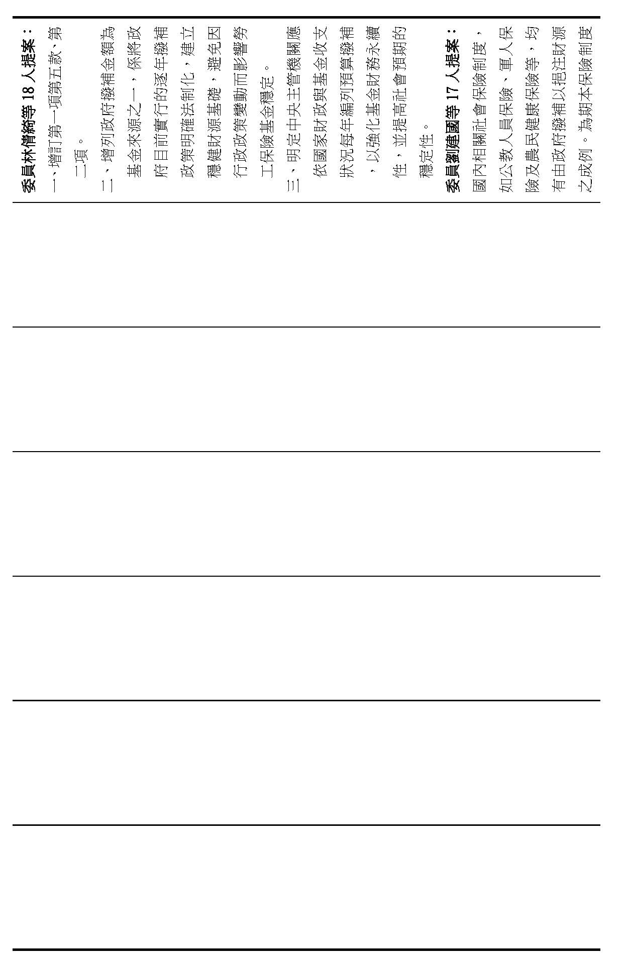 陳司長美女:跟主席及各位委員報告,在第六十九條第一項的部分,行政院的提案是「勞工保險之財務,由中央政府負最後支付責任」,各委員的版本文字略有不同,但目的都是一樣的,所以我們建議照行政院提案通過,跟行政院提案大概有一些文字上相同的,包括委員王美惠等17人、委員王鴻薇等22人、委員鄭天財等17人、委員王正旭等20人、委員吳思瑤等19人、委員李坤城等20人、委員陳俊宇等20人、委員李彥秀等16人、委員陳培瑜等17人、委員楊瓊瓔等29人、委員吳沛憶等18人及委員馬文君等18人的提案通過。