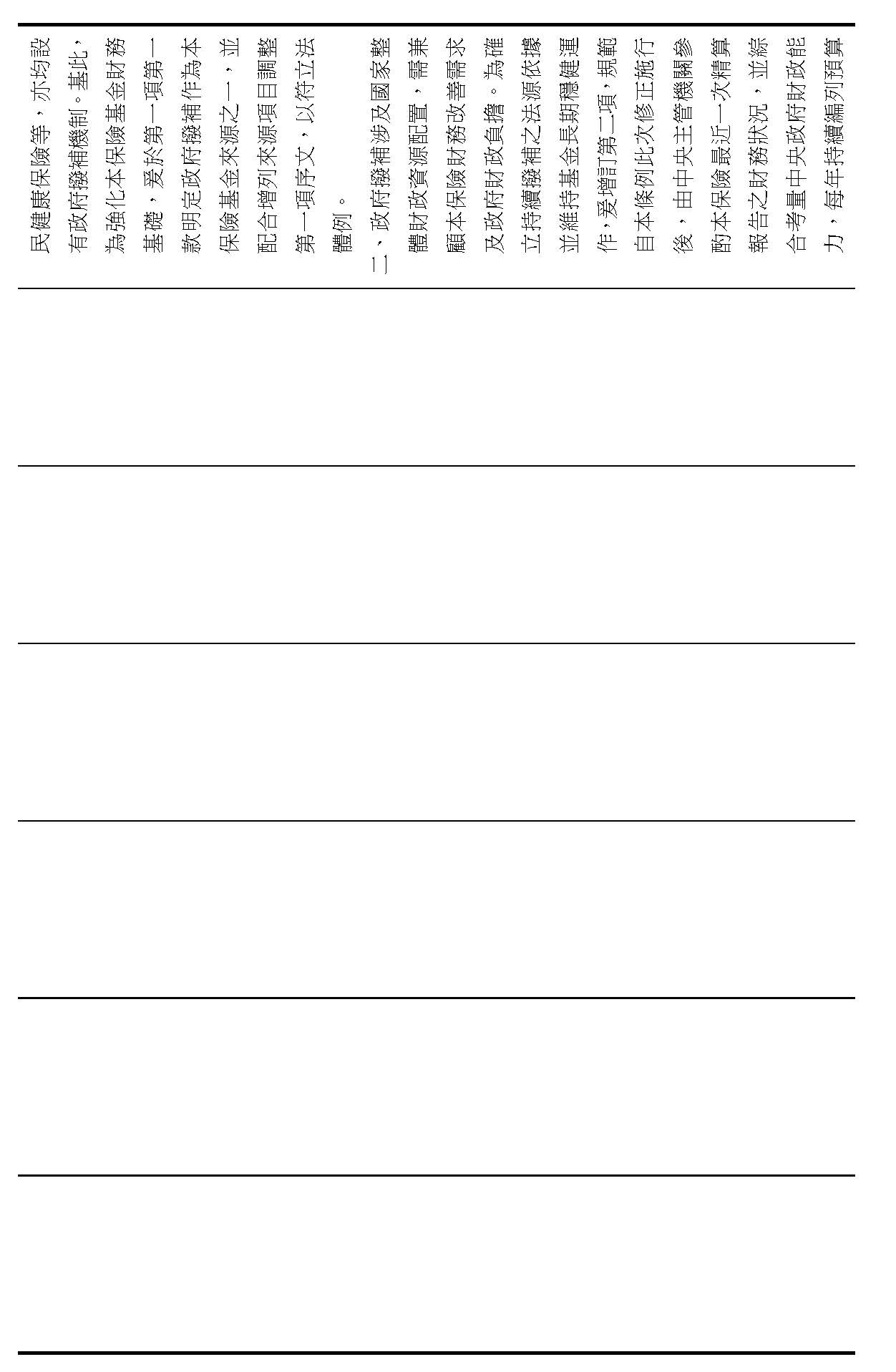 前項第二款政府撥補之金額,於本條例中華民國○年○月○日修正之條文施行後,由中央主管機關依政府財政及本保險財務狀況,每年編列預算撥補之;遇當年度保險費收入少於保險給付支出之情況,中央政府應有適當經費撥入或補助。」