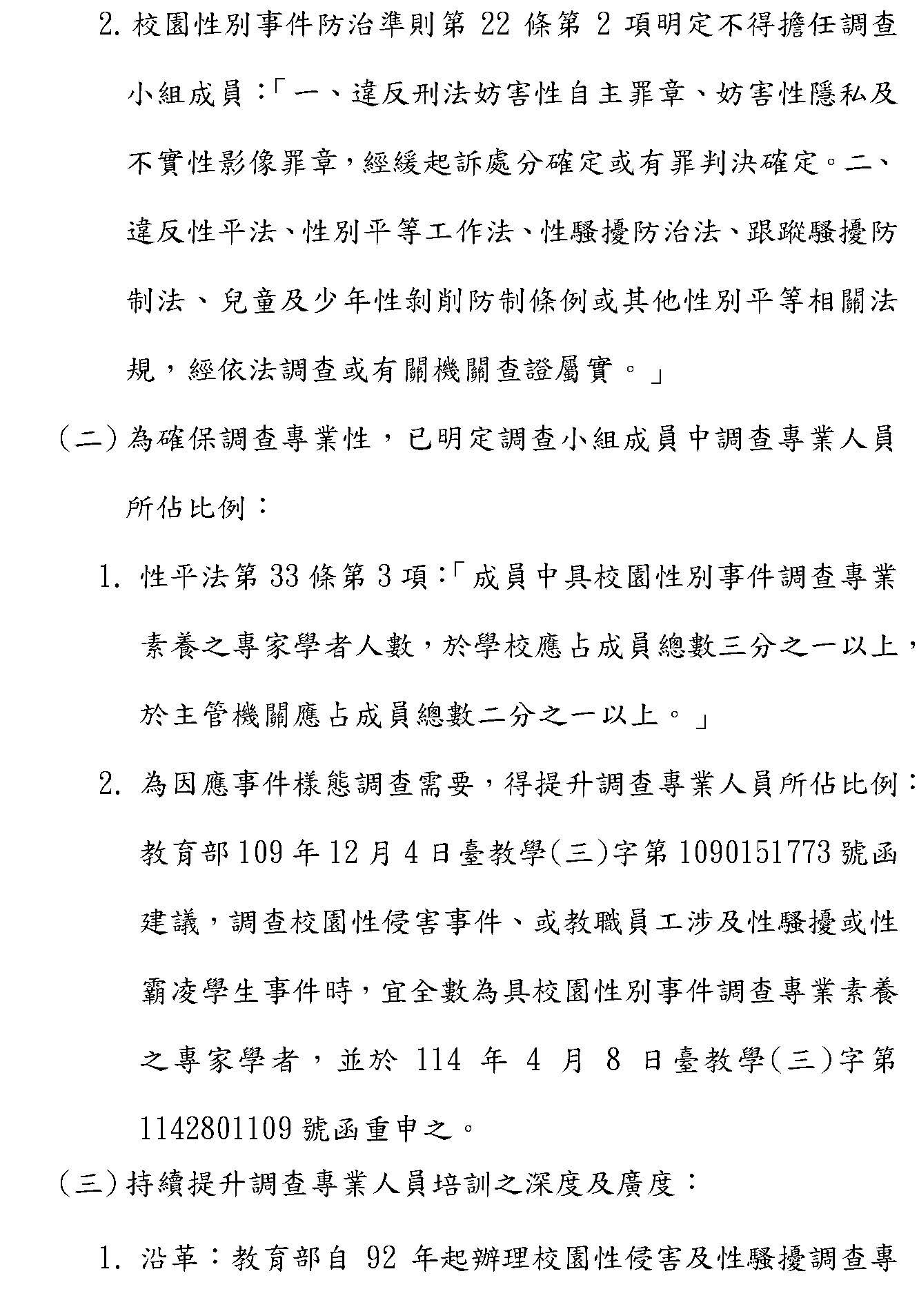 至於調查人員專業性─的問題,應該回到目前調查人才庫是由中央、各縣市政府自行培訓以及審議人員,的確會發生一種事情,也就是中央的培訓跟地方的培訓是有所差異,它的審核基準、移除的程序會有差異,但是我們應該講,目前這樣一個機制已經實行這麼多年,我們比較希望、期待的是教育部身為中央主管機關,更應落實監督、輔導各縣市政府調查人員的培訓以及淘汰機制。