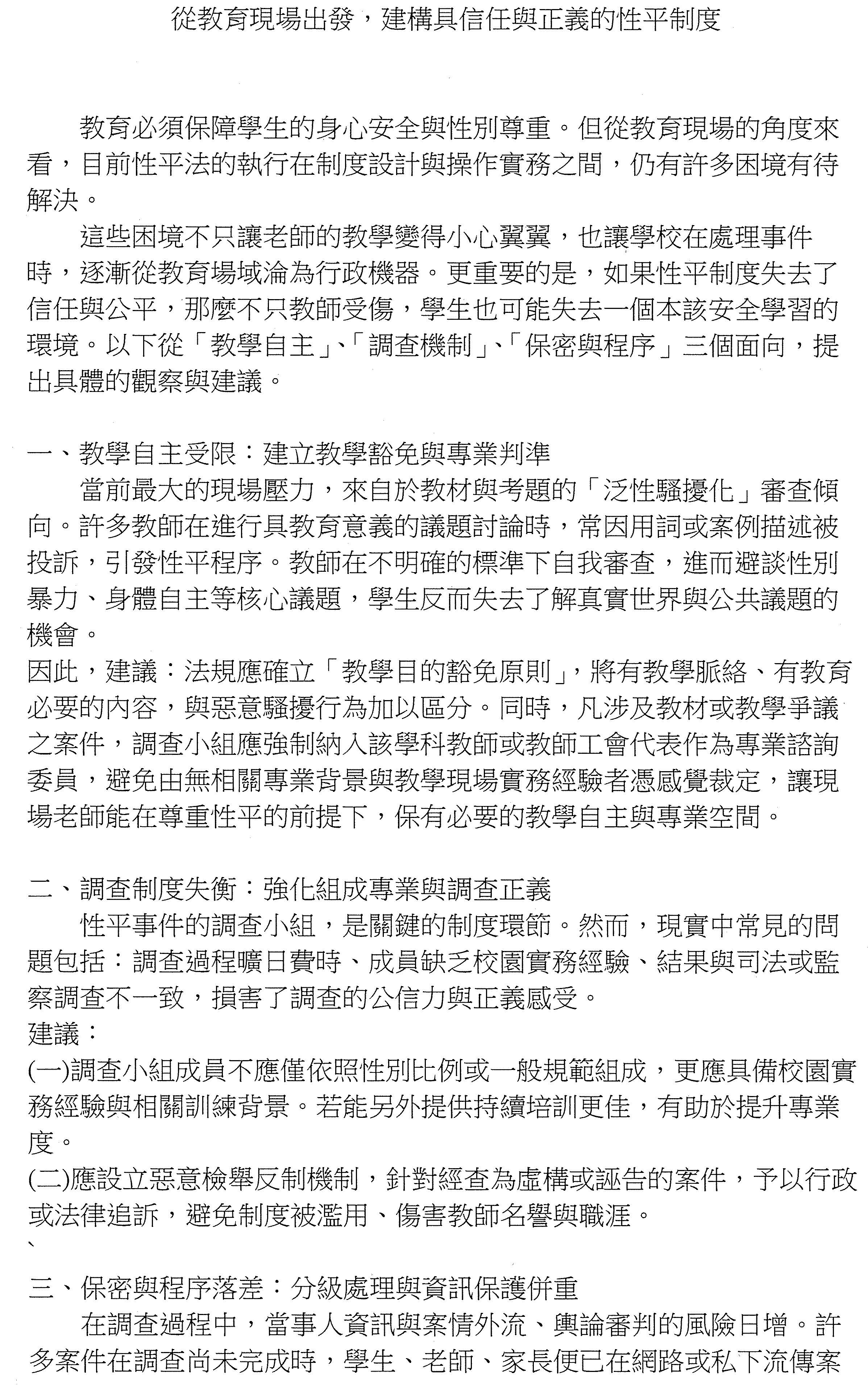 我們具體的建議:第一個,建立教學目的豁免機制,明確區分惡意騷擾與基於教育目的之必要學術討論,這是可以豁免的,我們希望保障老師在合宜的教學情境之下可以探討重要的議題,避免淪為誣告的對象。我們也希望避免師生可能因為某些主觀言詞解讀不同,而淪為一些糾紛,或者是老師為了避免變成性平事件的主角迴避討論性別的議題,我想教育的目的就是要教育學生如何保護自己,而這不是我們所樂見的。第二個建議,我們希望在調查委員會的部分,可以有專業的參與與審查,剛才有很多專家學者分享到必須要有回流訓練的機制,承辦人也必須要有培訓的機制,建立承辦人員的性別意識。在調查涉及教學內容的時候,我們希望能夠在調查委員會當中納入學科教師或者是教師工會代表,教學實務現場非常重要,如果一個只有具備性平意識但不具有教學現場實務經驗的調查委員,是否能夠專業、精準地判斷出是否成案,這是非常重要的。調查人力的專業化還有專職化,也可以避免非專業人員用主觀判斷來處理教學專業問題。最後一個,有關於救濟機制的缺乏,如果今天教師被誣告,損害了他對教學的熱忱還有教學的品質,損害了教師的被信任感,怎麼樣去彌補教師的部分?