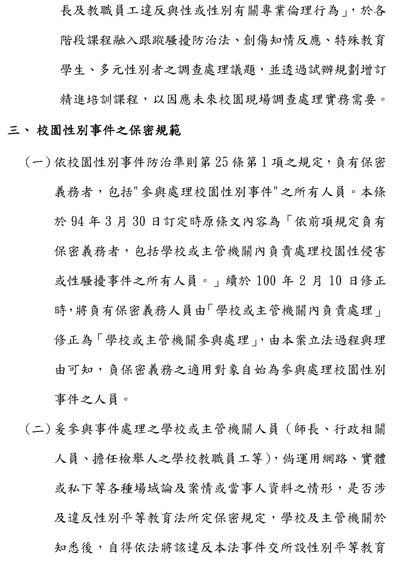 第二個,關於調查過程中的保密跟行政疏失,主要是因為現行有關校園性別事件調查處理的保密規範定於性別平等教育法第二十三條,只是近期發生校園師長、行政及當事人、檢舉人等、相關人等於網路、實體或私下各種場域討論及案情或當事人資料的情形,引起各界討論,包含保障言論自由及受教權、保護隱私跟調查公正性之間如何衡平?所以也請各界討論,學校或主管機關及當事人、檢舉人及其他相關人等之保密義務、對象及範圍,是不是有疏漏需要修正或加強宣傳的部分?