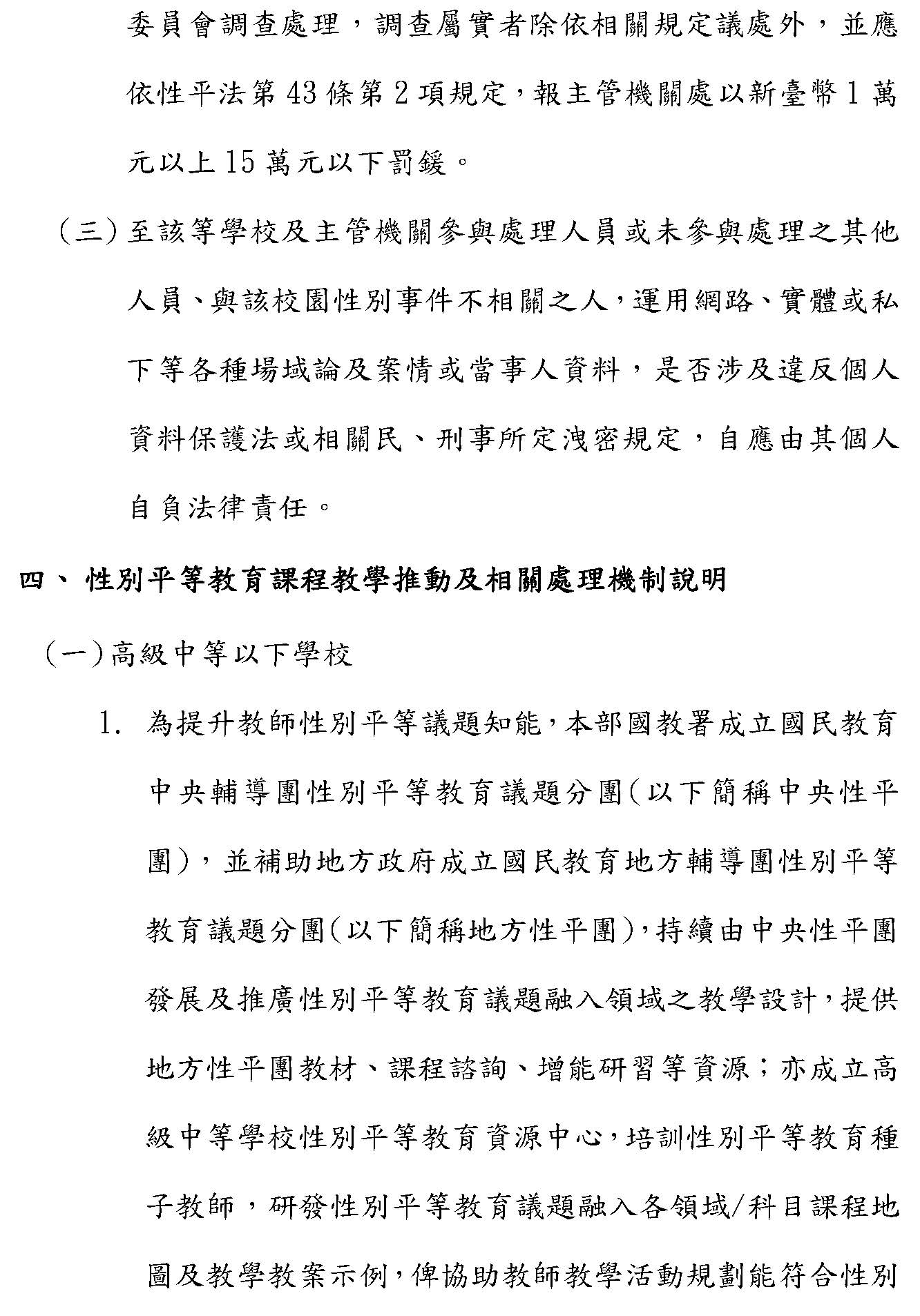 性別平等教育法(以下簡稱性平法)自施行以來,涵蓋了性平課程、教學與學校性別事件調查處理機制等相關規定,以下本部就性別平等事件之調查人員、保密規範,以及本部推動性平課程、教學及相關調查處理機制進行說明:
