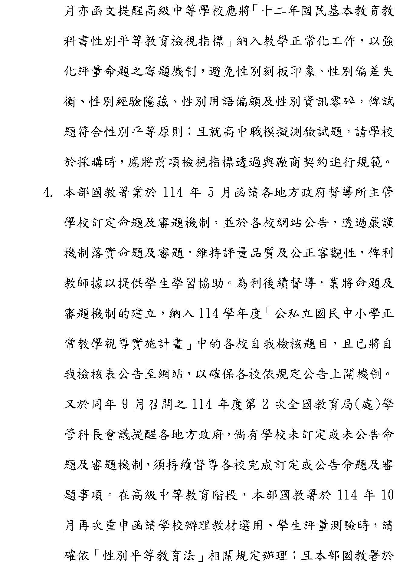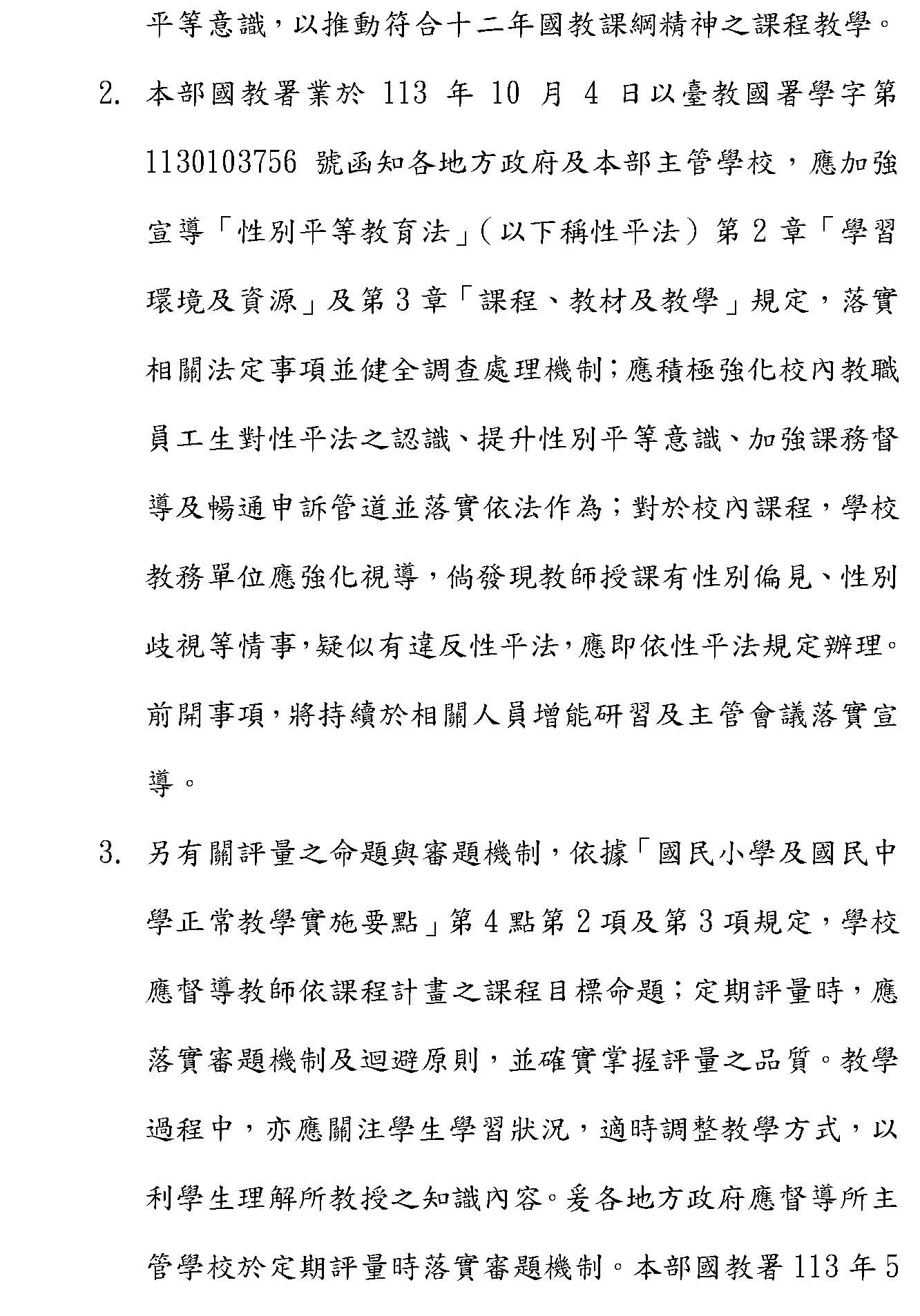 我在這邊也再特別強調一下,我們先提到出考題這件事情,我不太確定在金城國中事件發生之後,在考題的審閱過程當中,有沒有外部的性別專家來做審議,或者部裡面有沒有成立一個相關的委員會。因為對我來說,可能已經要全面的去審視的是,在我們的教育現場,大家對於性別觀念,到底在我們講性平法又在修法的前提底下,還有社會的性別環境大幅度調整之下,有沒有機會重新審視各種教材或考題能夠重新放進性別最好的意識狀態。當然大家也都很理解,美國近年川普總統有很多很多翻轉性平的政策,我也蠻希望能夠強調,因為現在網路世代,大家都從各種很不一樣的管道去得知性平的消息,很多時候一些似是而非的資訊,讓第一現場很多工作夥伴有一點點無所適從,所以,我還是比較期待部裡面能夠召開相關的專家會議或性別的相關會議,集合所有人在臺灣對於性別社會的觀察,能夠給部裡面更好的指導,讓大家能夠透過一個更完整的檢視來保障我們學生,無論是在相關的教材還是考題上,不會受到偏誤的影響。