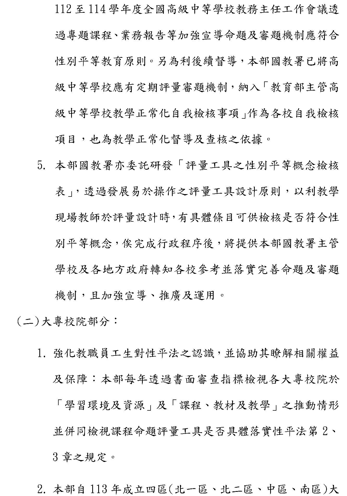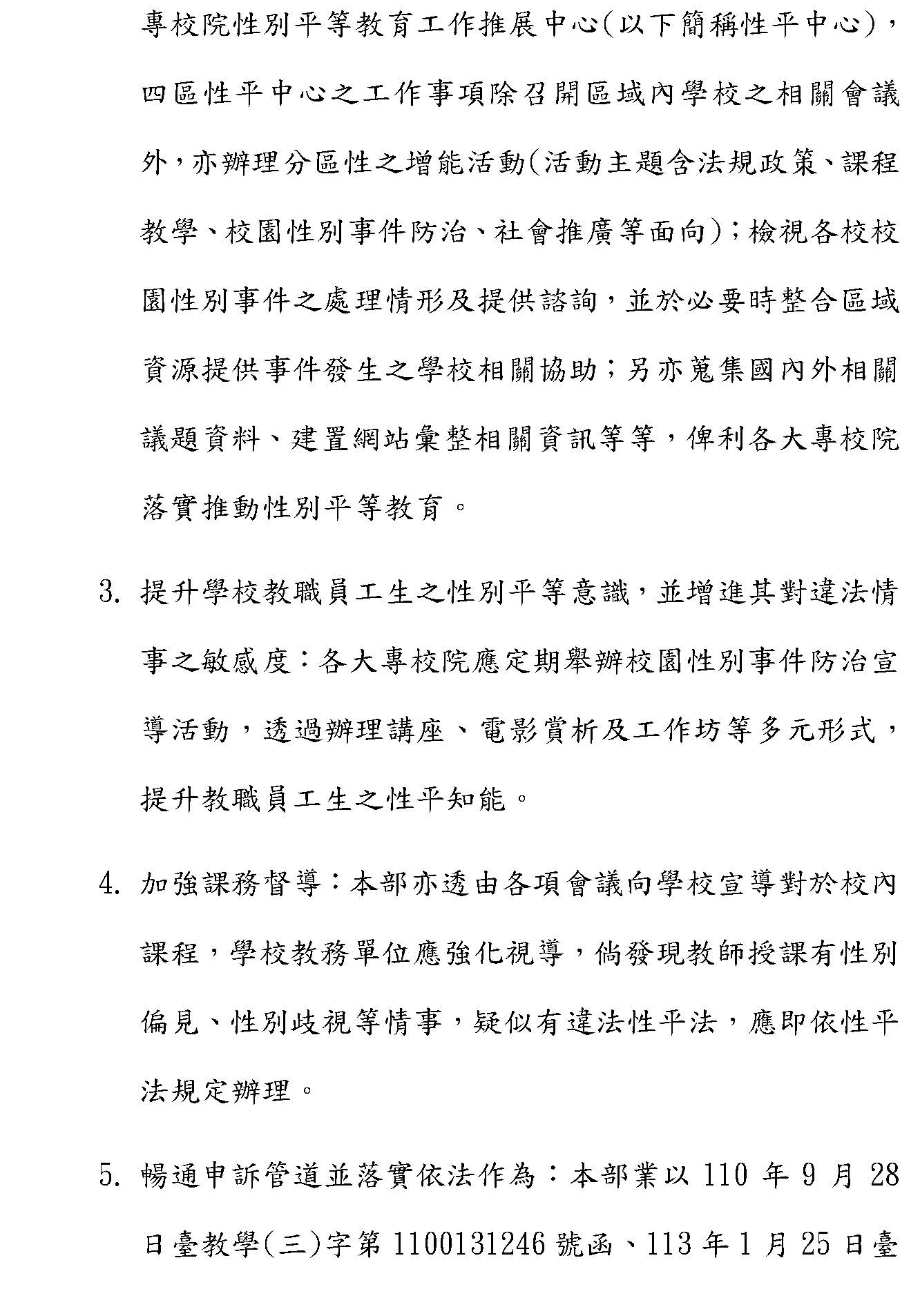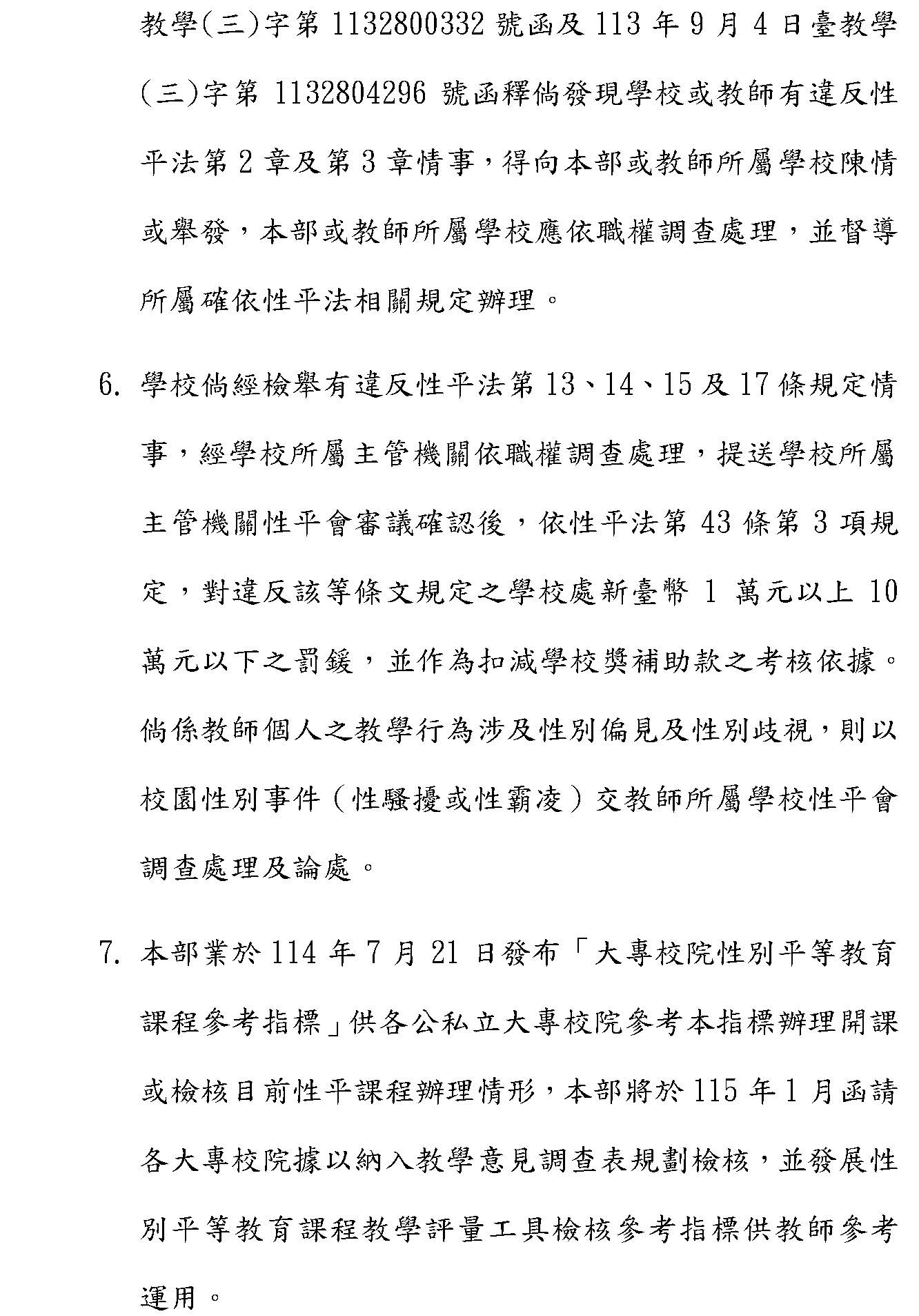 二、在大專校院部分,本部每年也透過書面審查指標來檢視大專校院在學習環境、課程、教材跟教學以及課程命題評量工具的推動情形,是否符合性平法第二章、第三章的規定,也透過四區的大專校院性平推展中心,來協助檢視各校在性平事件的處理並提供相關諮詢,必要時候會整合區域資源來提供協助。同時,我們也會透過各項會議向學校宣導,而且也要求學校如果有教師或學校違反性平法第二章跟第三章的情事,得向學校陳情來暢通申訴管道。同時,學校如果有違反性平法第十三條、第十四條規定情事,教育部也會依法來處理,希望藉由上述的措施來持續推動校園事件處理的相關方式,謝謝各位。