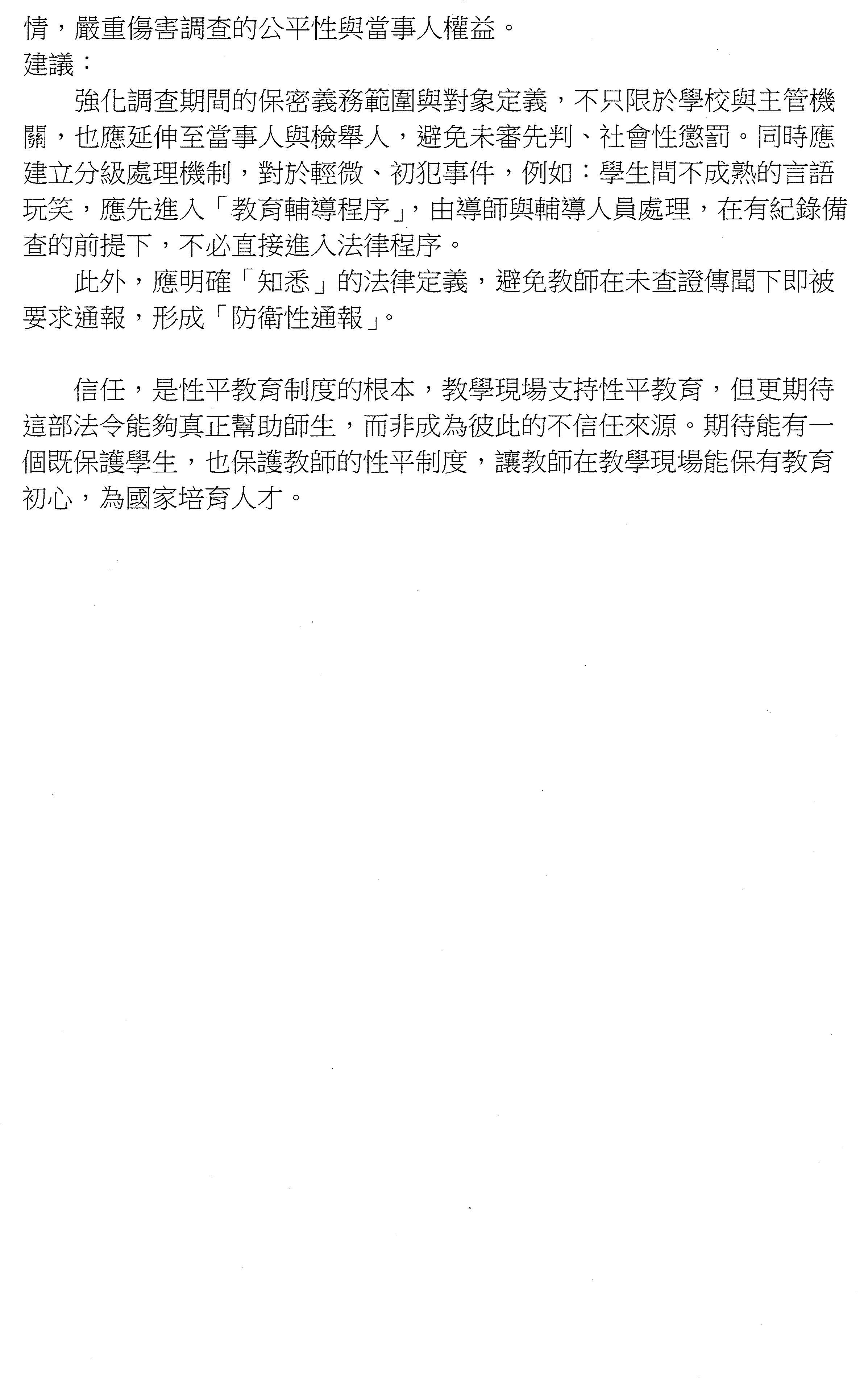 另外,在調查人員方面,在教學實務面上會有一些調查人員的確是性平認知比較不足,這部分希望在縣市能有審核的機制,如果有審核機制的話,應該可以將這些具有調查人員身分但是不具備性平知能的人移除,這部分也可以落實到我們的行政調查上可以受到更多的信任及肯定。