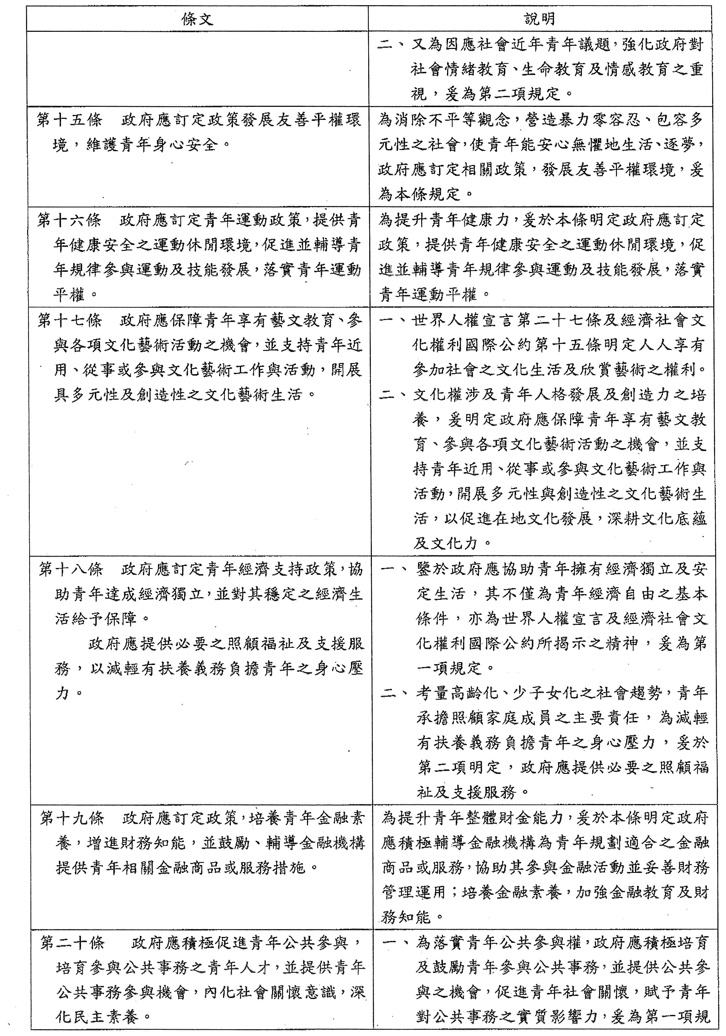 第二十條 政府應積極促進青年公共參與,培育參與公共事務之青年人才,並提供青年公共事務參與機會,內化社會關懷意識,深化民主素養。