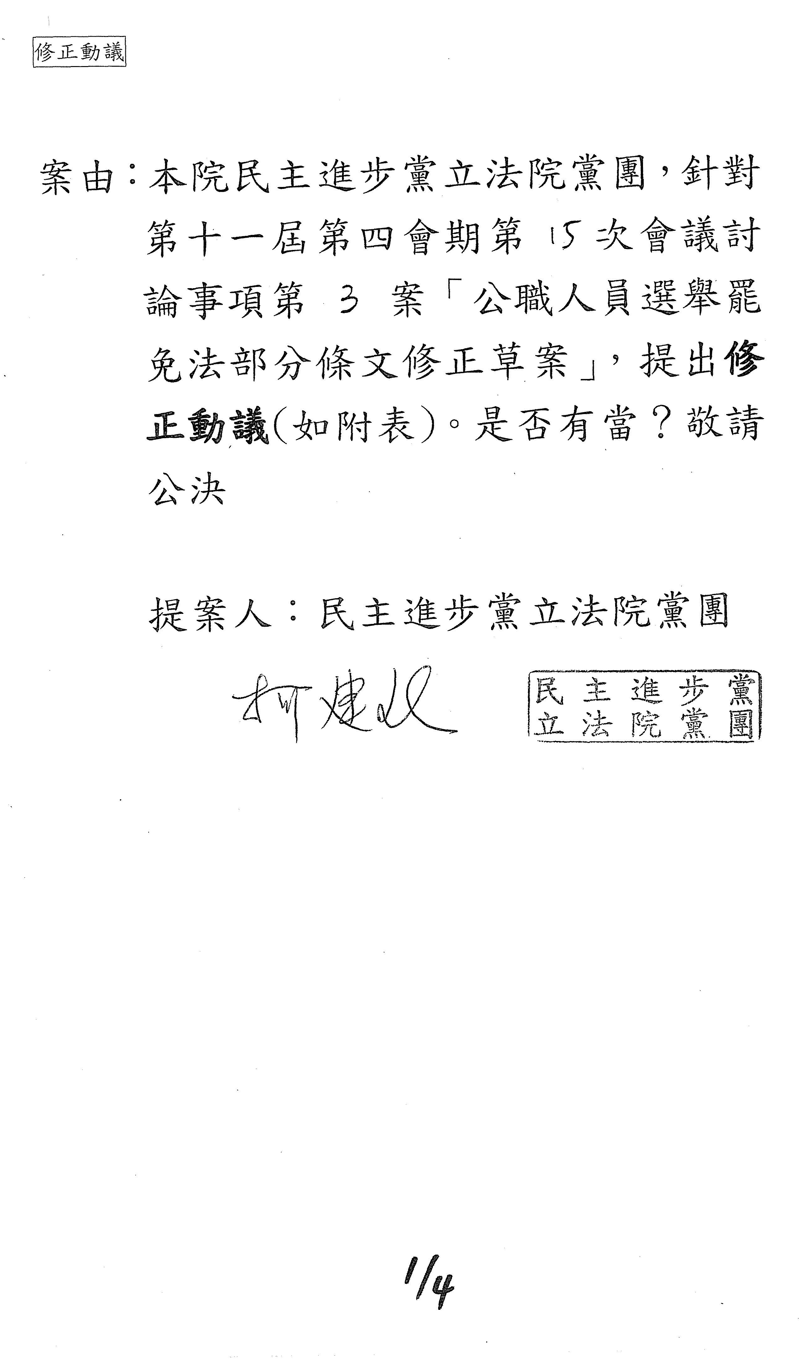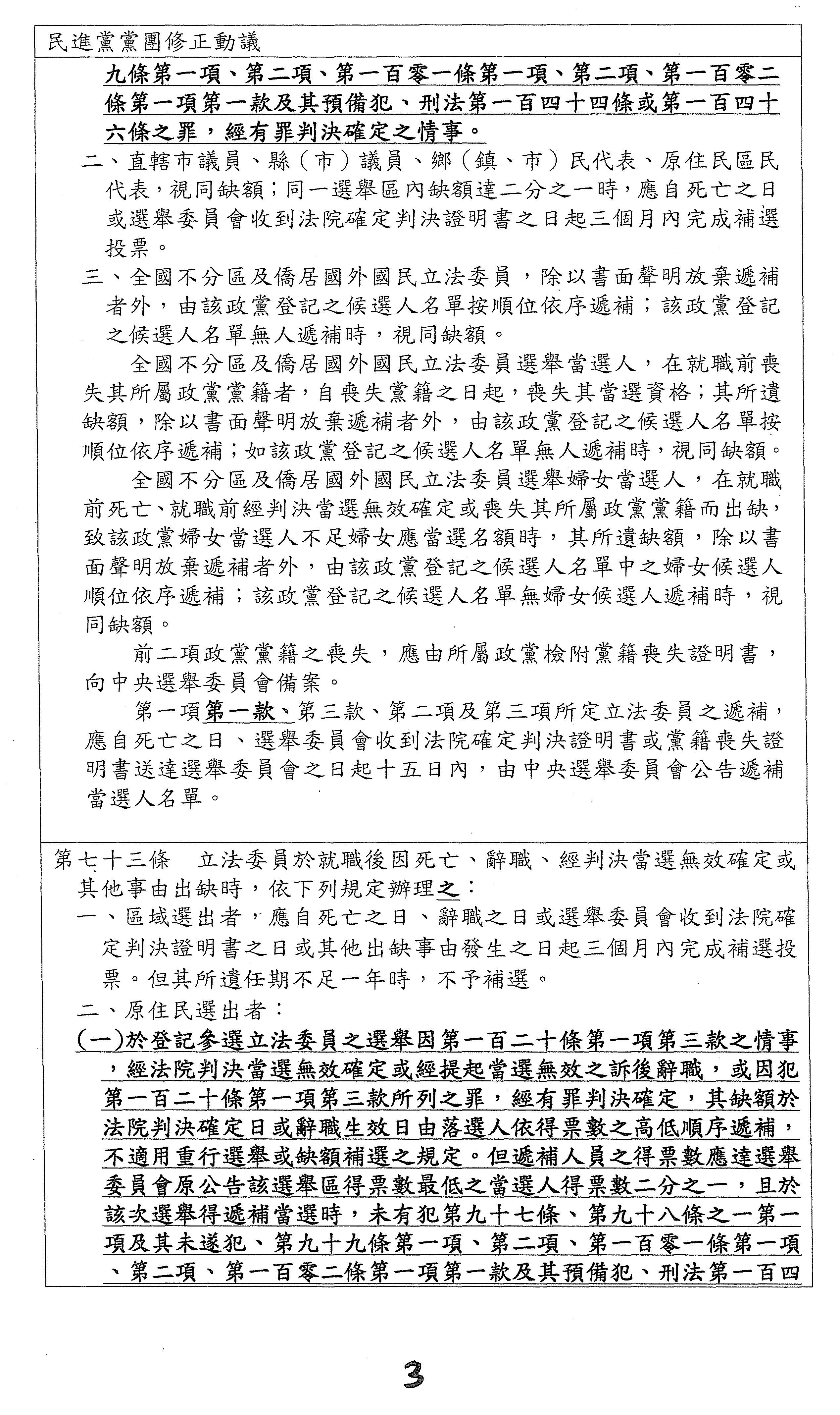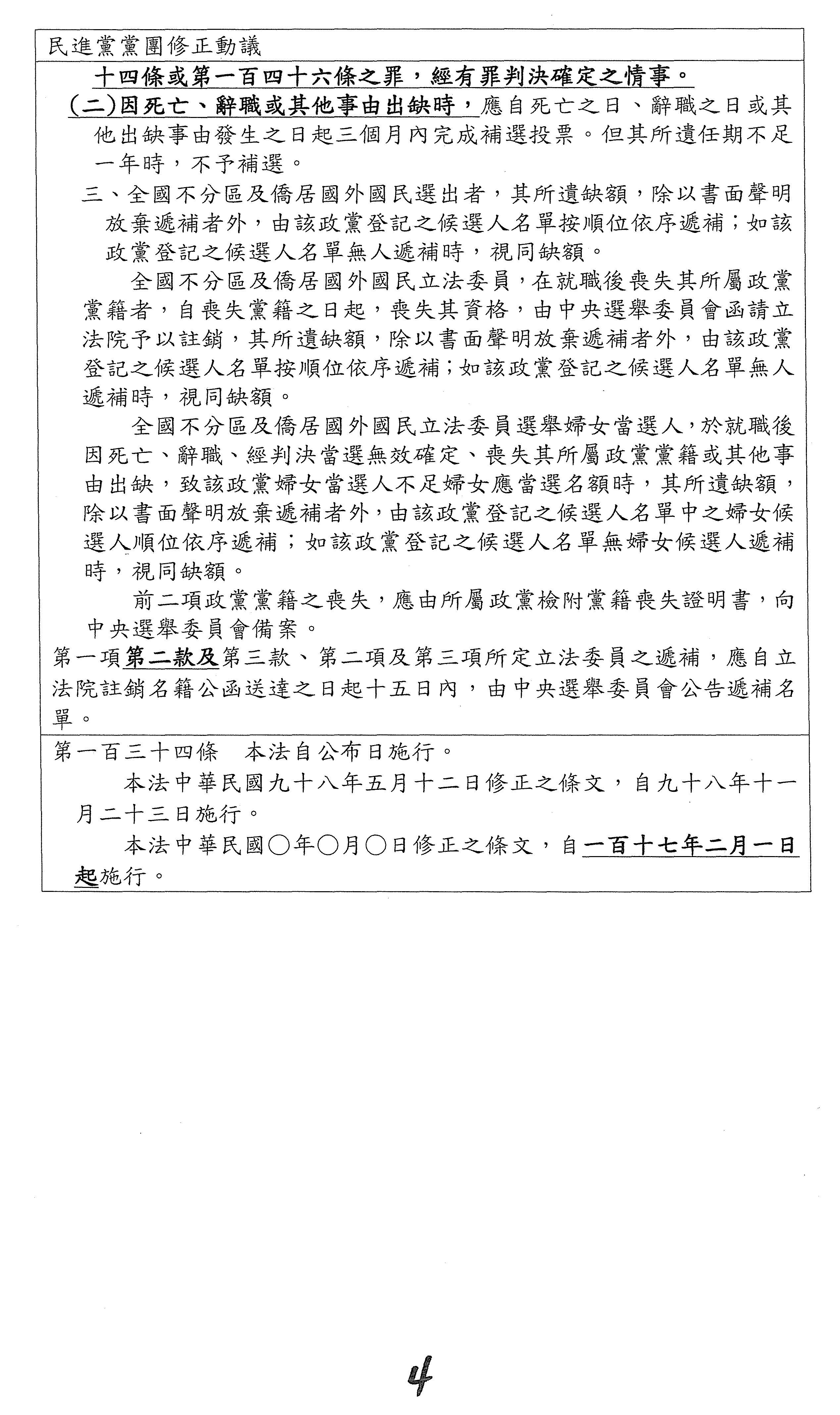 主席:報告院會,我們開始進行表決民進黨黨團再修正動議條文。