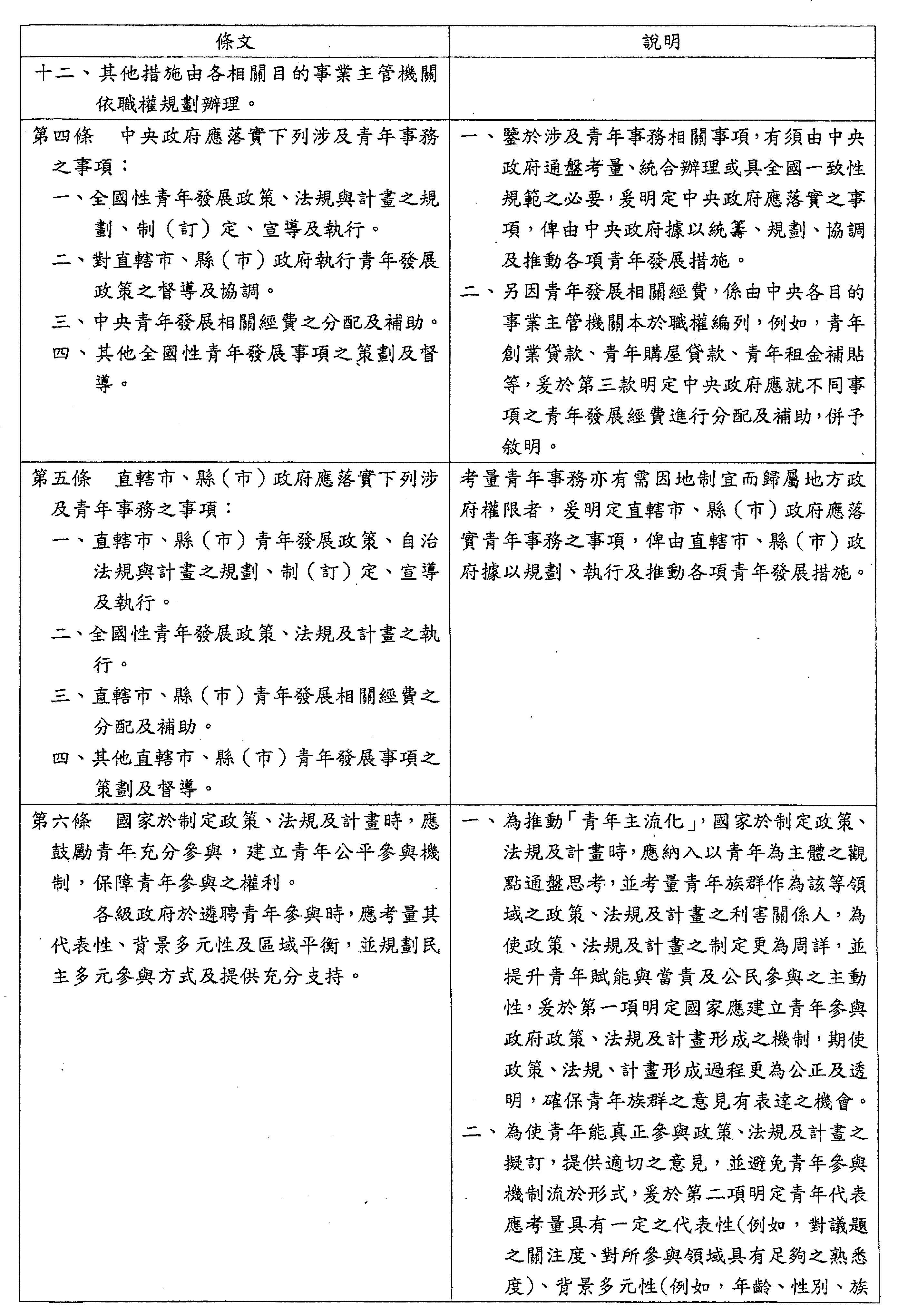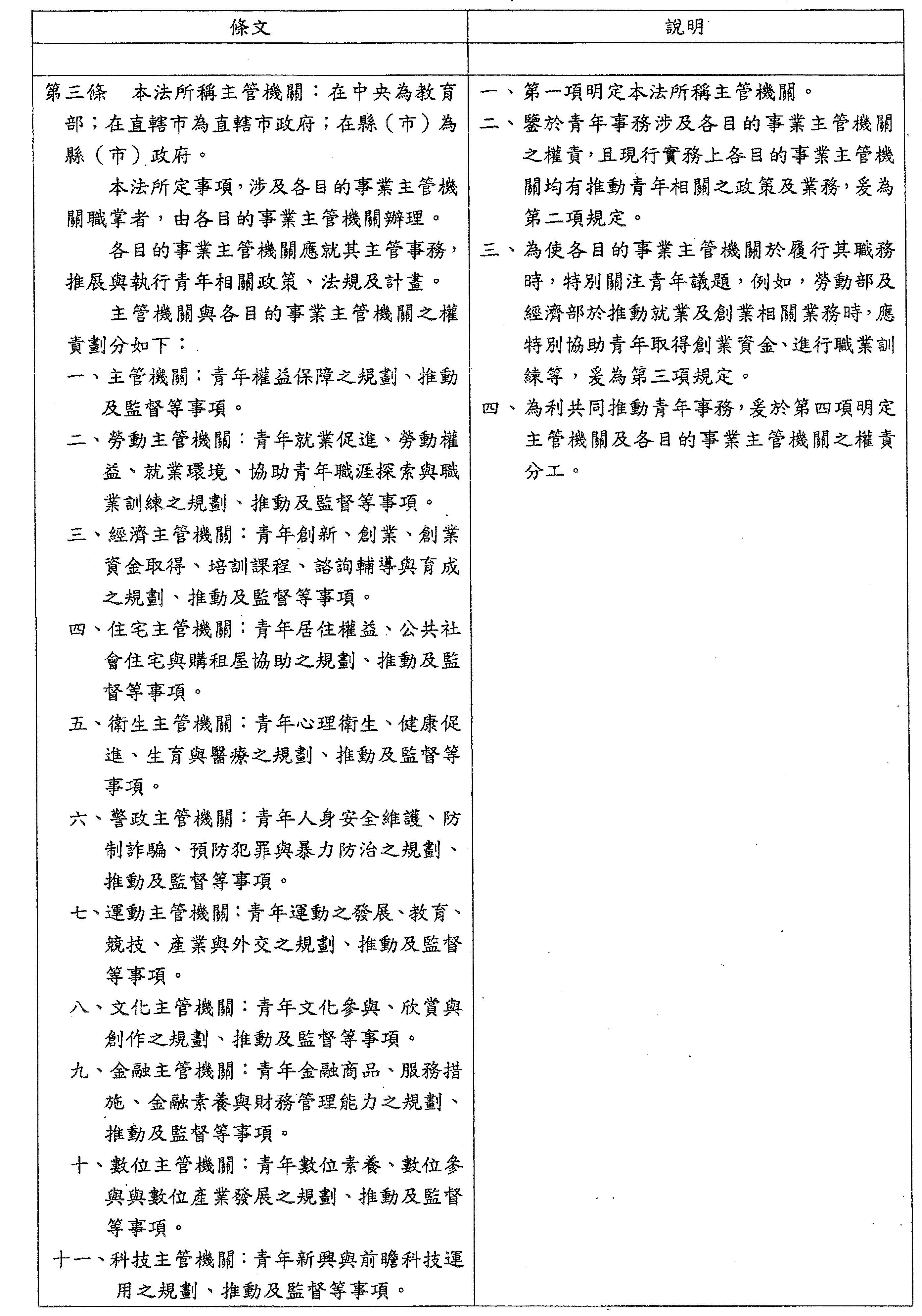 一、主管機關:青年權益保障之規劃、推動及監督等事項。