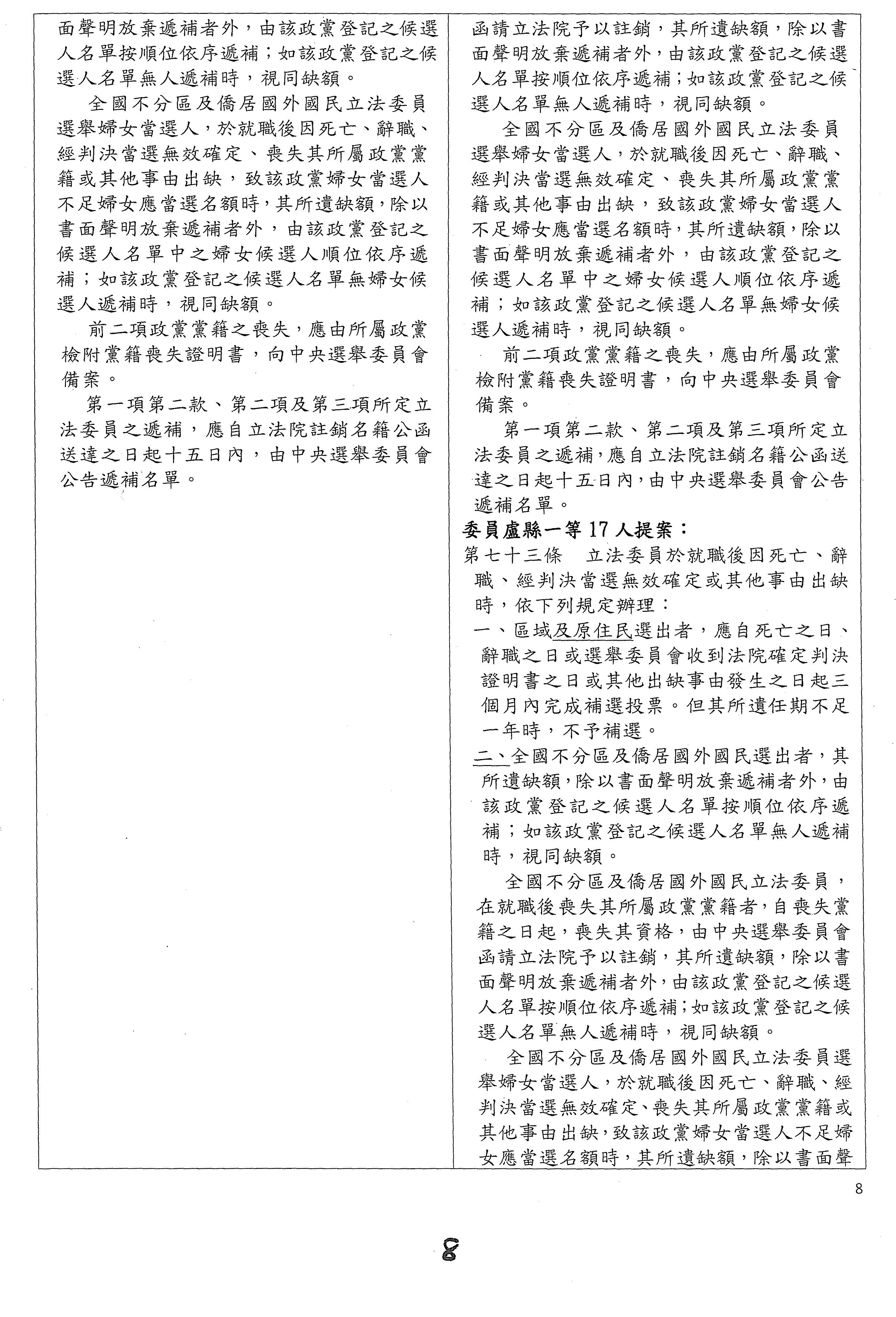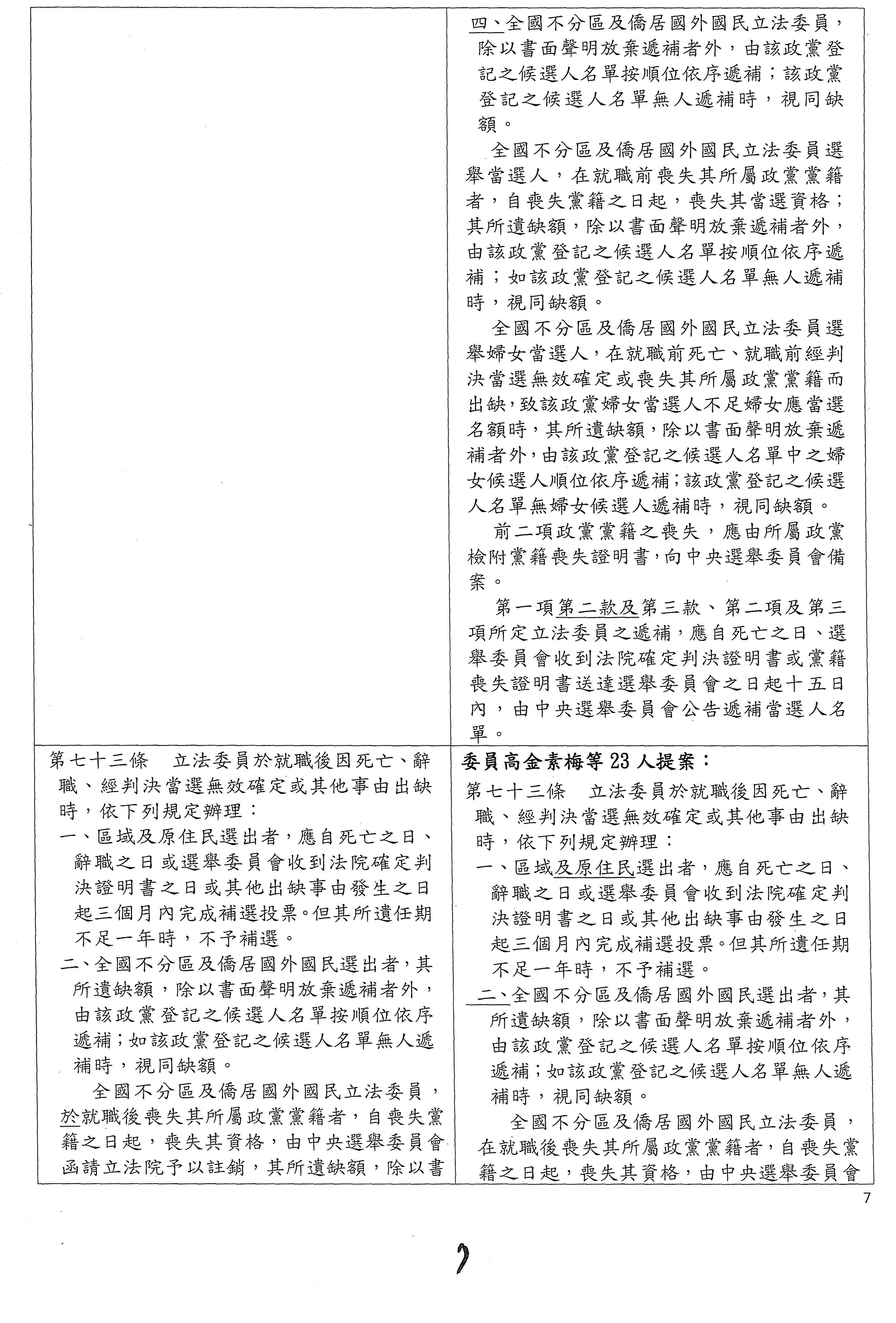 主席:報告表決結果:在場委員103位,贊成55位,反對48位,贊成者多數,第七十三條照國民黨黨團再修正動議條文通過。