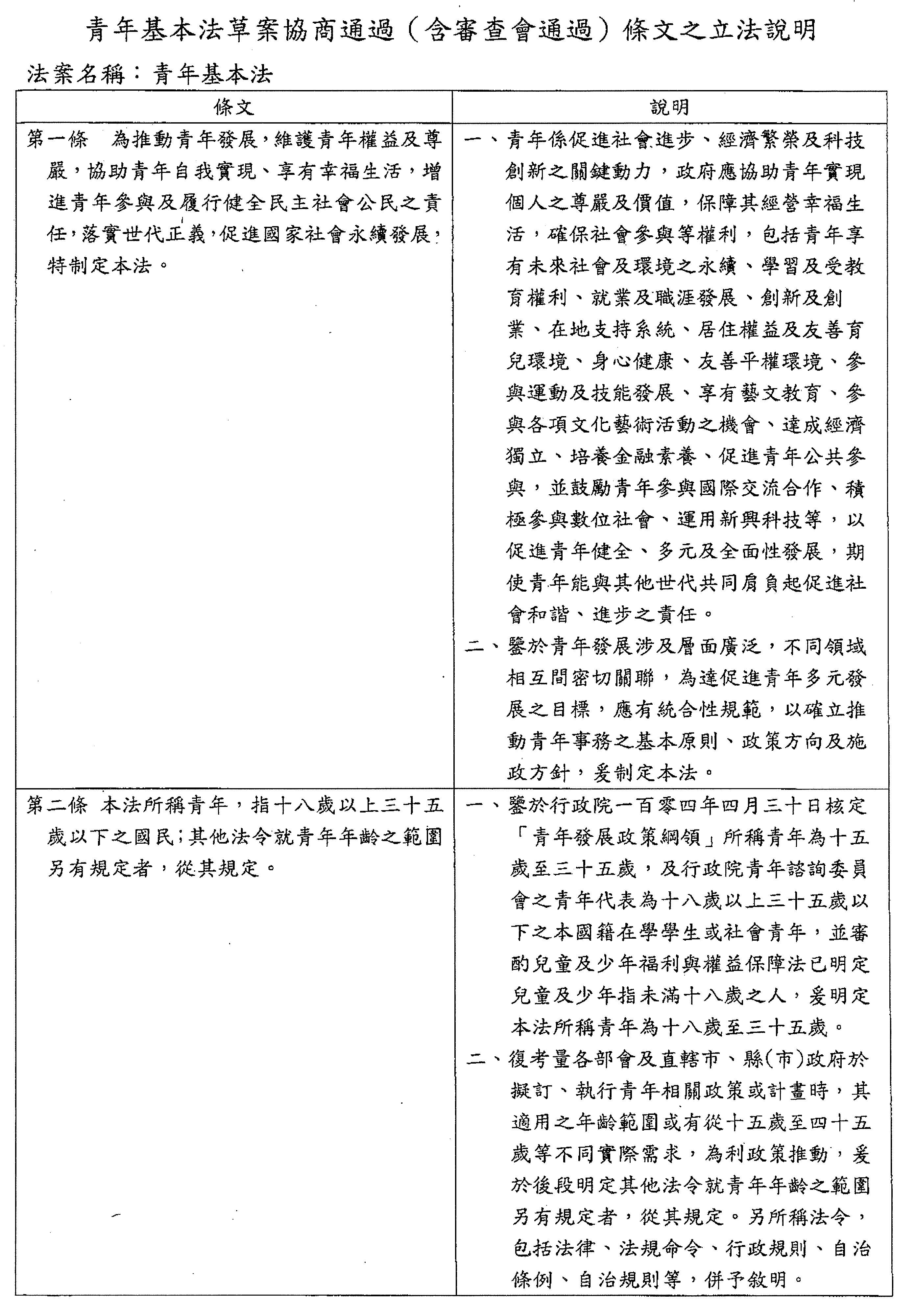 二、(一)本院教育及文化委員會報告併案審查行政院函請審議、委員黃捷等17人、委員林楚茵等21人、委員林宜瑾等22人、委員陳培瑜等17人、委員吳思瑤等47人、委員范雲等16人、委員陳秀寳等21人、委員吳沛憶等24人、委員王美惠等17人分別擬具「青年基本法草案」、委員林德福等20人擬具「青年發展基本法草案」、委員郭昱晴等18人、委員林月琴等19人、委員葛如鈞等19人、委員李坤城等19人、委員魯明哲等17人、委員陳亭妃等16人、委員葉元之等20人、委員羅廷瑋等16人、委員柯志恩等19人、委員林俊憲等19人、委員伍麗華Saidhai Tahovecahe等18人、委員萬美玲等16人、委員許宇甄等19人、委員邱若華等18人、委員賴瑞隆等18人、委員張嘉郡等20人、委員王育敏等27人、委員翁曉玲等20人、委員洪孟楷等16人、委員鄭天財Sra Kacaw等18人、委員王鴻薇等17人、委員徐巧芯等16人、委員楊瓊瓔等19人、委員蔡易餘等17人、委員邱鎮軍等23人、委員張雅琳等18人、委員張宏陸等21人、委員范雲等24人、台灣民眾黨黨團及委員王正旭等23人分別擬具「青年基本法草案」案。