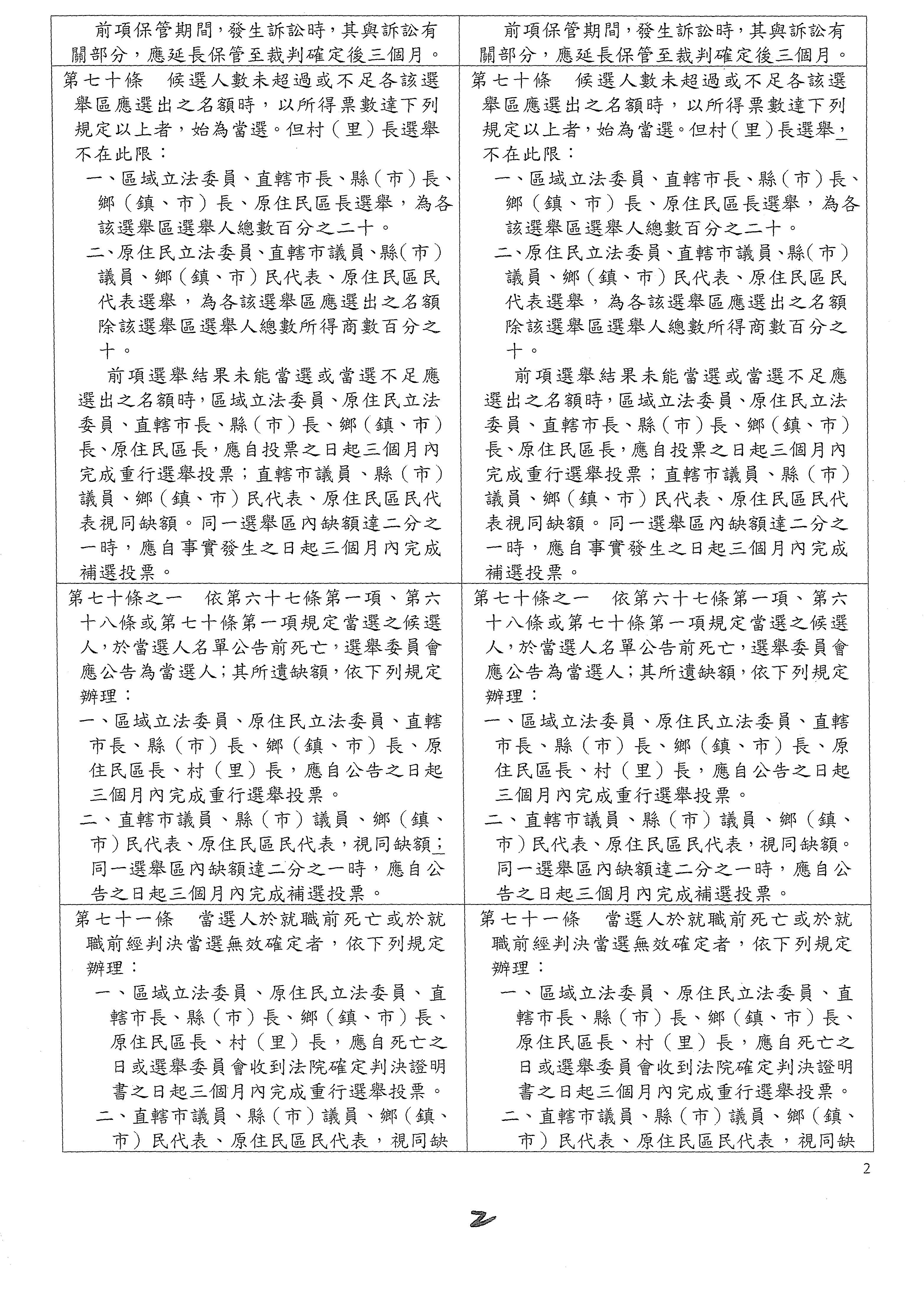 二、直轄市議員、縣(市)議員、鄉(鎮、市)民代表、原住民區民代表,視同缺額;同一選舉區內缺額達二分之一時,應自死亡之日或選舉委員會收到法院確定判決證明書之日起三個月內完成補選投票。