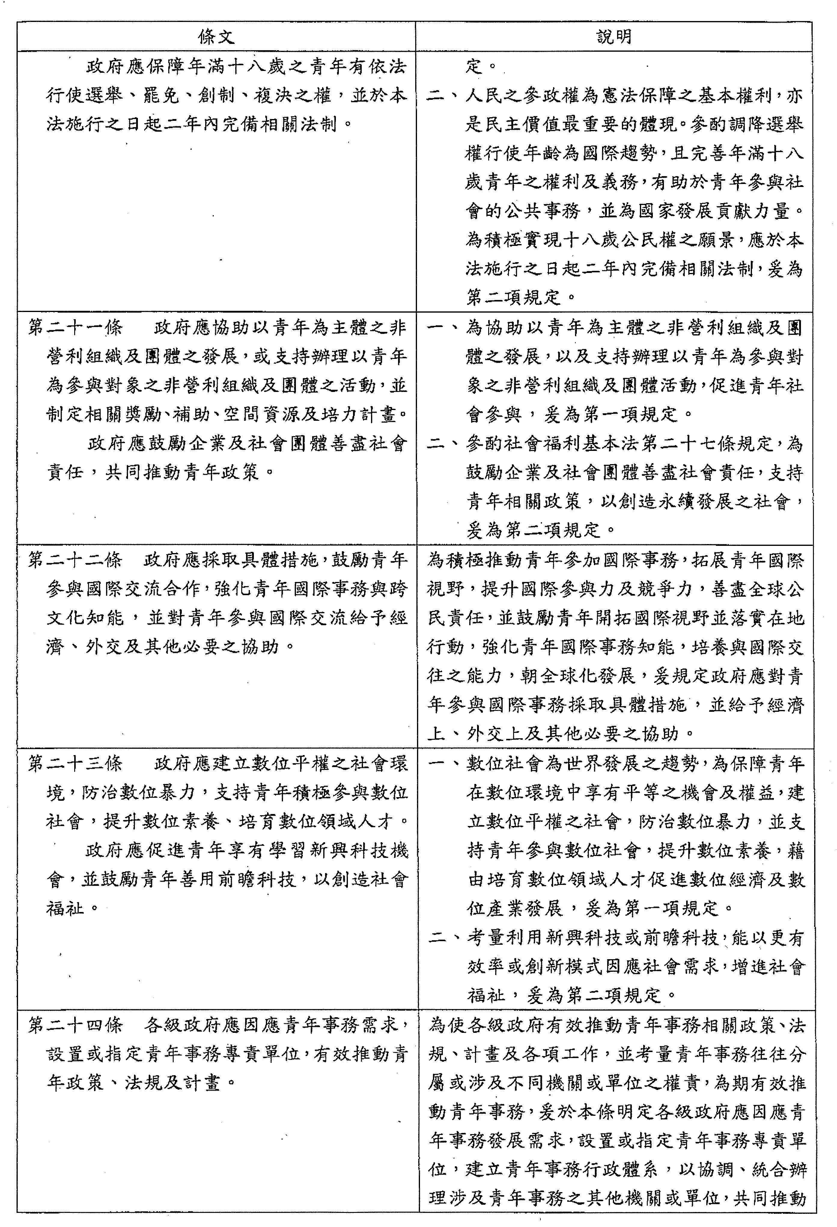 政府應保障年滿十八歲之青年有依法行使選舉、罷免、創制、複決之權,並於本法施行之日起二年內完備相關法制。
