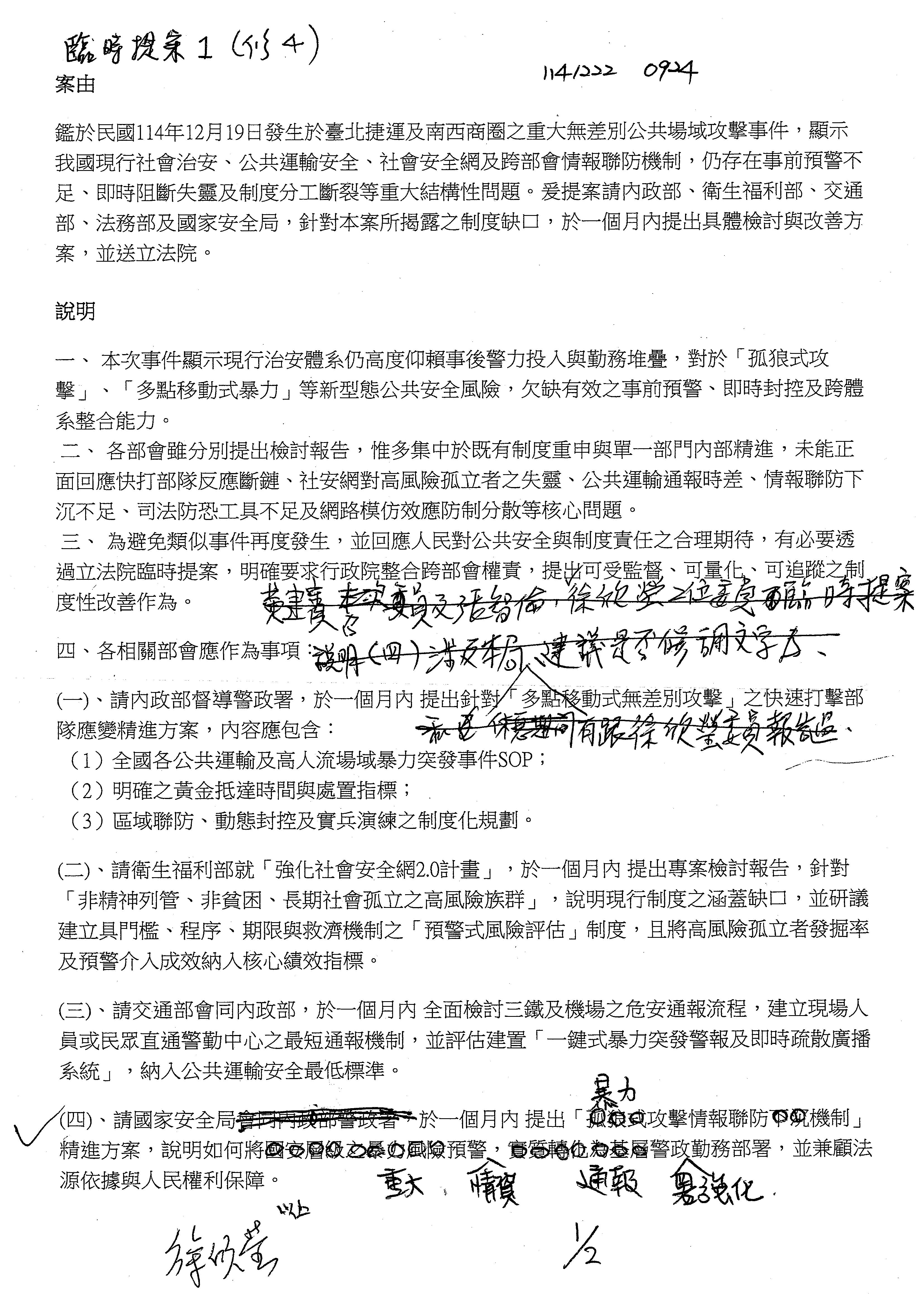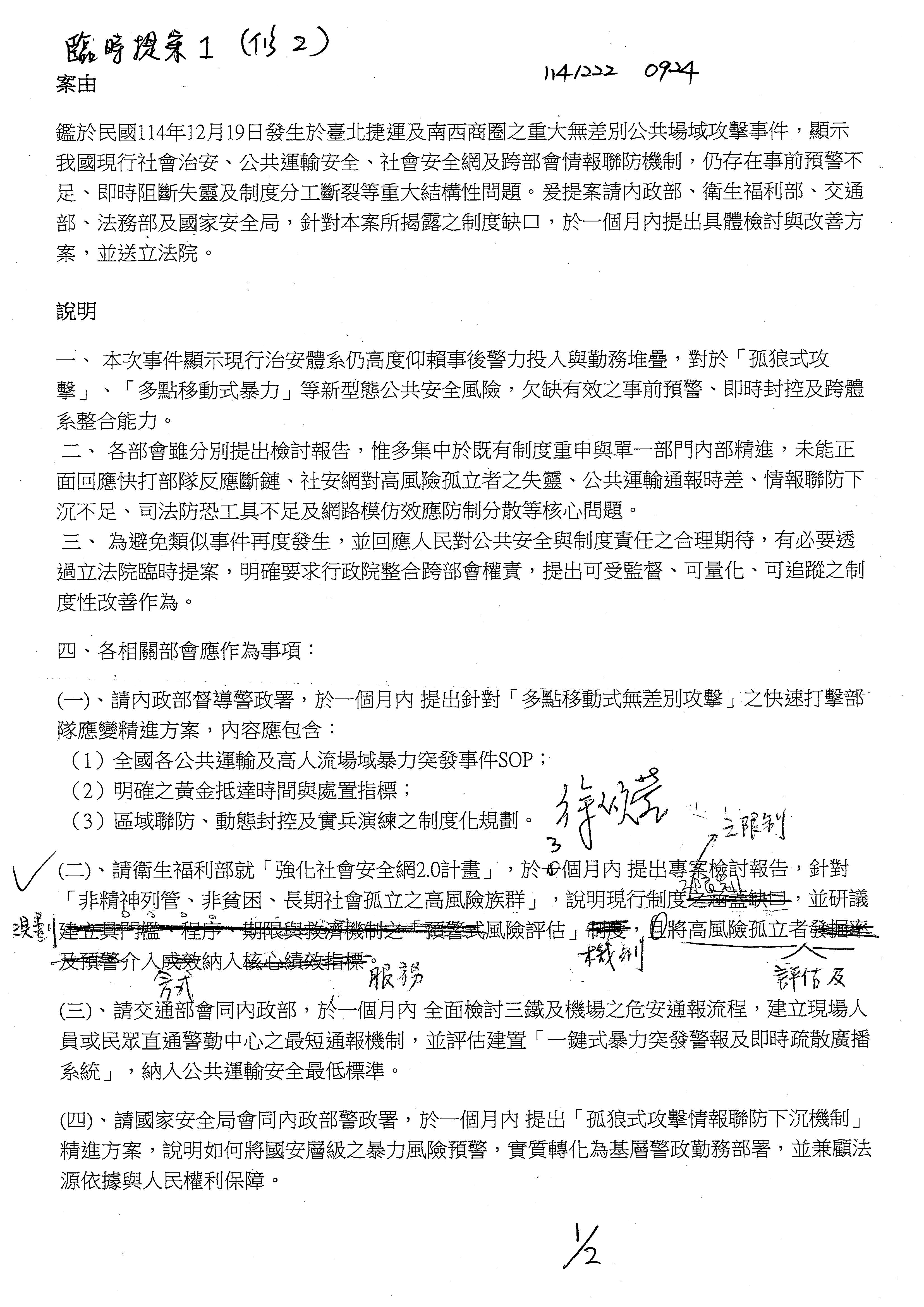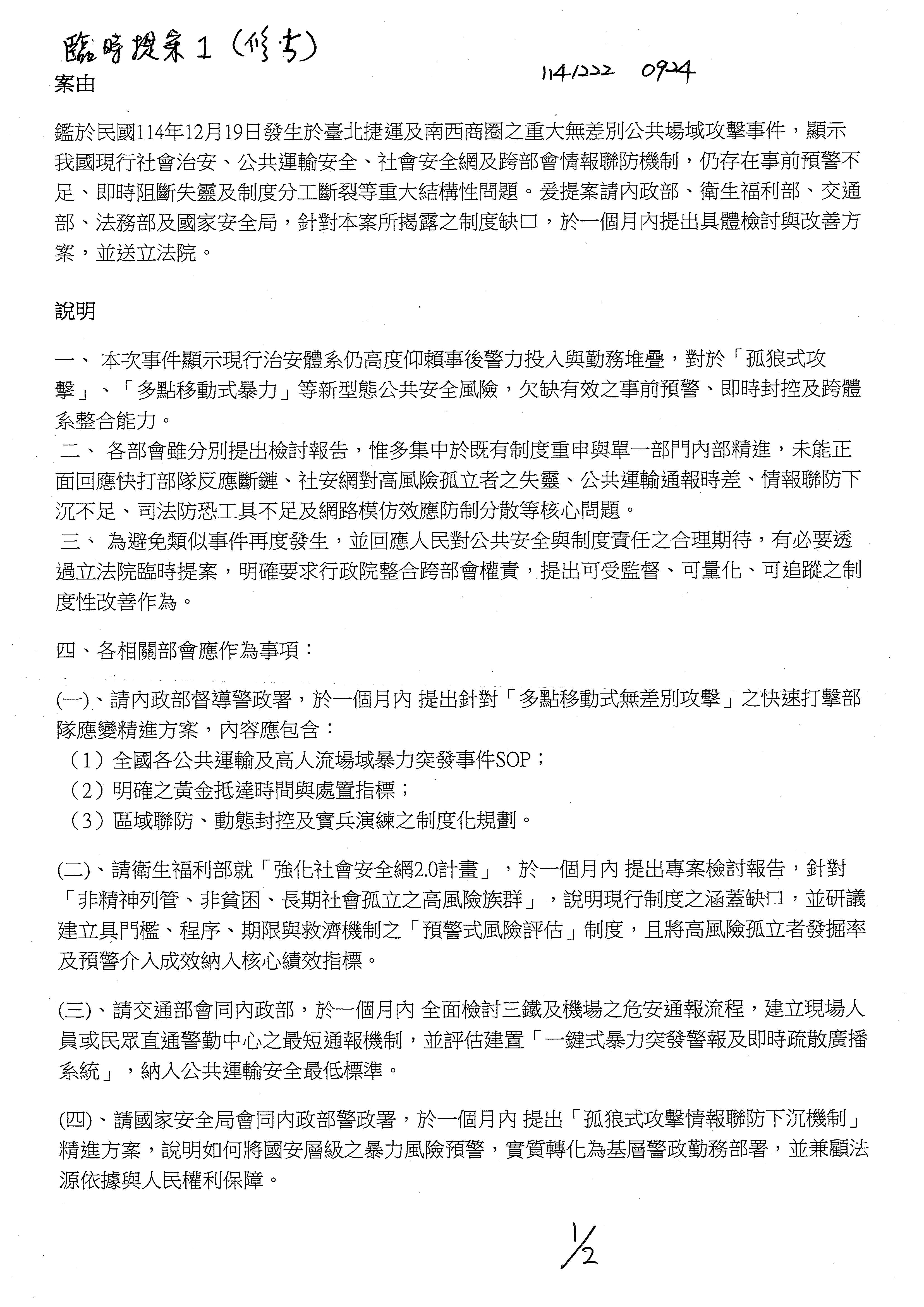 案由:針對民國114年12月19日台北捷運及南西商圈發生之重大無差別公共場域攻擊事件,各部會雖提出「社會治安維護之檢討與精進」相關書面報告,惟通觀內容,多屬既有勤務重申與事後補救措施,欠缺對「孤狼式、非列管、移動式攻擊」之制度性預警、跨部會即時阻斷與法制工具整備。