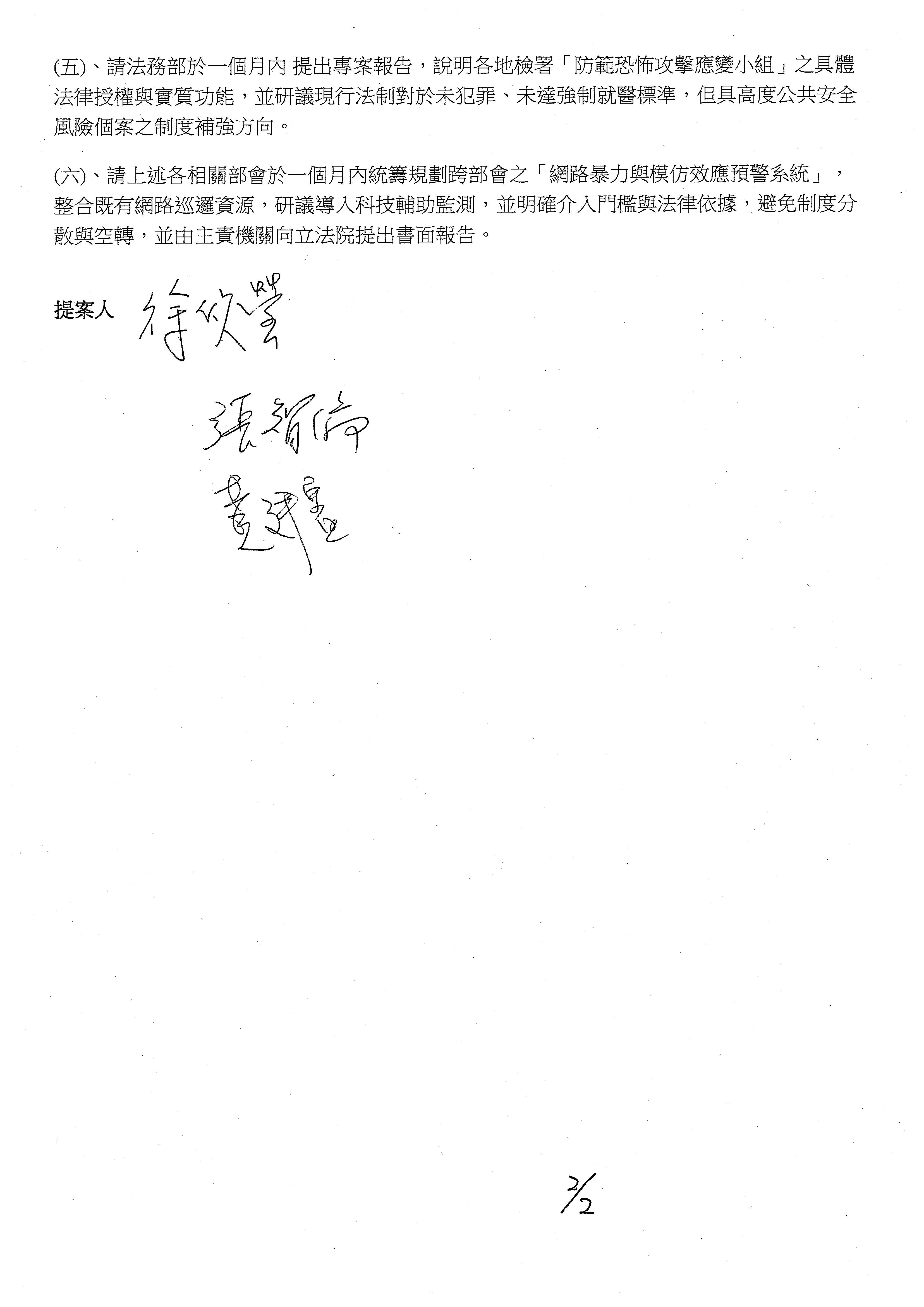 二、邀請內政部部長、衛生福利部部長、交通部部長、警政署署長、國家安全會議秘書長、國家安全局局長、法務部部長就計畫性攻擊事件進行「社會治安維護之檢討與精進」專題報告並備質詢。
