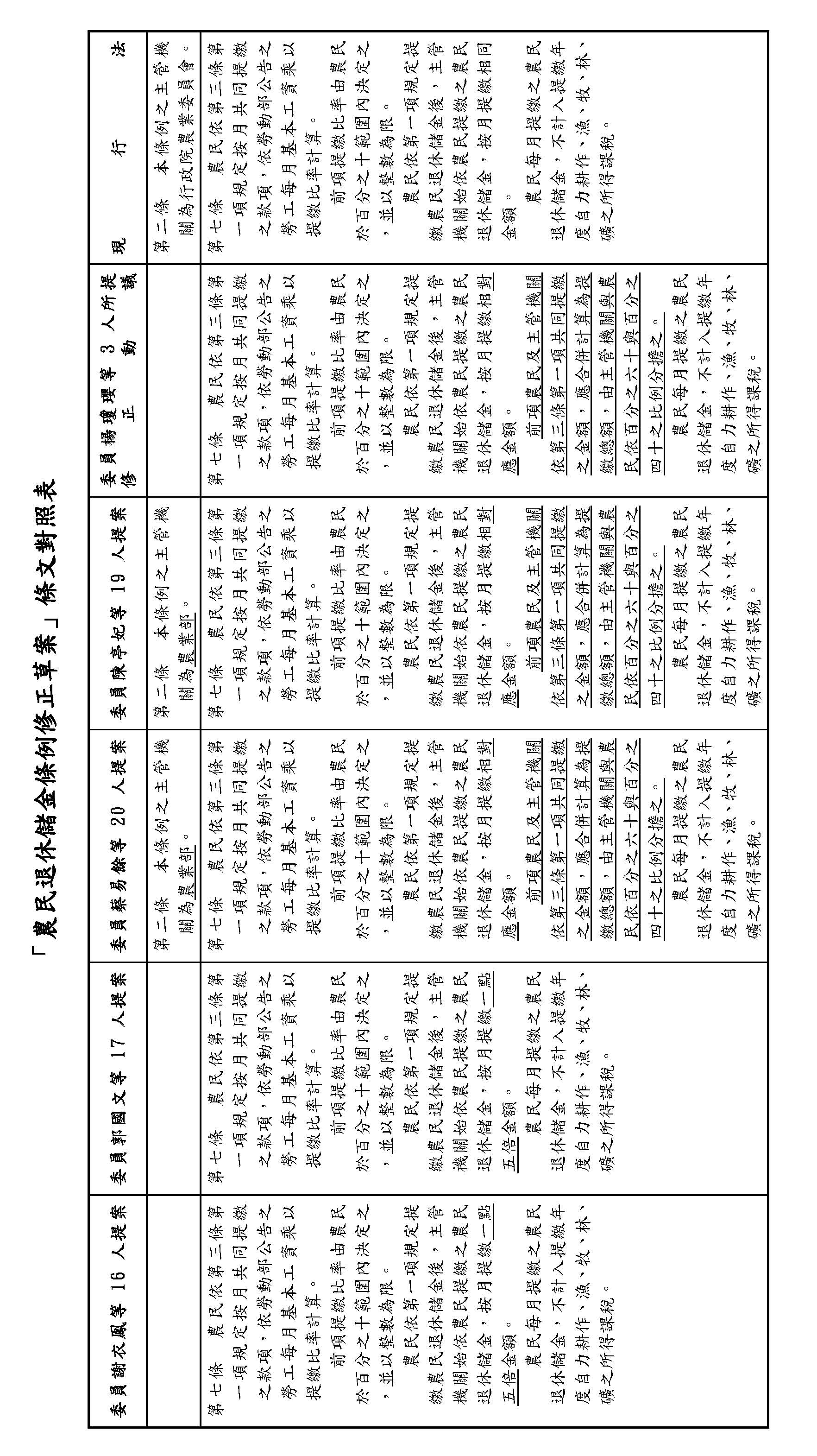 (四)本院委員陳亭妃等19人擬具「農民退休儲金條例第二條及第七條條文修正草案」案。
