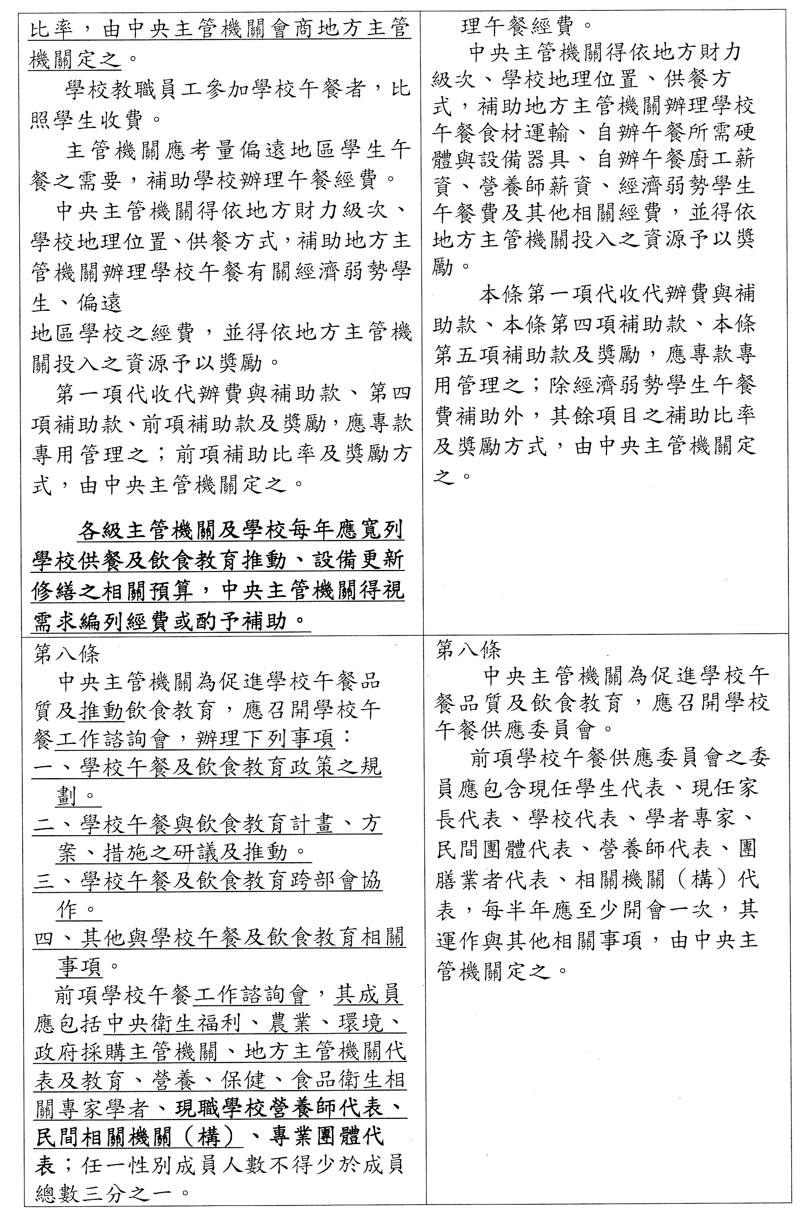 現在審查「學校午餐及飲食教育條例草案」相關草案,進行逐條審查,請議事人員宣讀新增提案條文內容,並進行討論與協商。討論時,如有新增修正動議,請議事人員一併宣讀。