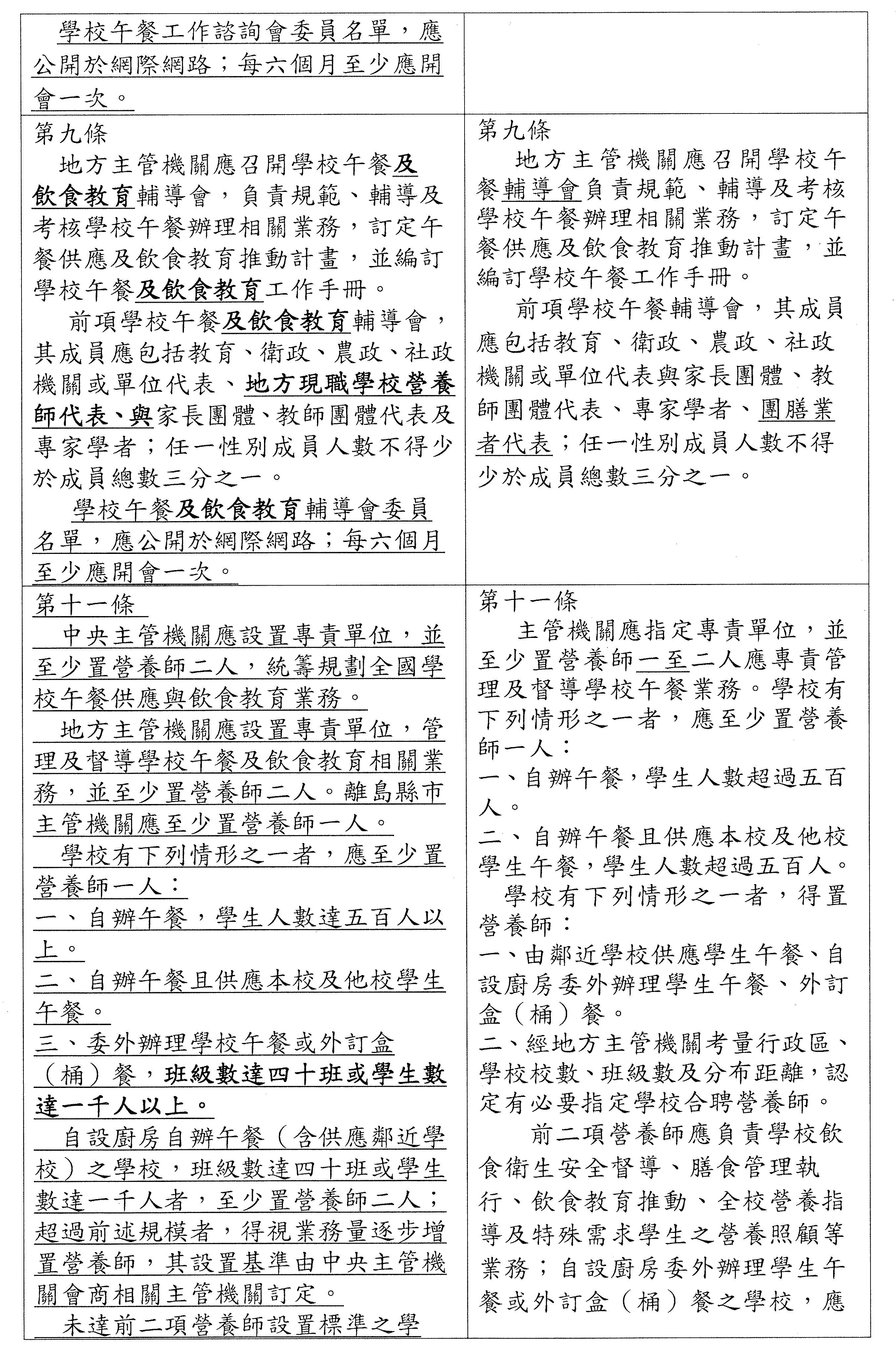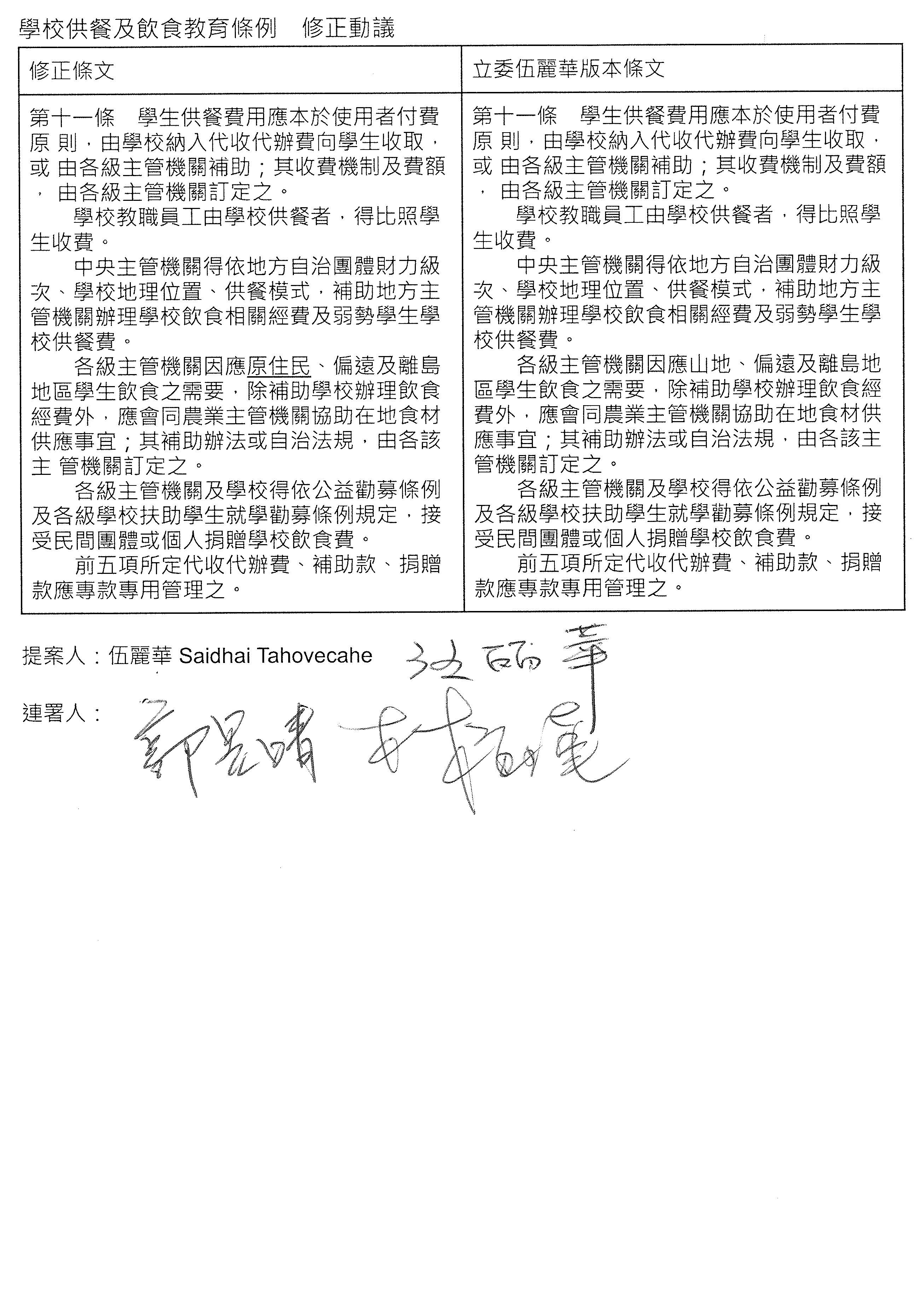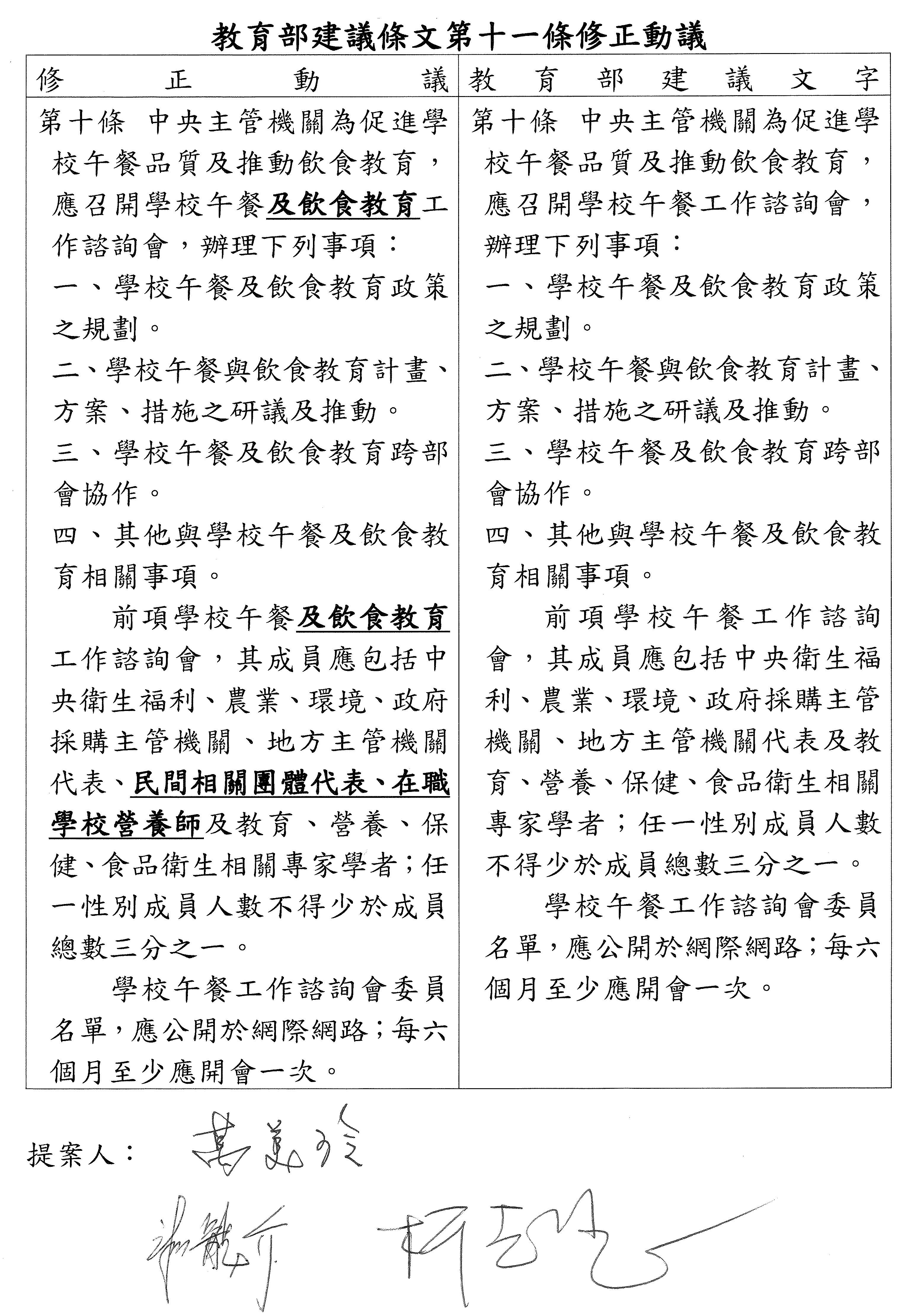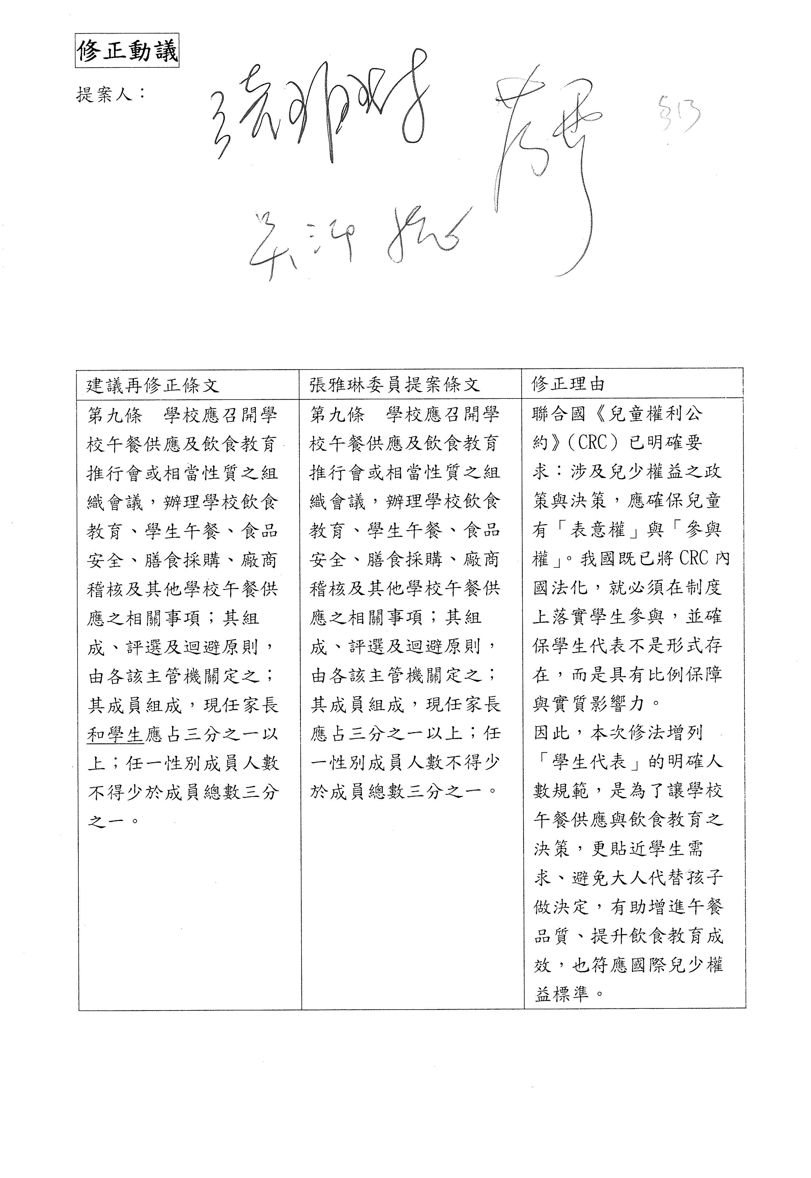 主席:先等一下,我先卸除一下主席的位置,我也是委員之一,所以我也可以發言。我現在就回答一下,剛才范雲委員提到本黨提案500人以上至少設置一名的部分,按照教育部版,自辦午餐是學生550人以上,所以以一個學校來講的話,差額就是50人,以目前學校的規模來講,我提出來的版本可能是合理的,其實這和部版的差異也沒有太多,我的意思是說……