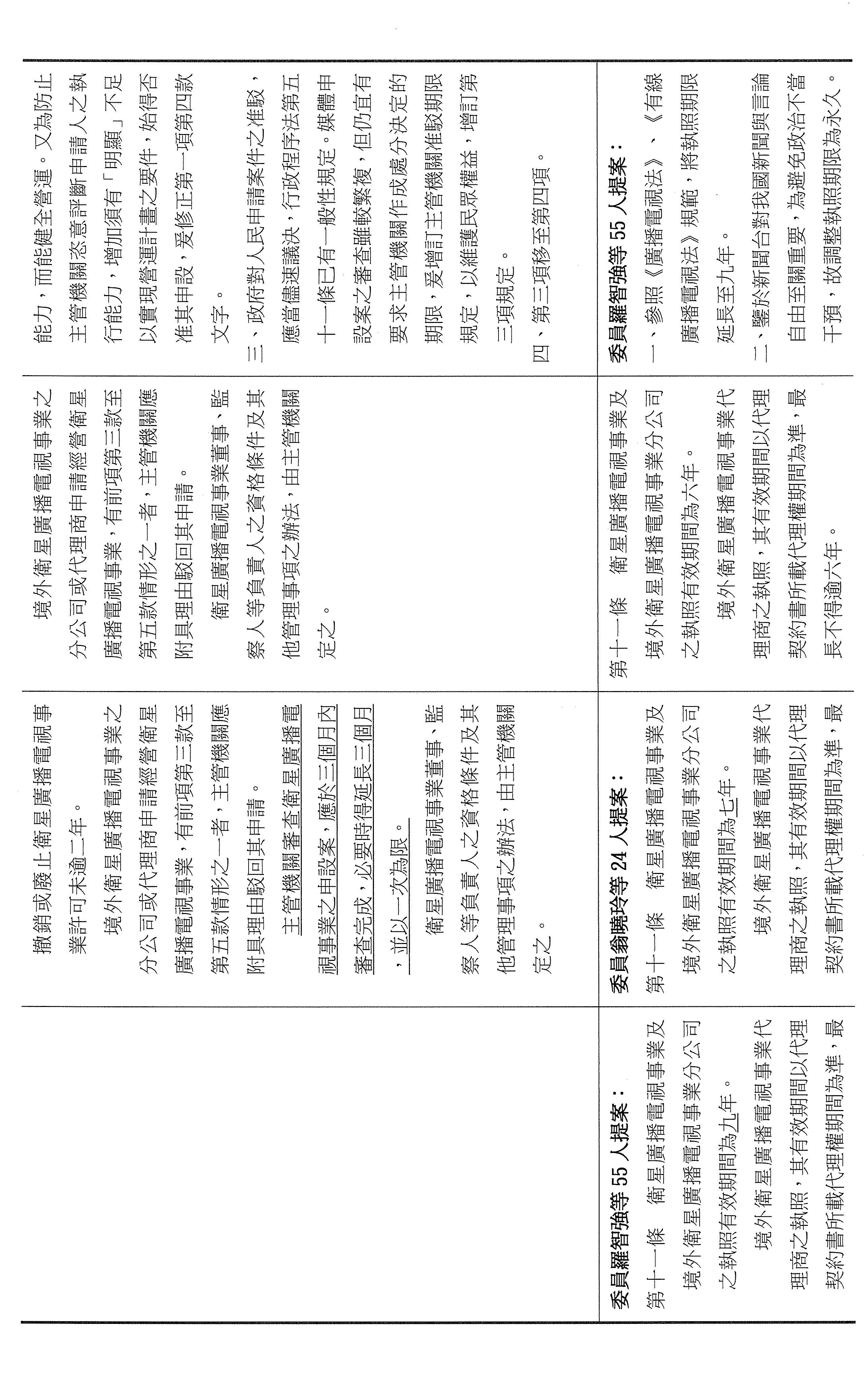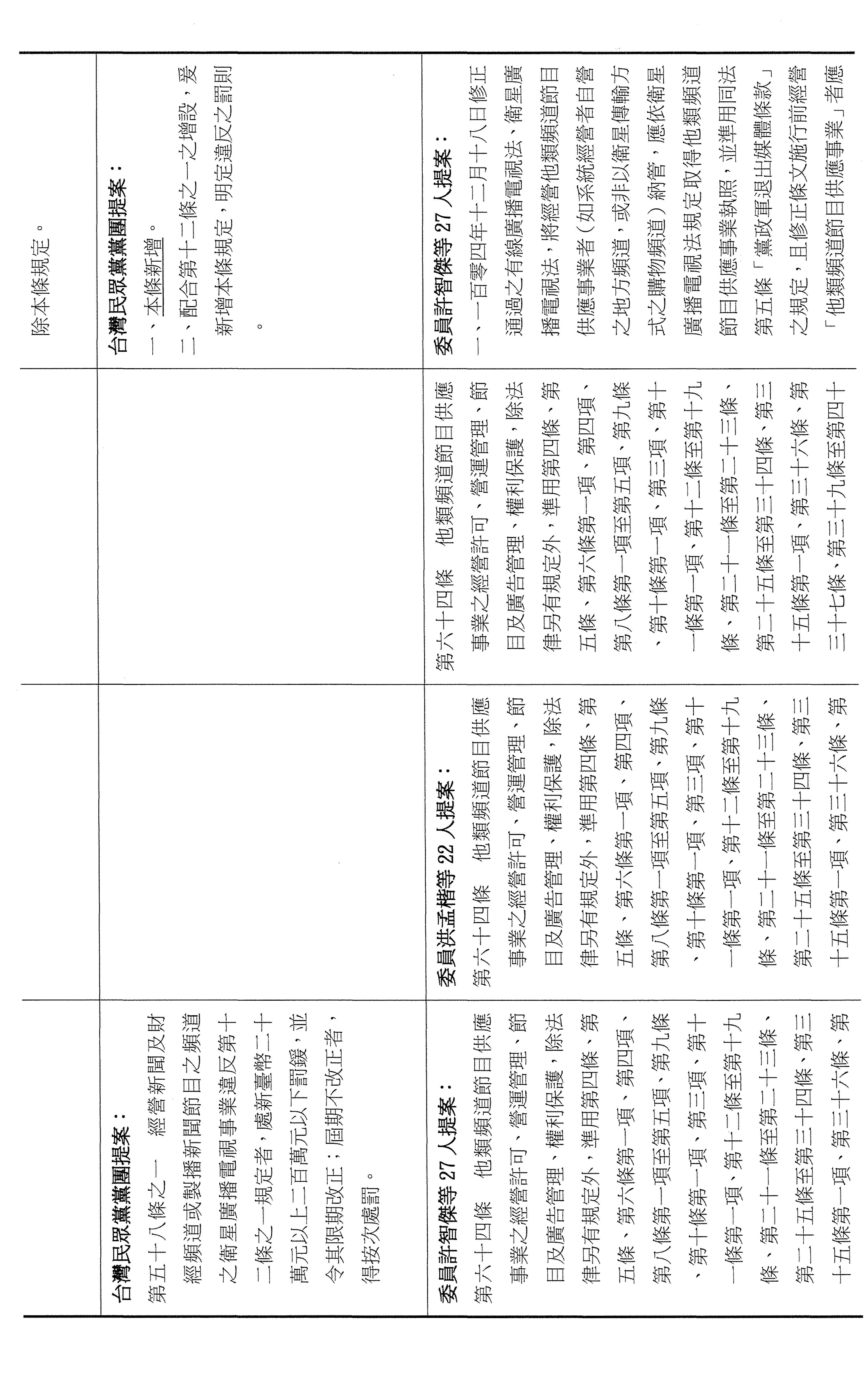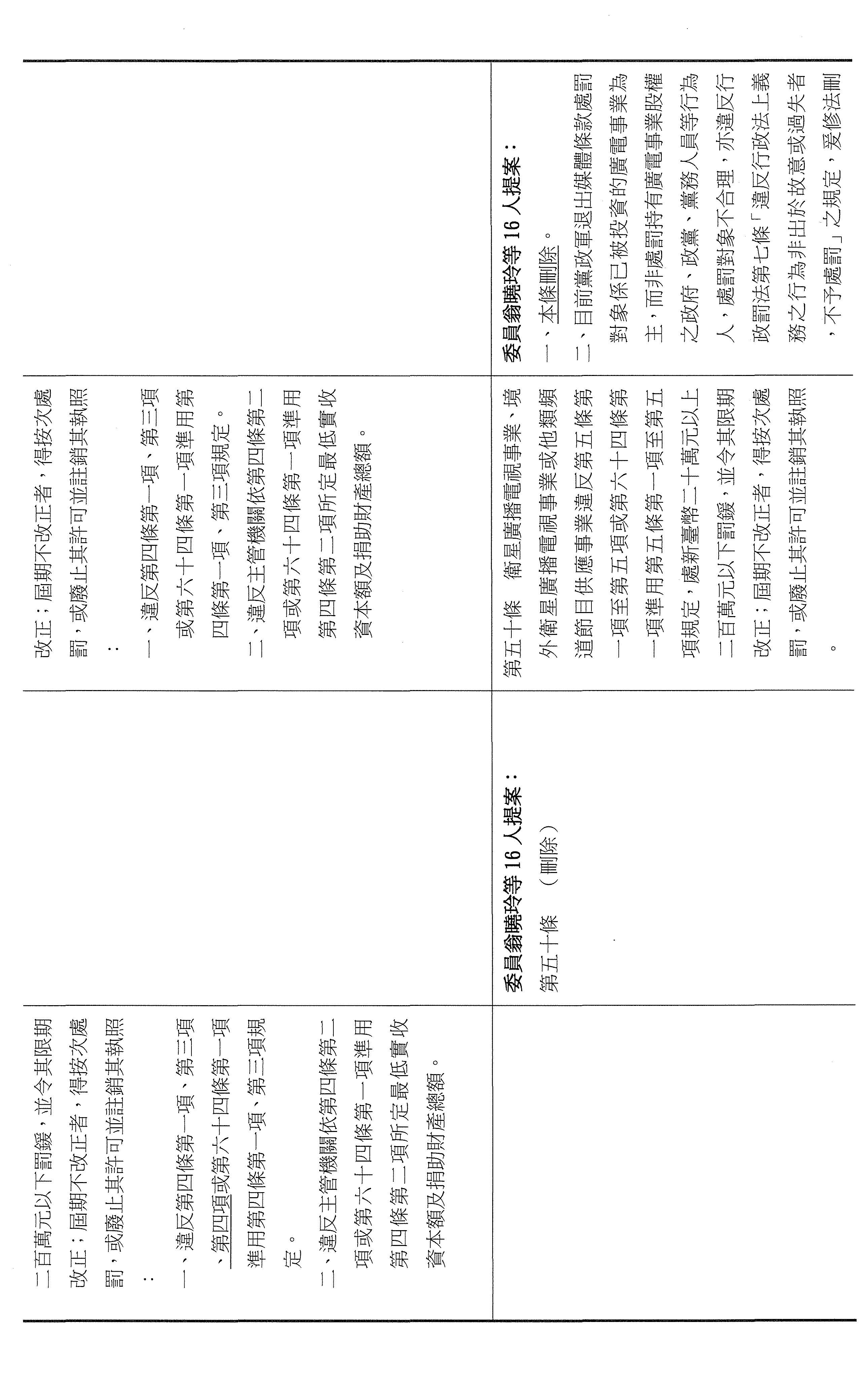 翁委員曉玲:我要表達一下我的看法,第五十條為什麼本席當時提出要刪除處罰衛星電視臺的規定?因為第五十條違反黨政軍條款,違反投資的並不是衛星電視業者,不是這些電視臺業者,可是在我們的法律當中,我們長期以來就是有這樣一個錯誤的處罰,結果你罰不到那個投資行為人,卻一直去處罰被投資者,這是極不公平的事情,而且在過去,長期我們的行政法院都是撤銷NCC所做的處罰處分,認為衛星電視臺它既沒有故意,也沒有過失,它是很無奈、很無辜被人家直接或間接投資,所以刪除處罰的規定,等於是一方面幫NCC解套,二方面也是幫這些業者給他們回復正義。至於那個行為人要怎麼去處罰,NCC要提出版本啊,你們向來都沒有提案,也都沒有積極地去處理那個投資行為人,這是行政怠惰,就是你們不處理、處罰投資行為人,然後卻說今天我們如果把處罰電視臺業者的條文刪除,這是一個不公平,這有什麼不公平?