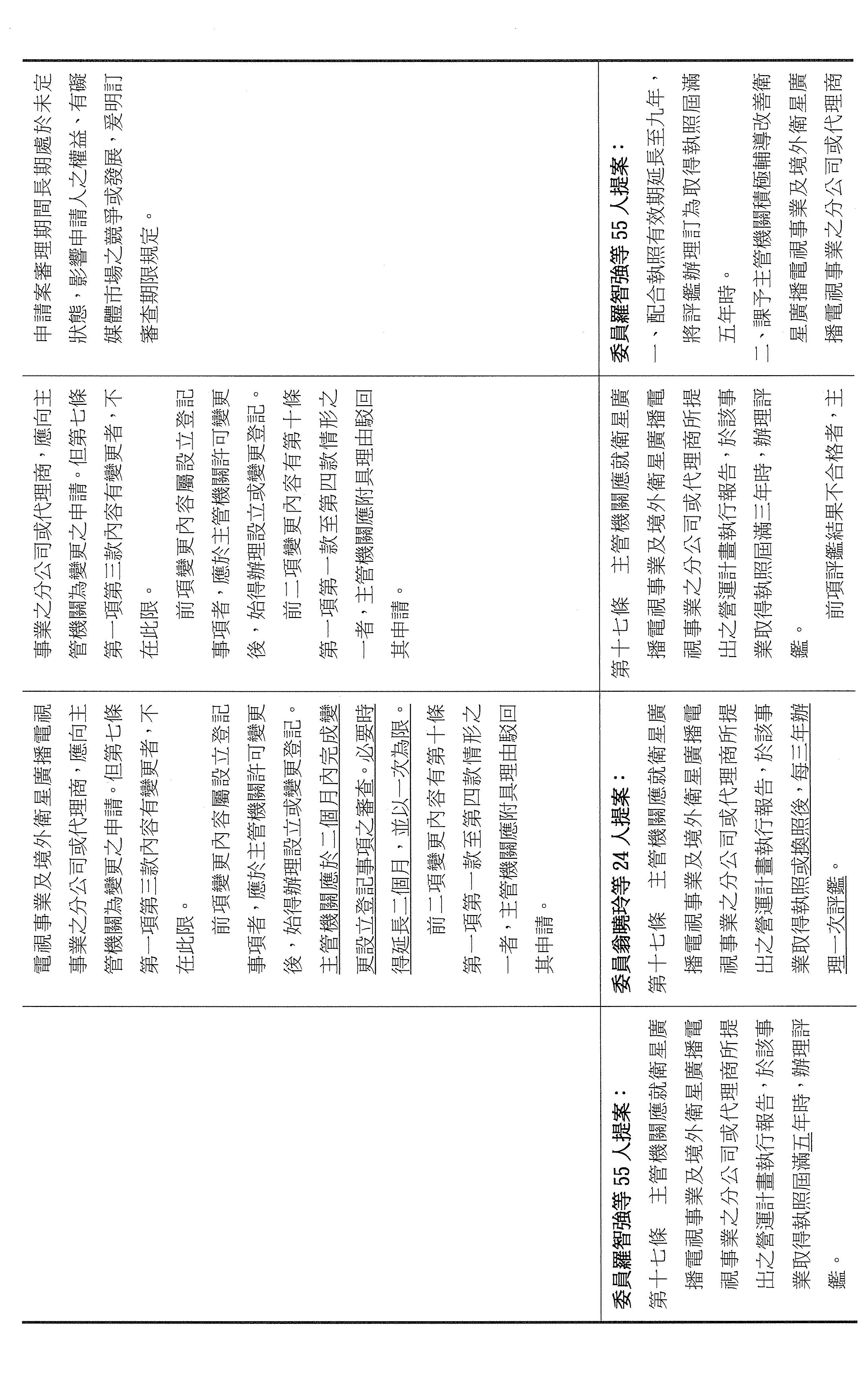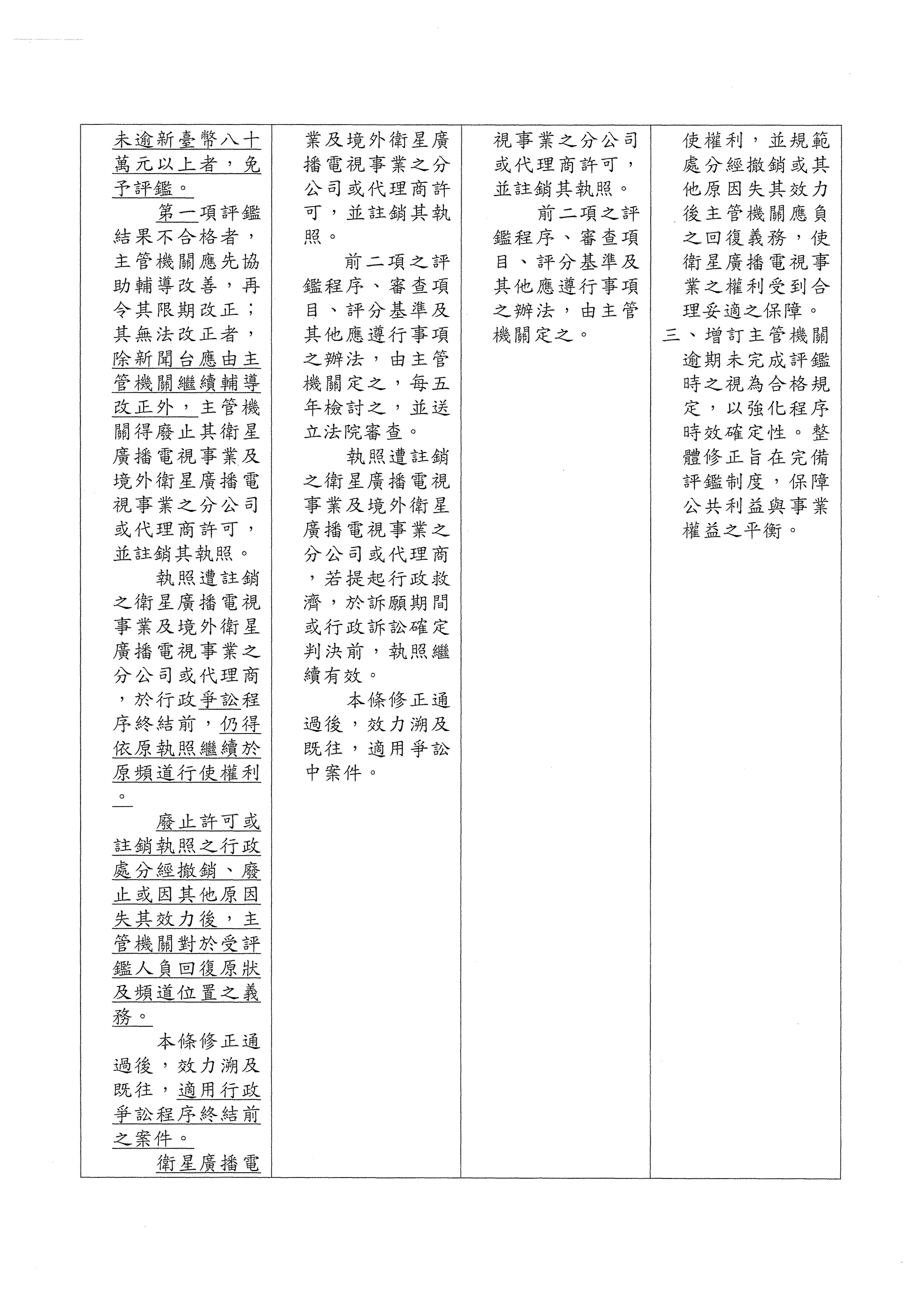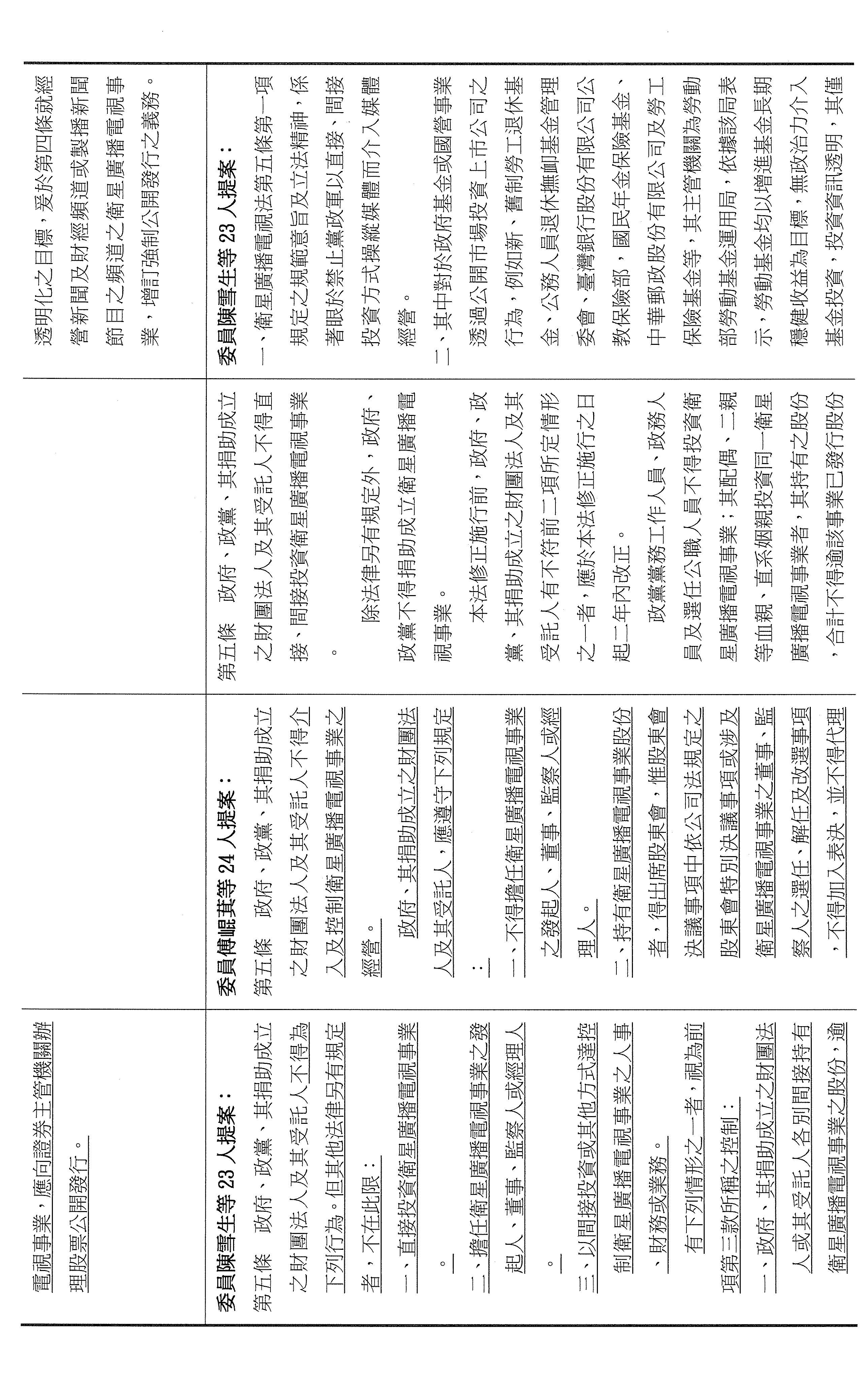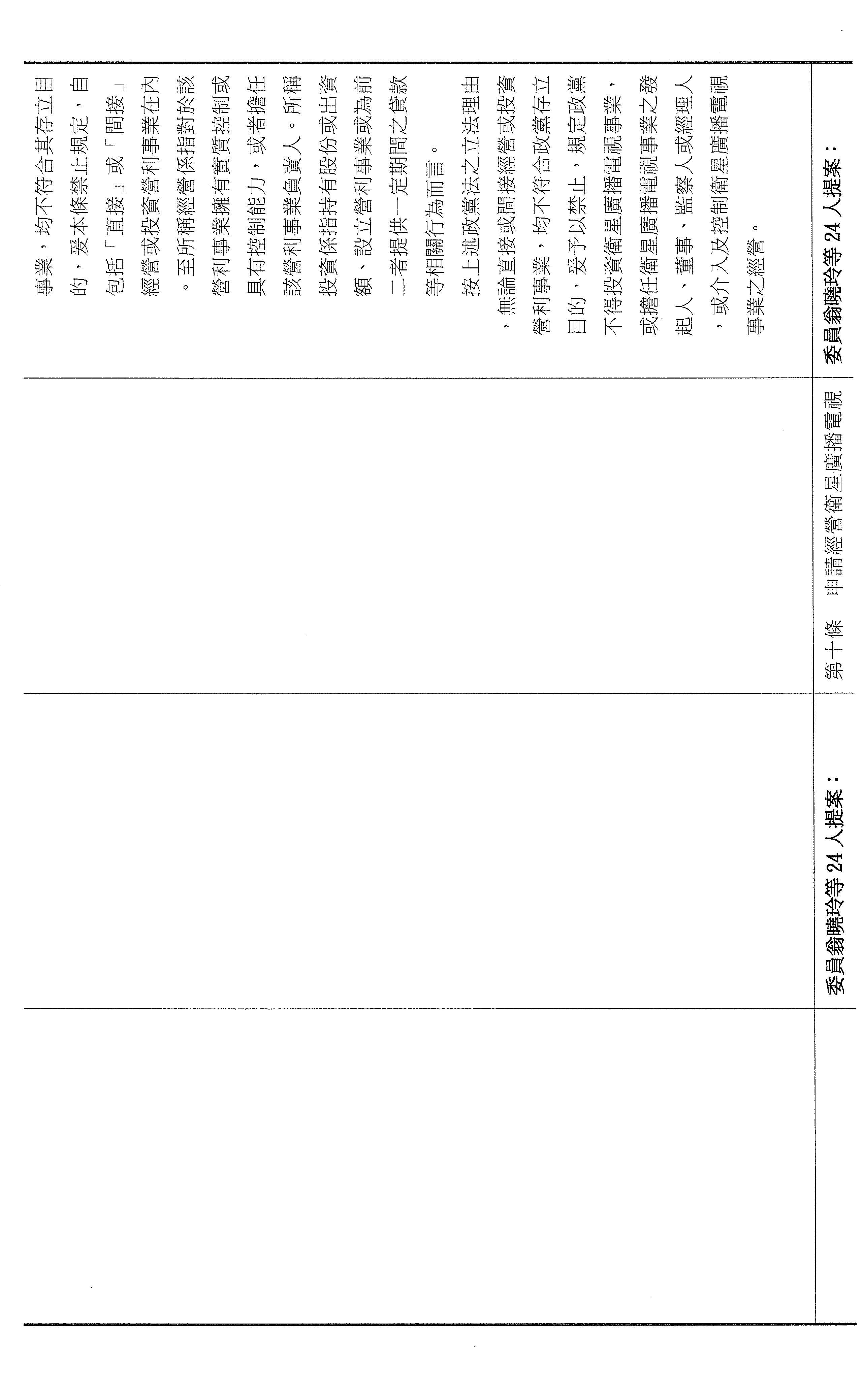 翁委員曉玲:我要表達一下我的看法,第五十條為什麼本席當時提出要刪除處罰衛星電視臺的規定?因為第五十條違反黨政軍條款,違反投資的並不是衛星電視業者,不是這些電視臺業者,可是在我們的法律當中,我們長期以來就是有這樣一個錯誤的處罰,結果你罰不到那個投資行為人,卻一直去處罰被投資者,這是極不公平的事情,而且在過去,長期我們的行政法院都是撤銷NCC所做的處罰處分,認為衛星電視臺它既沒有故意,也沒有過失,它是很無奈、很無辜被人家直接或間接投資,所以刪除處罰的規定,等於是一方面幫NCC解套,二方面也是幫這些業者給他們回復正義。至於那個行為人要怎麼去處罰,NCC要提出版本啊,你們向來都沒有提案,也都沒有積極地去處理那個投資行為人,這是行政怠惰,就是你們不處理、處罰投資行為人,然後卻說今天我們如果把處罰電視臺業者的條文刪除,這是一個不公平,這有什麼不公平?